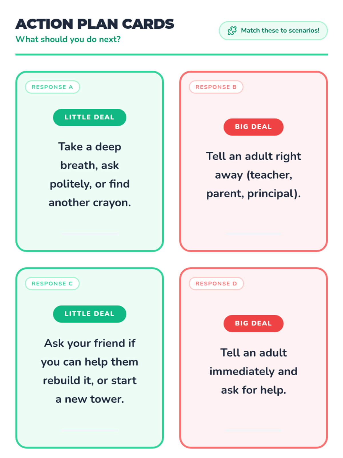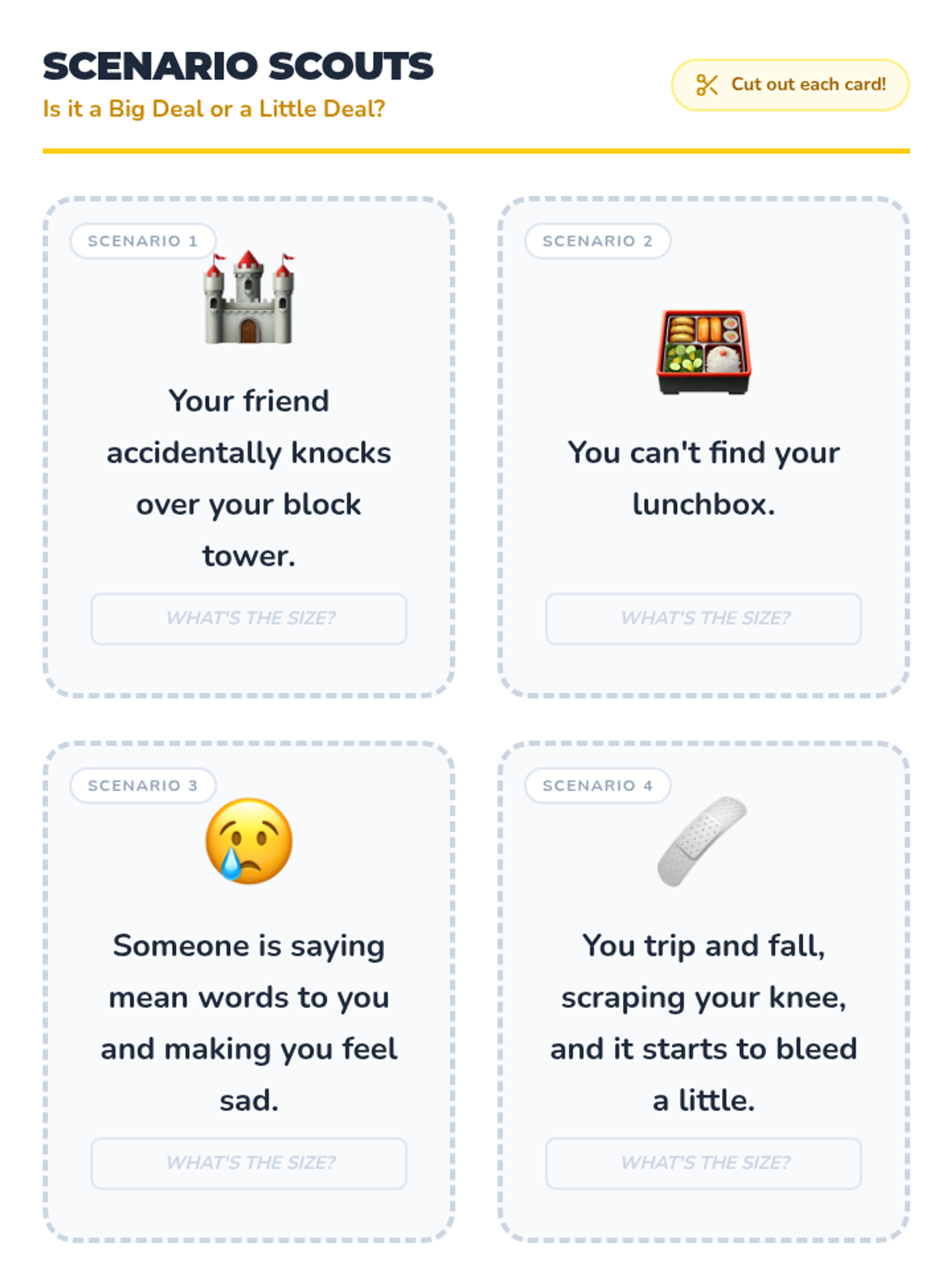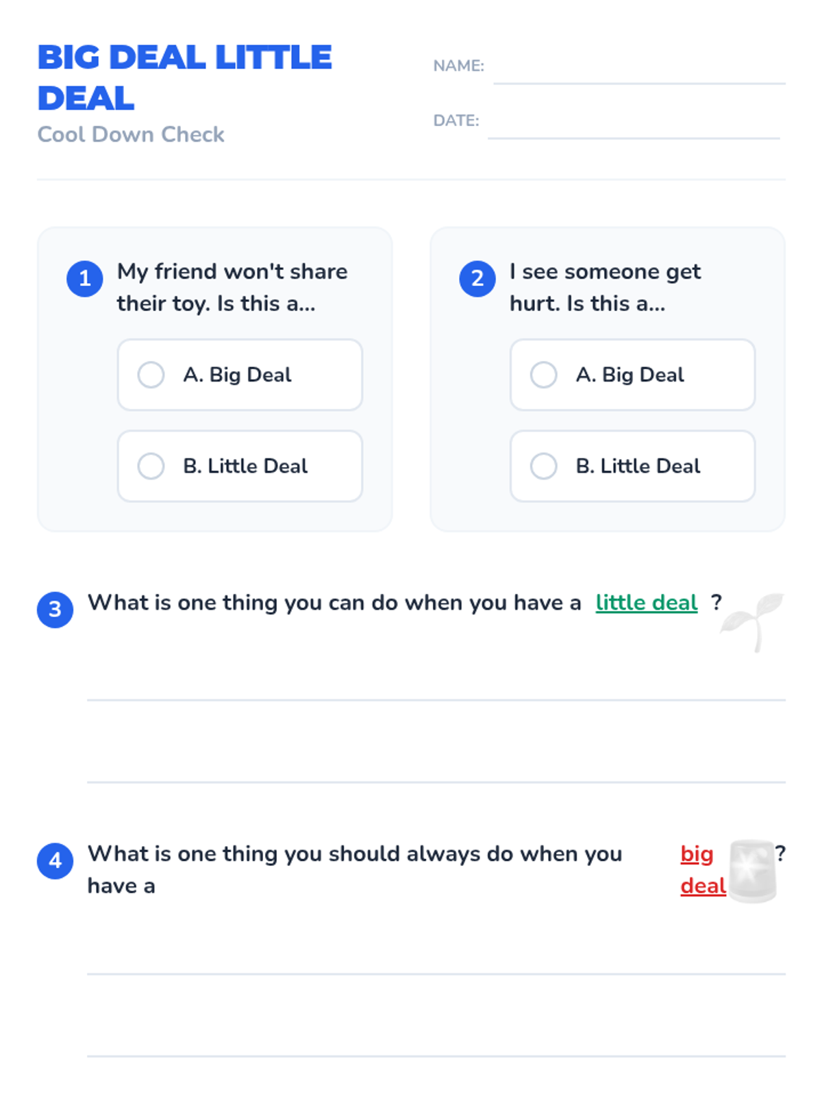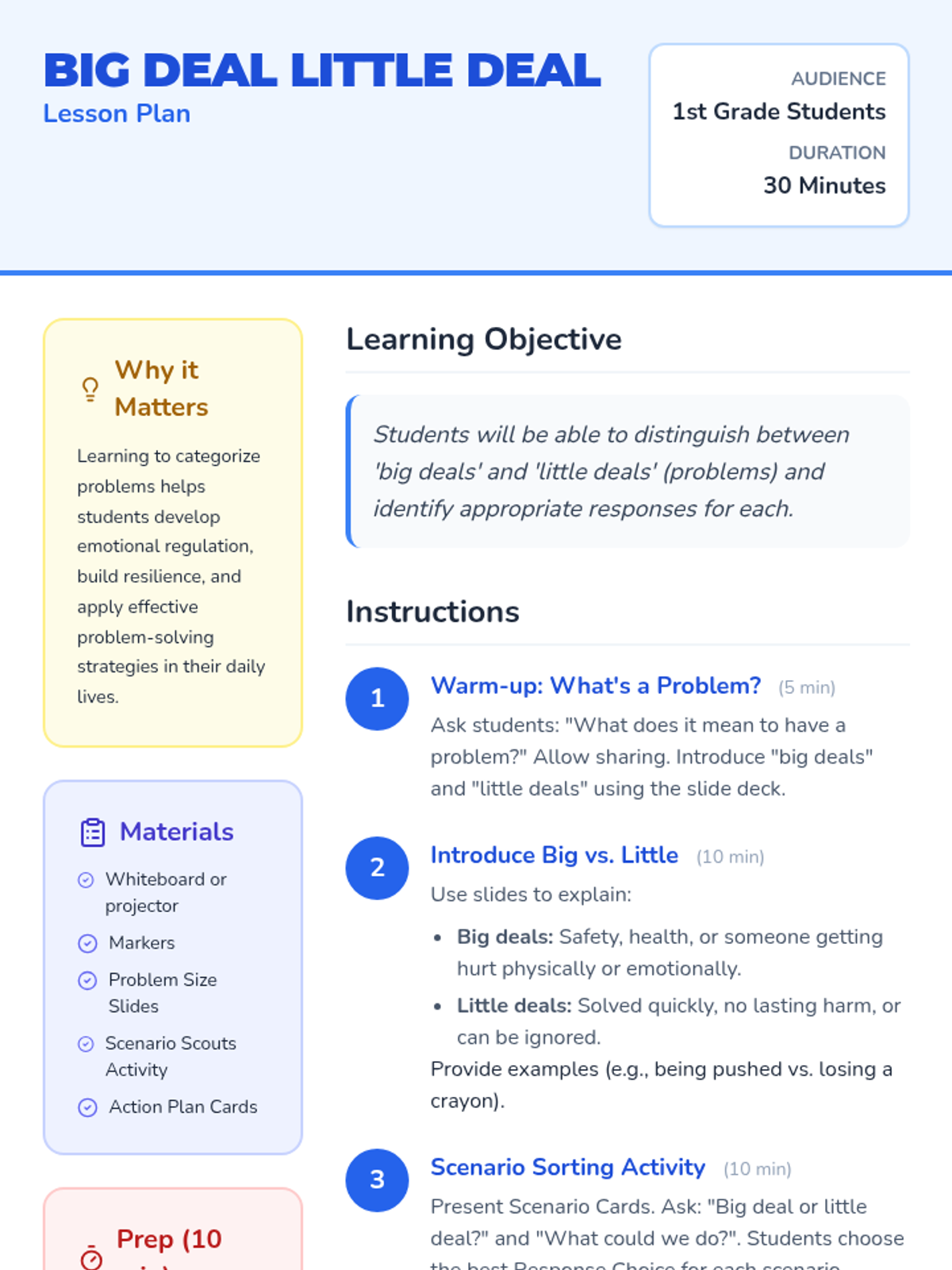 This lesson helps 1st-grade students identify and categorize problems as 'big deals' or 'little deals' to develop emotional regulation and problem-solving skills.