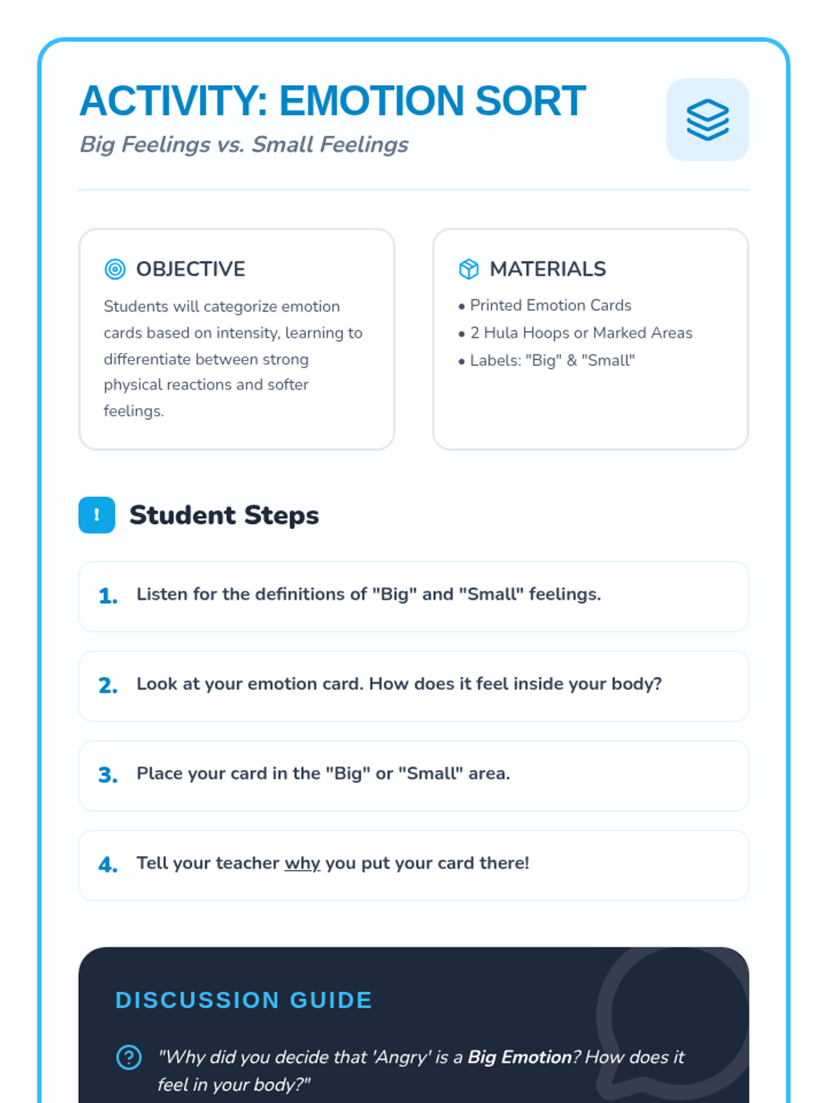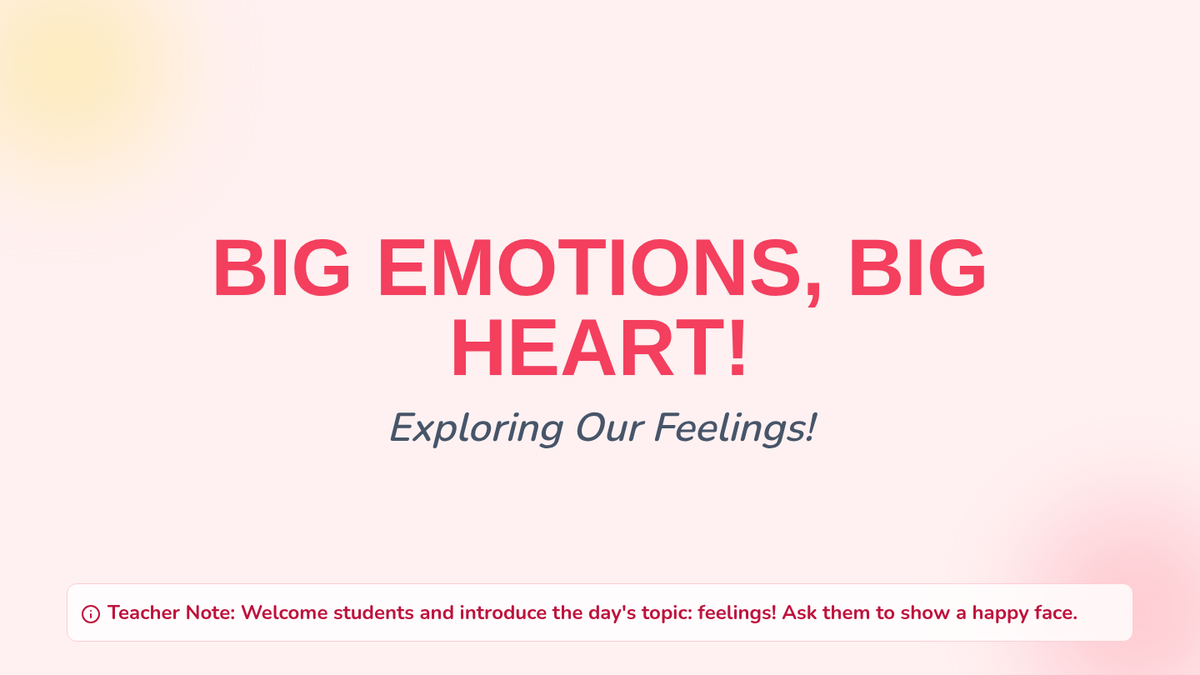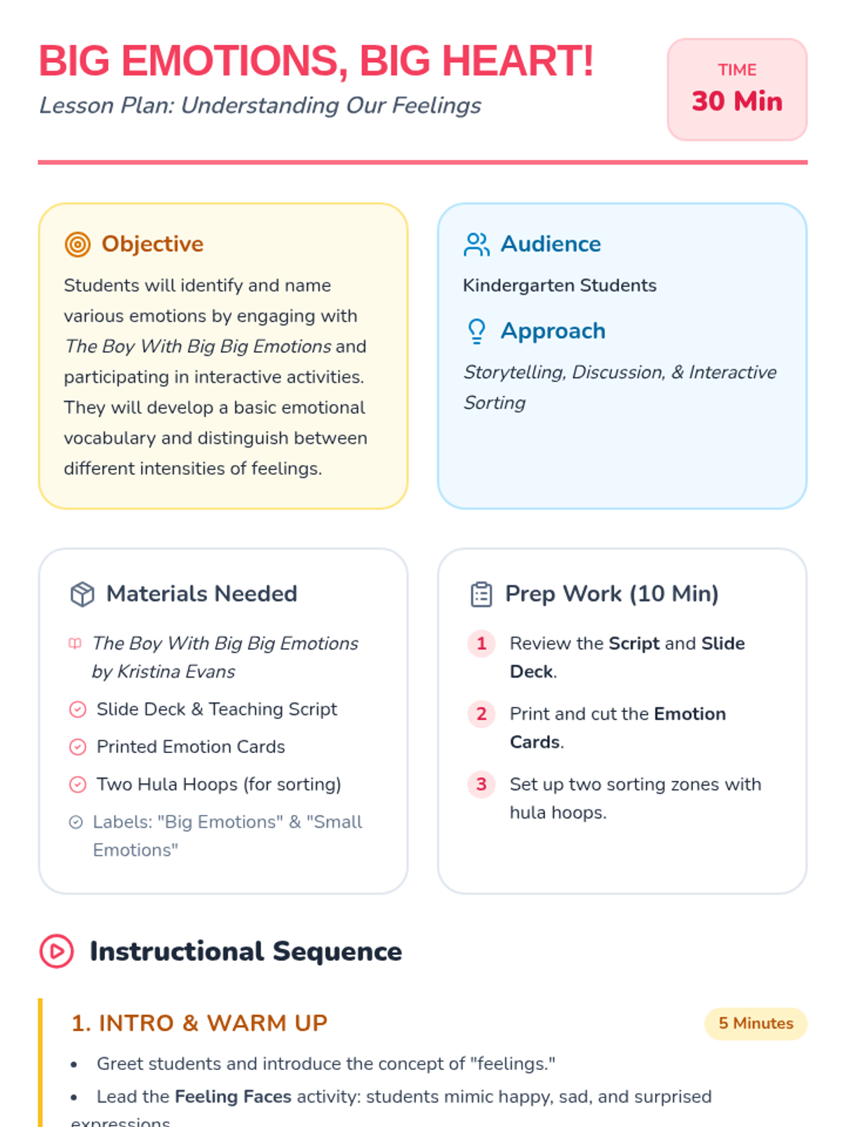 A 30-minute social-emotional learning lesson for Kindergarteners focused on identifying and understanding emotions through the book 'The Boy With Big Big Emotions.' Students will develop emotional vocabulary and learn to distinguish between 'big' and 'small' feelings.