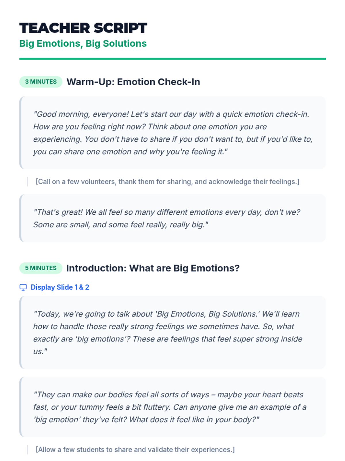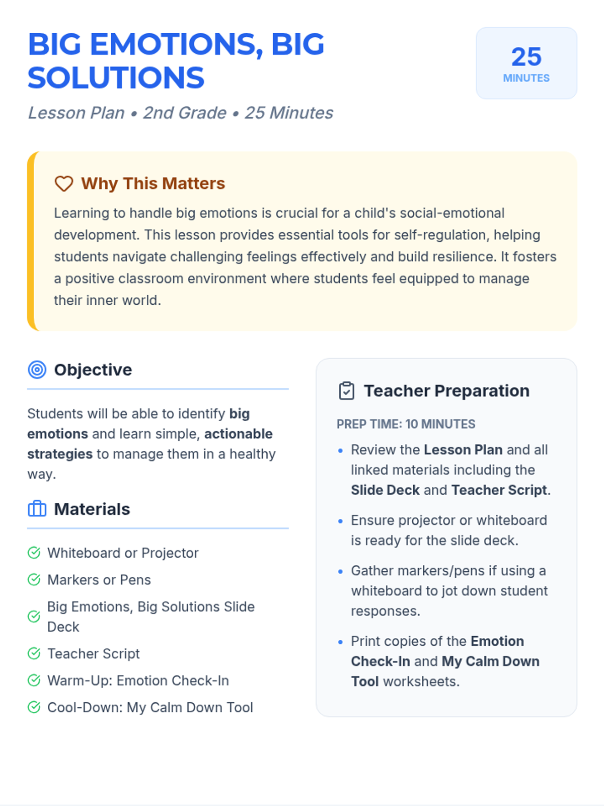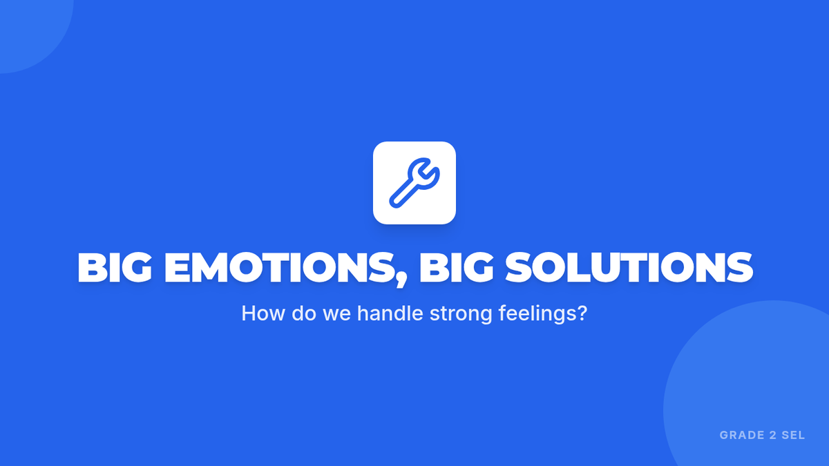 A 25-minute social-emotional learning lesson for 2nd graders to help them identify big emotions and practice simple, actionable calm-down strategies like deep breathing and counting.