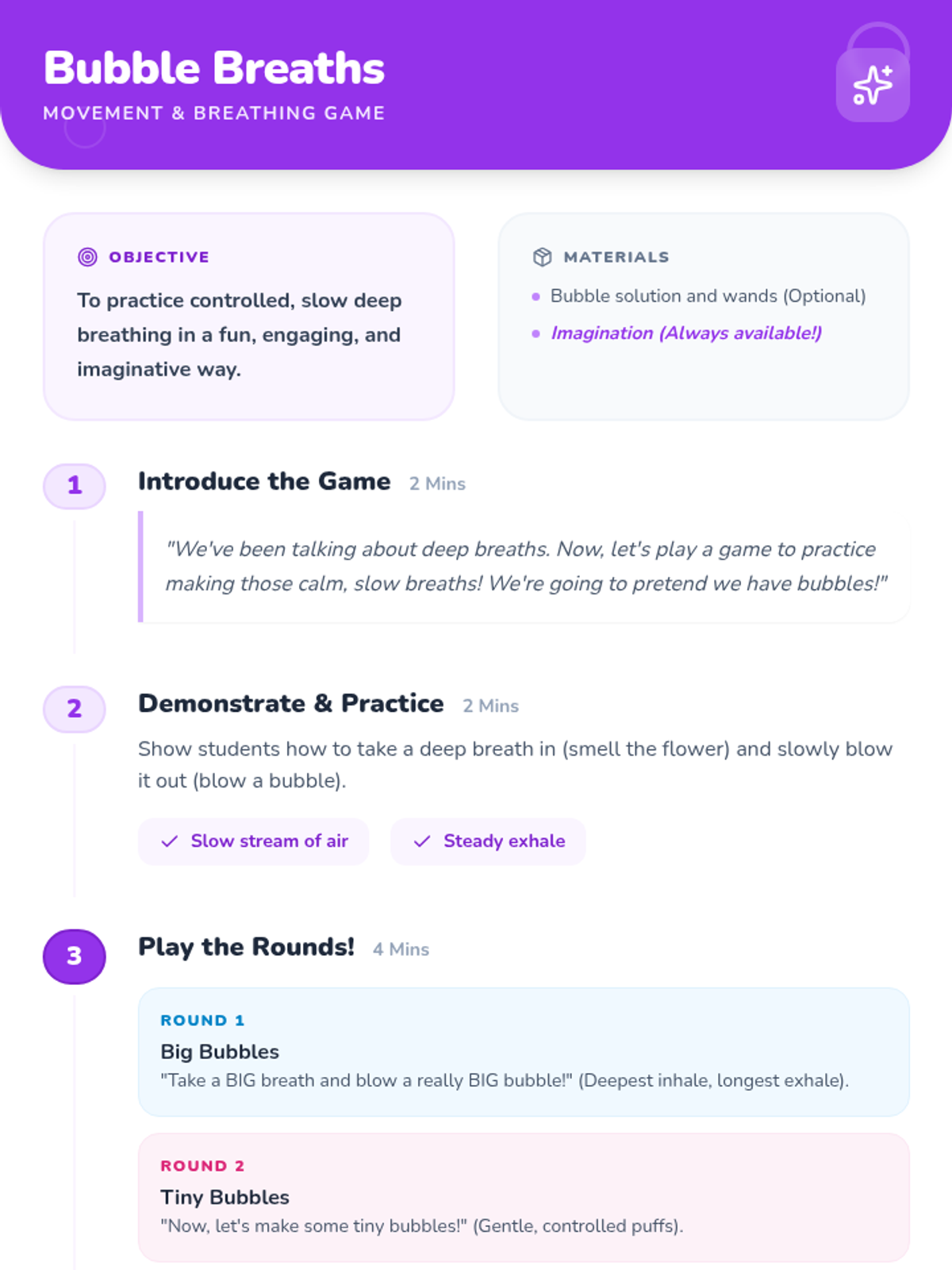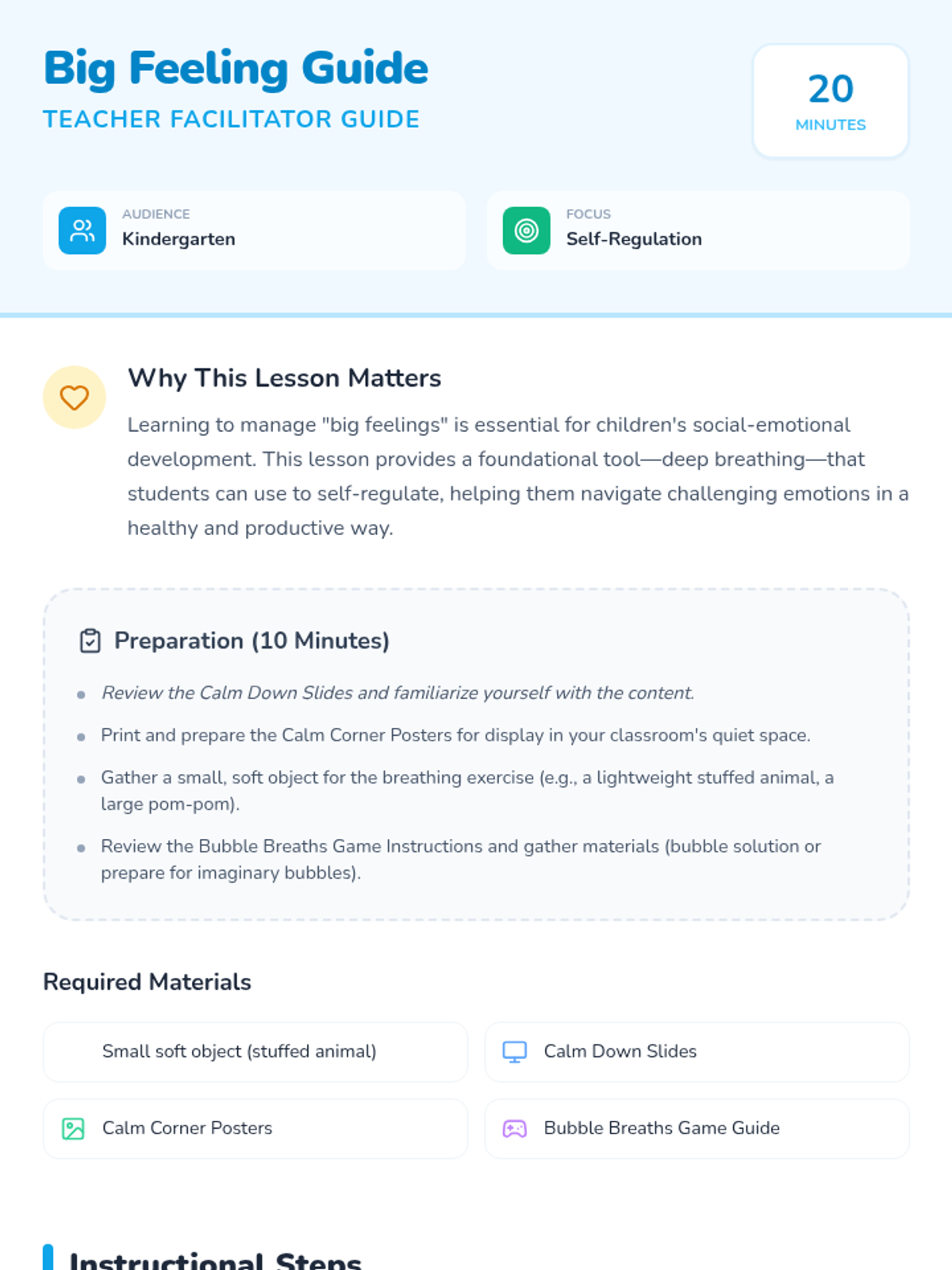 This interactive Kindergarten lesson introduces students to 'big feelings' and teaches deep breathing as a fundamental self-regulation strategy. Students engage with visuals, a guided slide presentation, and a playful bubble-themed game to practice their new calming skills.