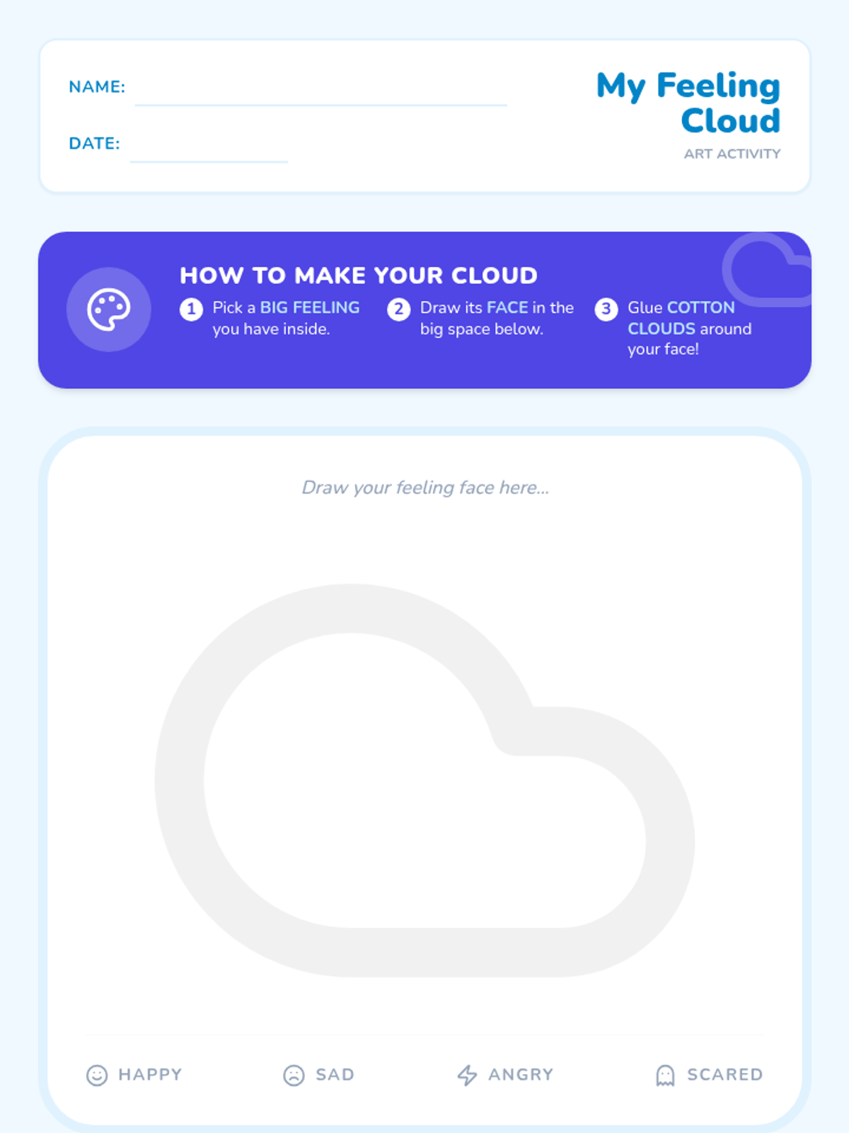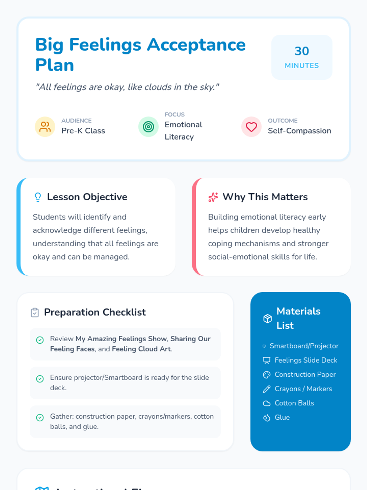 A Pre-K lesson focused on identifying, accepting, and managing 'big feelings' through a cloud metaphor, building emotional literacy and self-compassion.