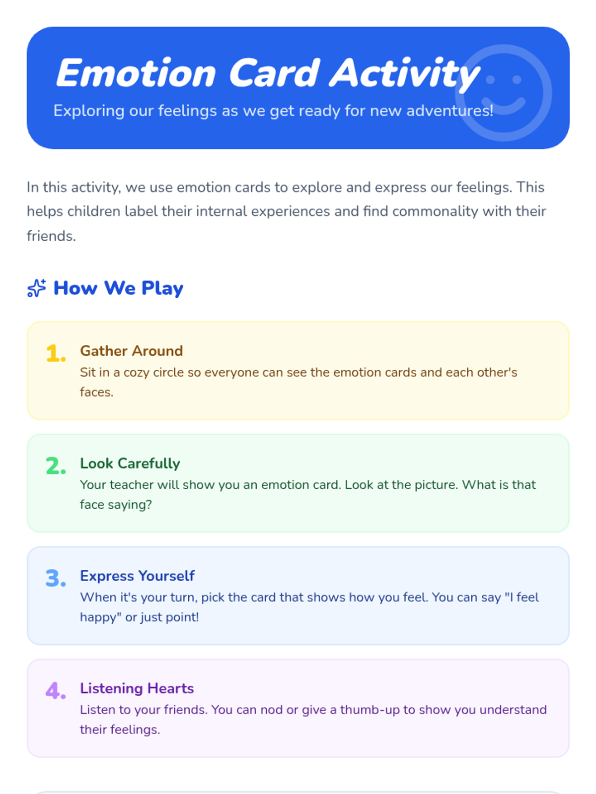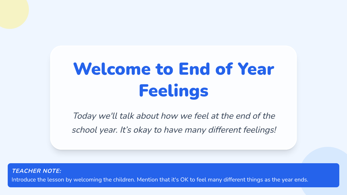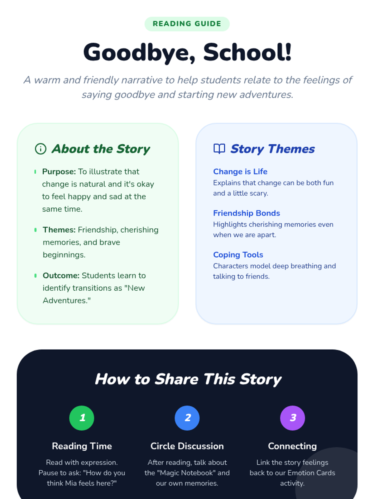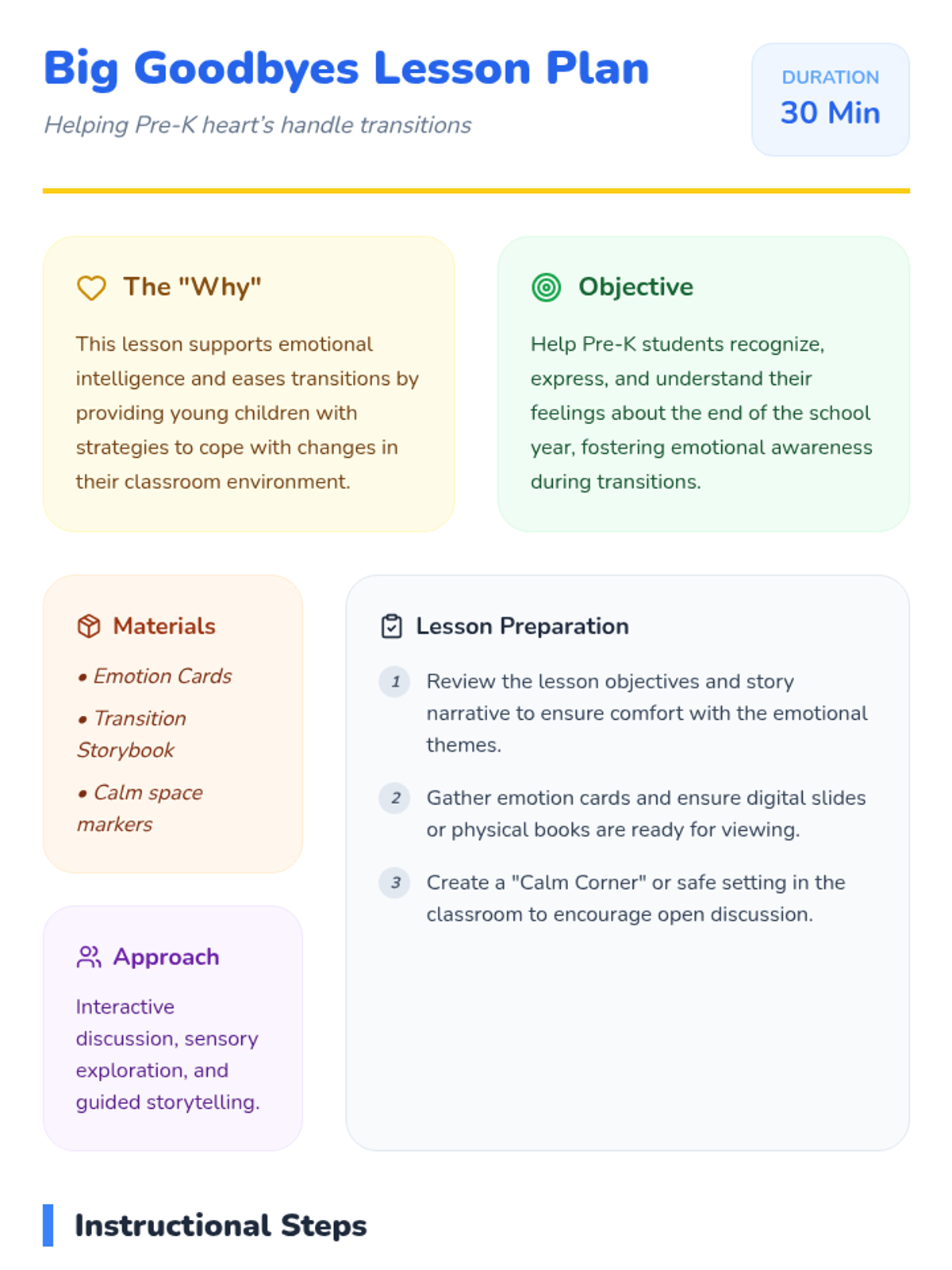 A gentle Pre-K lesson designed to help young students navigate the complex emotions of school year transitions through storytelling, emotion cards, and coping strategies.