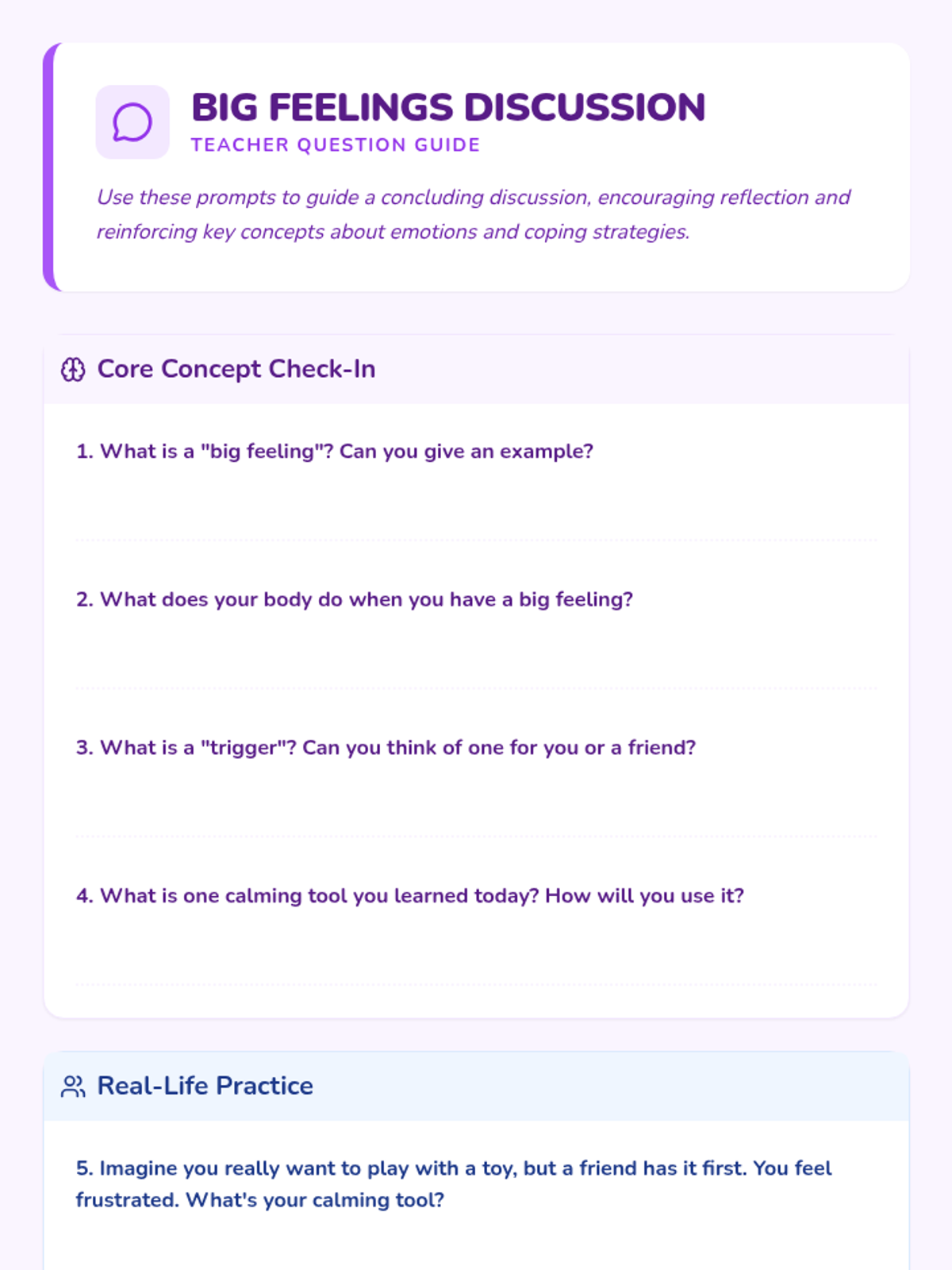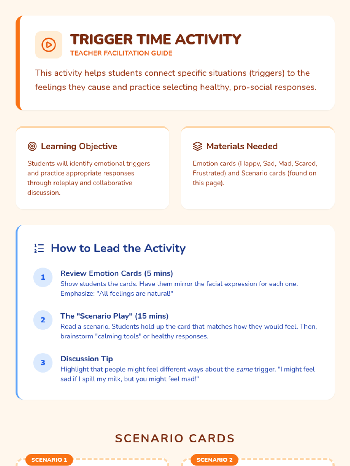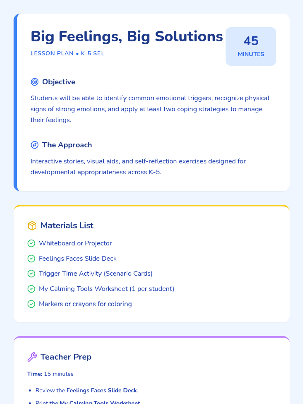This lesson helps K-5 students identify common 'triggers' that lead to strong emotions and develop effective coping strategies. Through interactive stories, visual aids, and self-reflection, students will learn to recognize early signs of big feelings, understand their body's signals, and practice healthy ways to respond, fostering greater emotional intelligence and self-regulation.