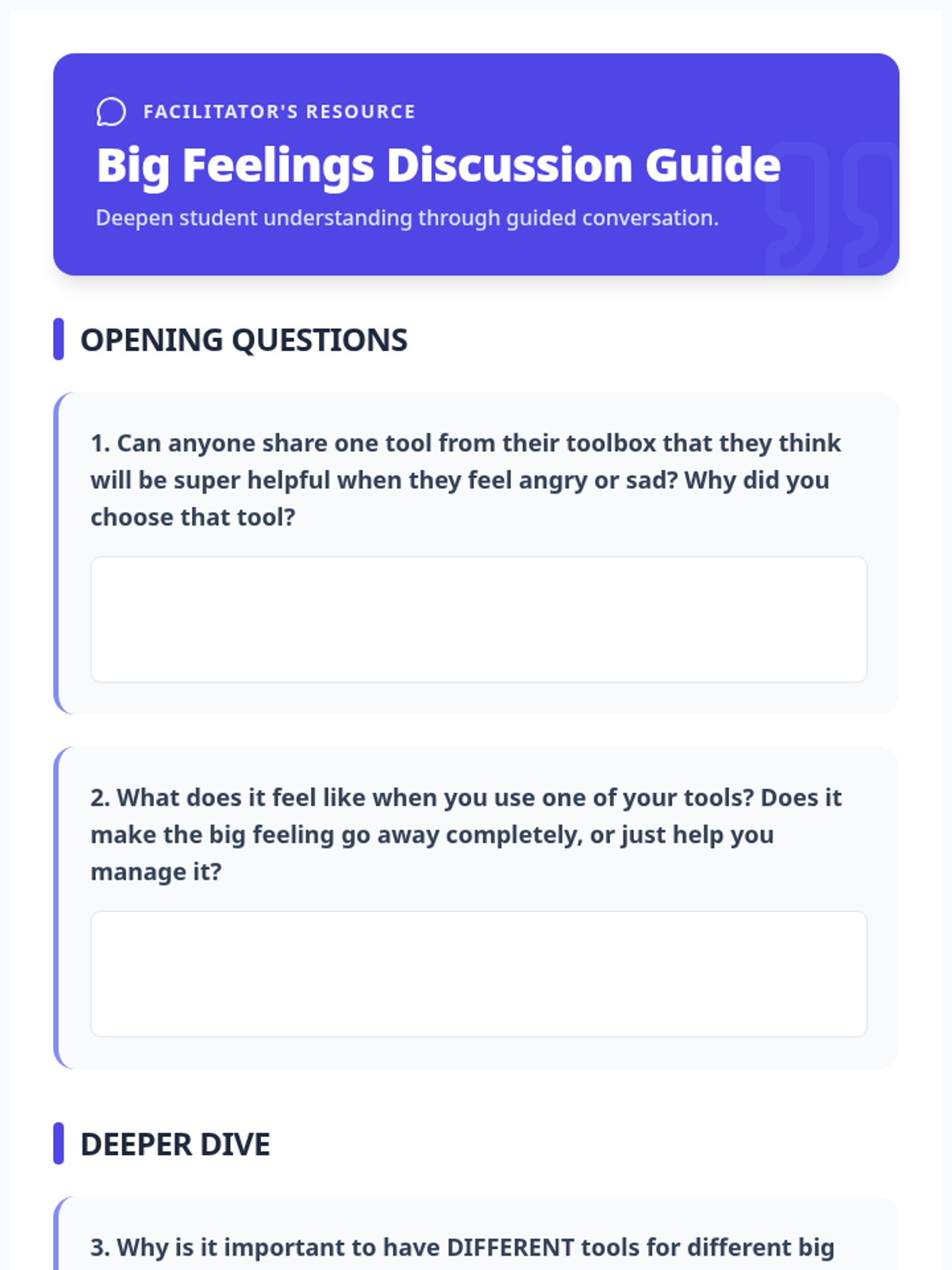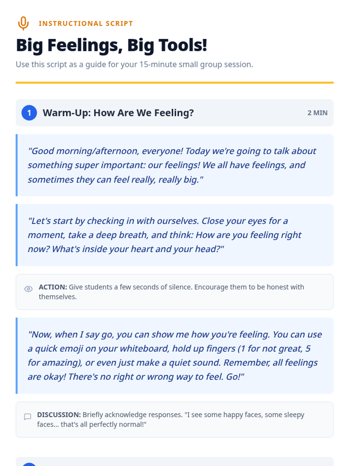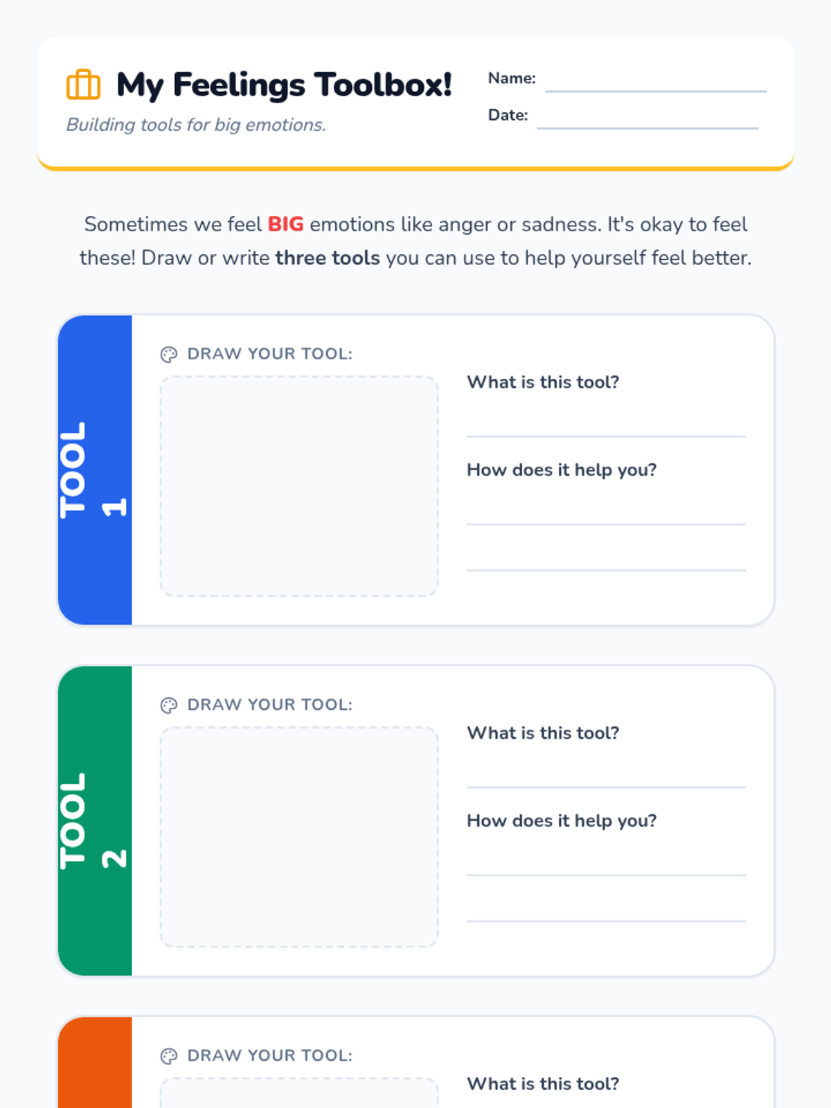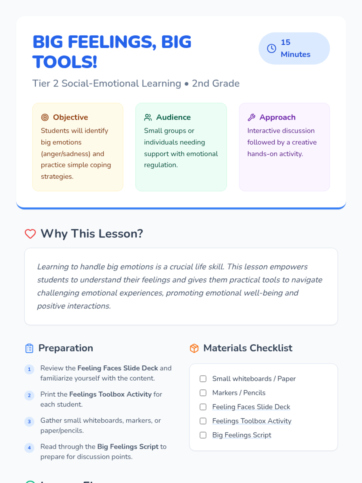 This 15-minute Tier 2 lesson for 2nd-grade students teaches practical strategies for identifying and managing big emotions like anger and sadness using a 'feelings toolkit'.