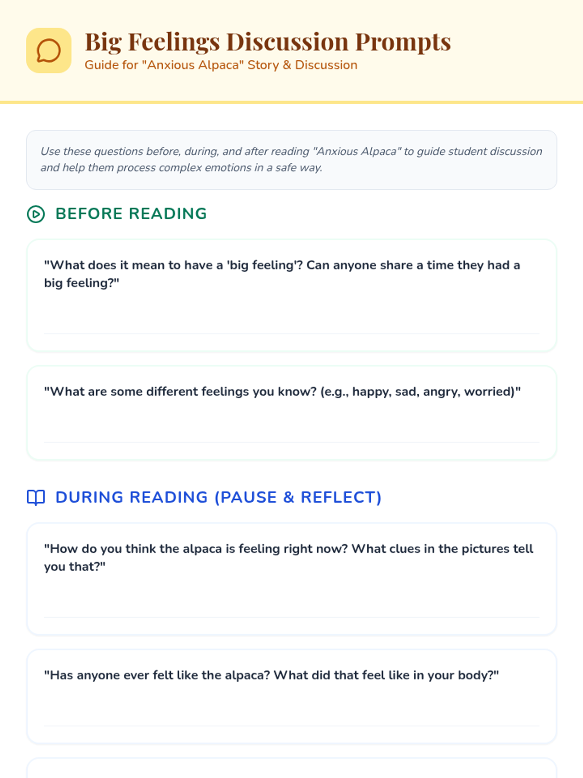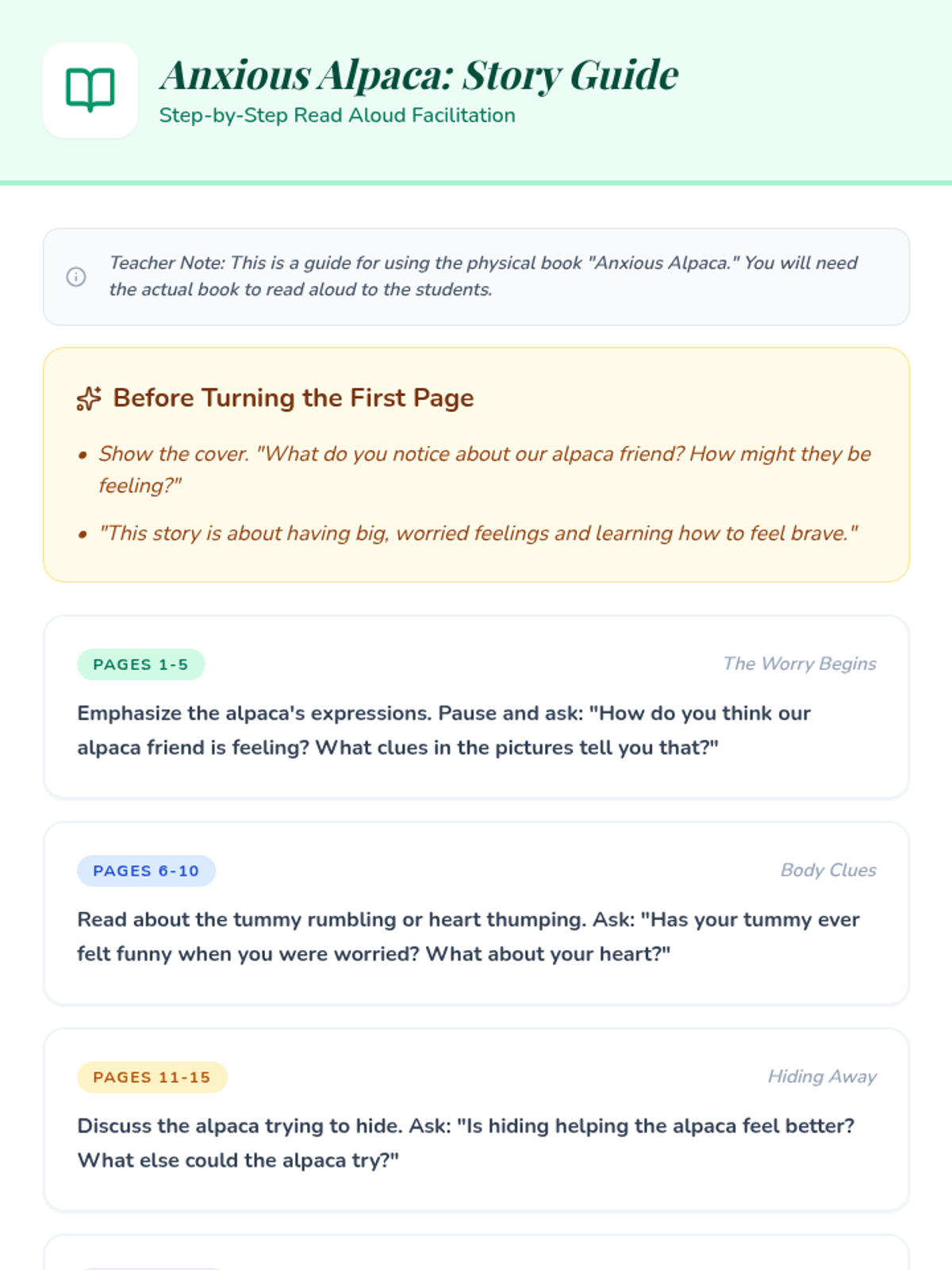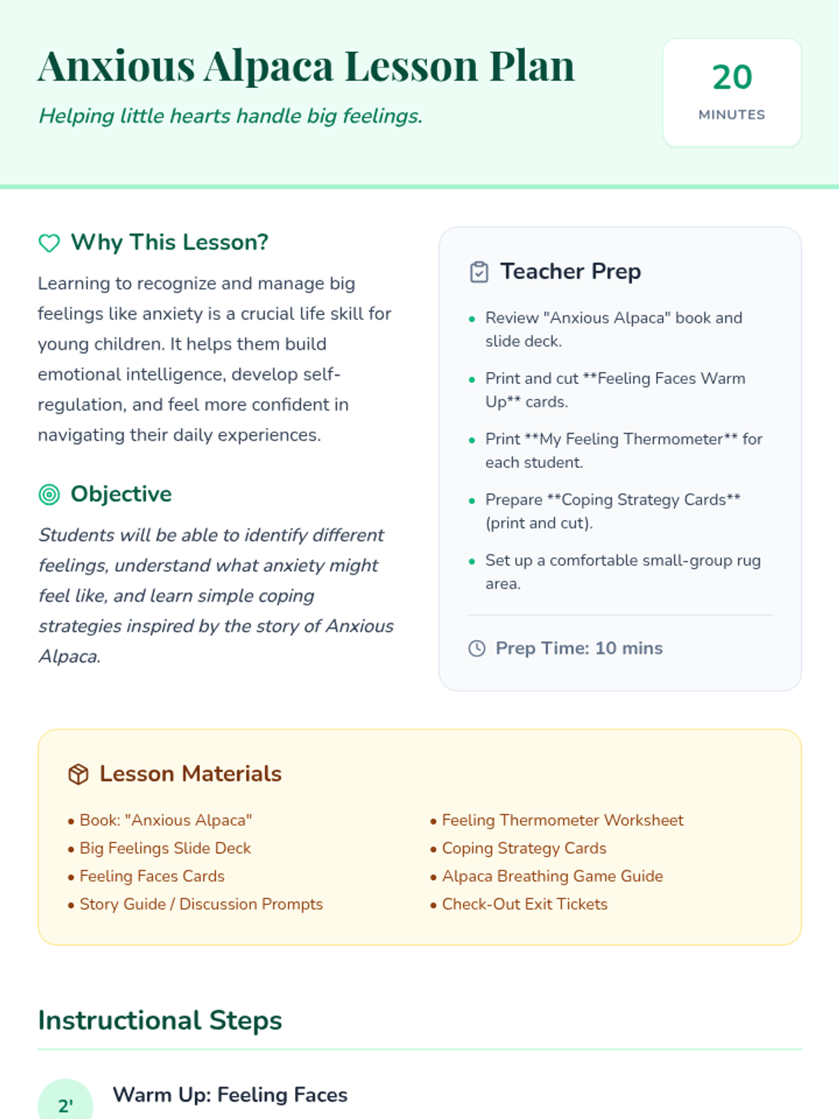A 20-minute small-group SEL lesson for Kindergarten students focusing on identifying anxiety and learning coping strategies through the story of 'Anxious Alpaca'. Students will explore feeling intensity using a 'thermometer' and practice 'Alpaca Breathing' to manage big emotions.