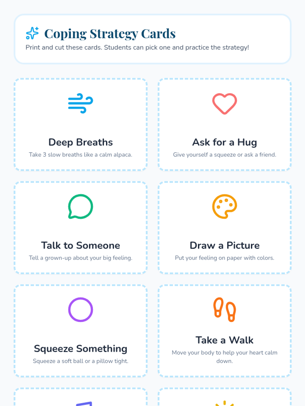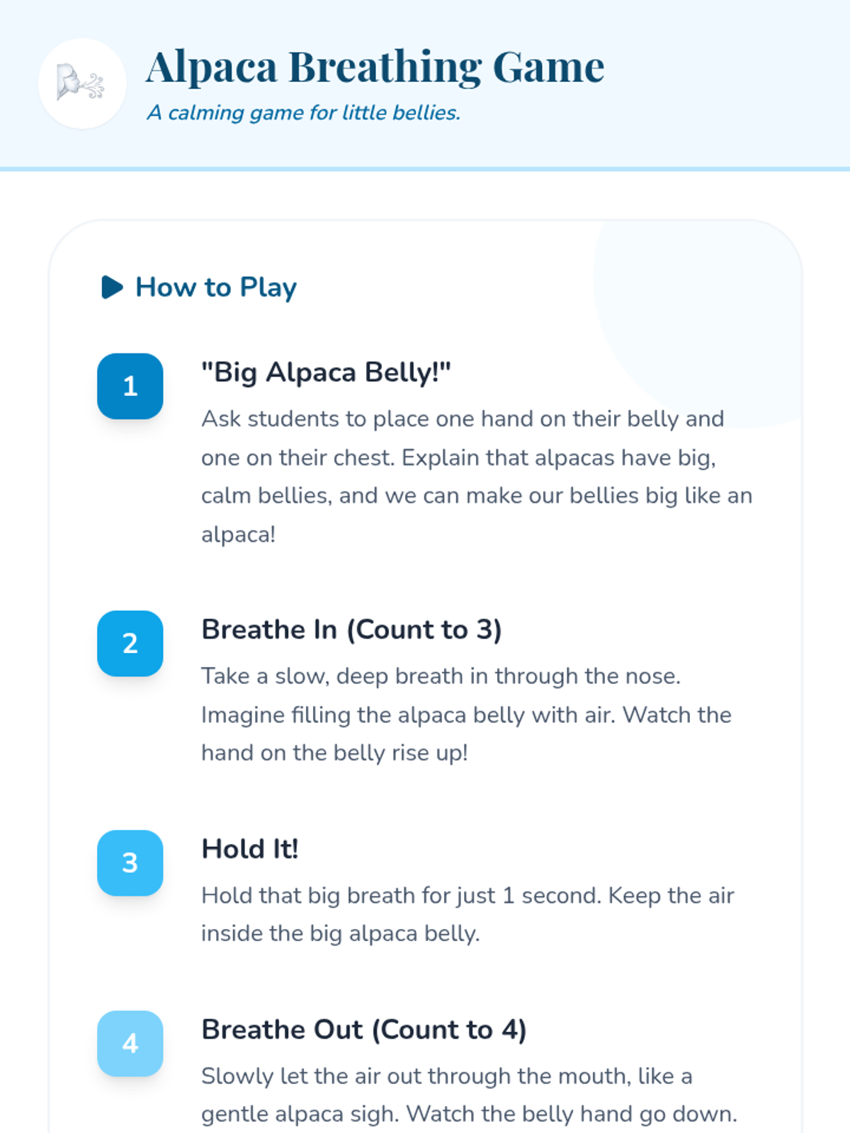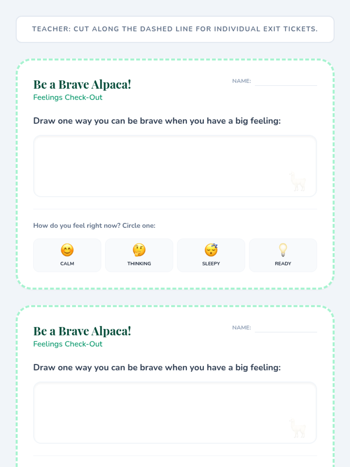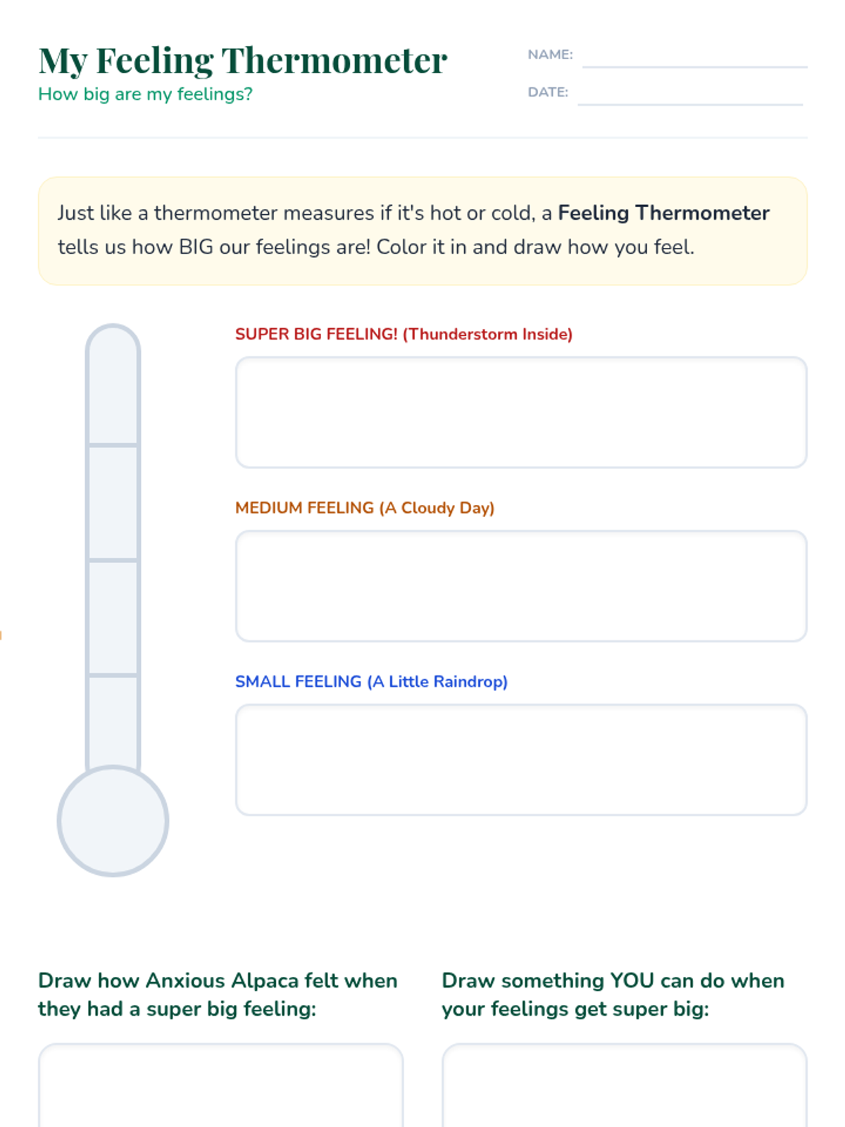 A 20-minute small-group SEL lesson for Kindergarten students focusing on identifying anxiety and learning coping strategies through the story of 'Anxious Alpaca'. Students will explore feeling intensity using a 'thermometer' and practice 'Alpaca Breathing' to manage big emotions.
