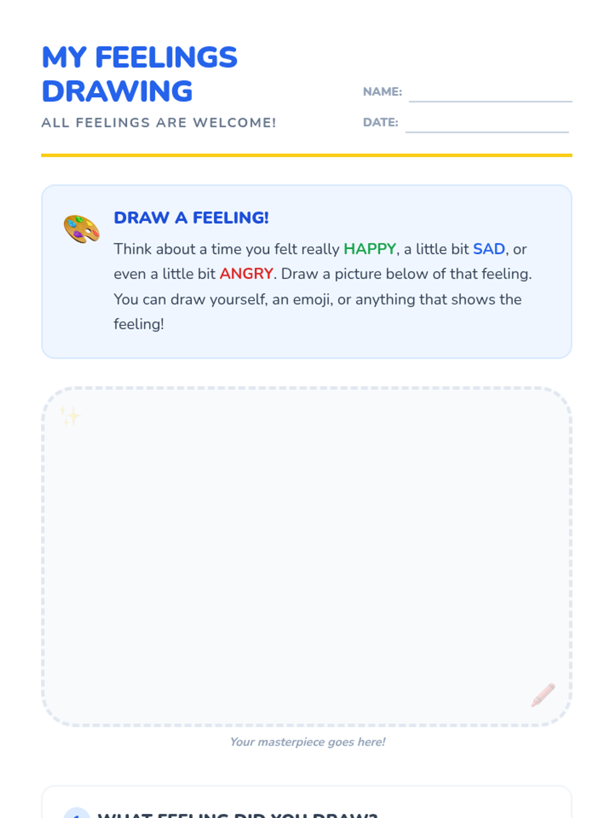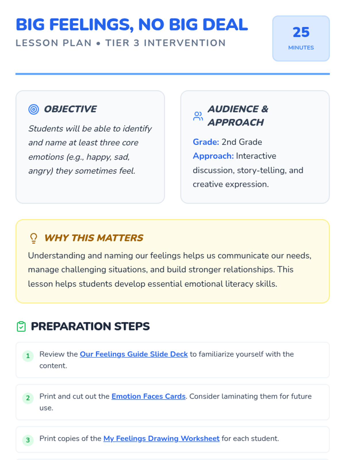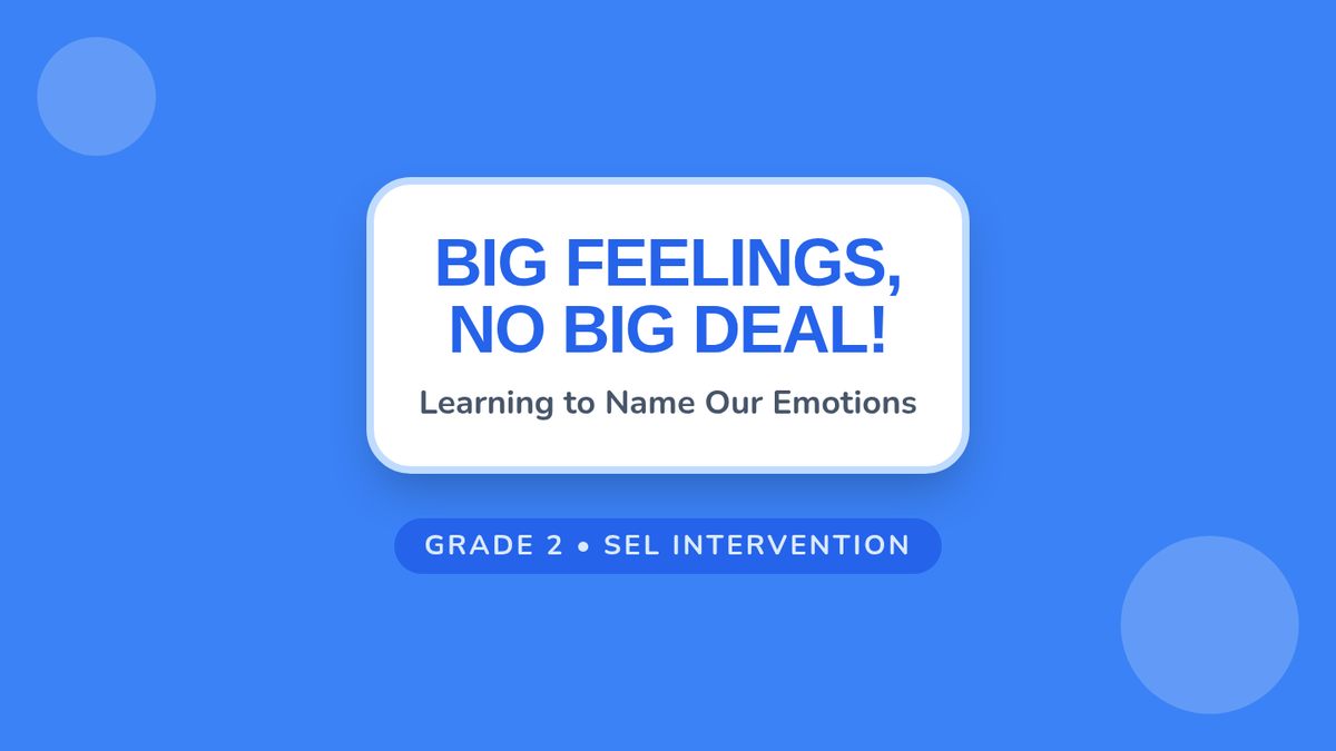 A 25-minute Tier 3 SEL lesson for 2nd graders to help them identify, name, and accept core emotions like happiness, sadness, and anger. Students will explore their own feelings through discussion, visual aids, and a creative drawing activity.