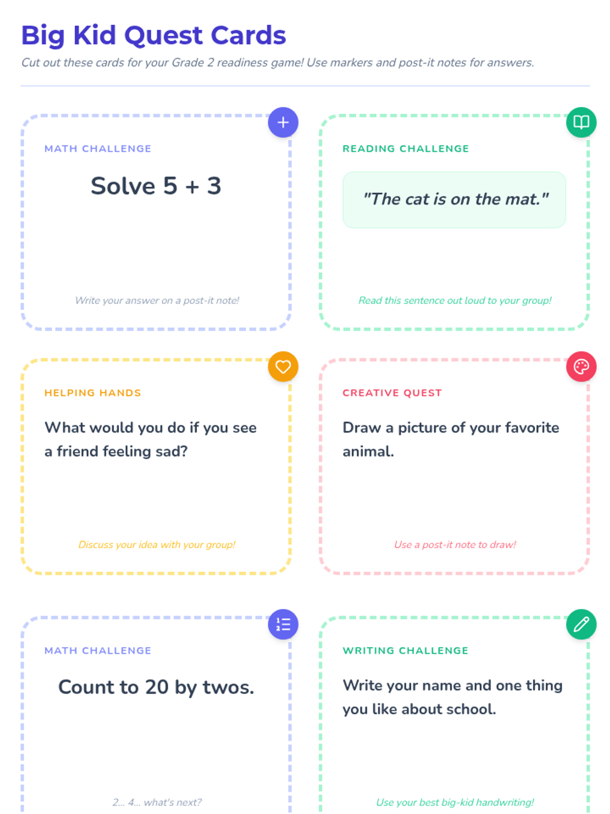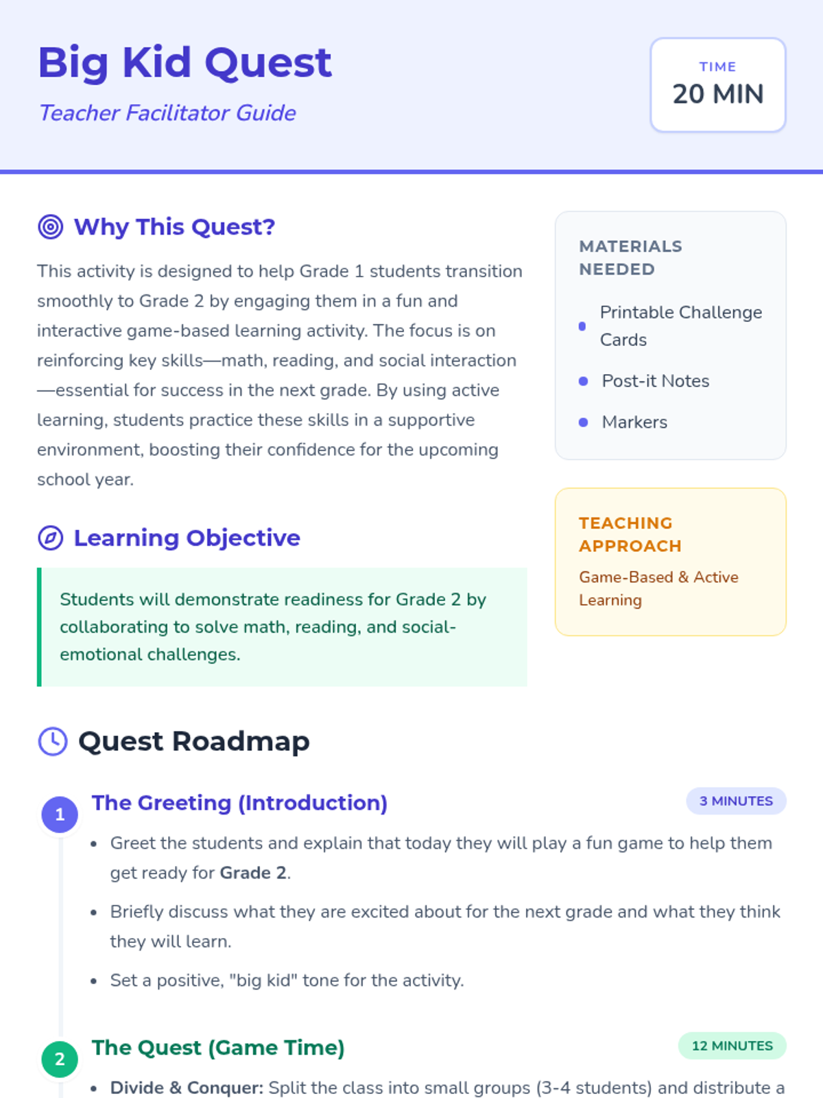 A fun, game-based transition activity for Grade 1 students to practice essential math, reading, and social skills as they prepare for Grade 2.