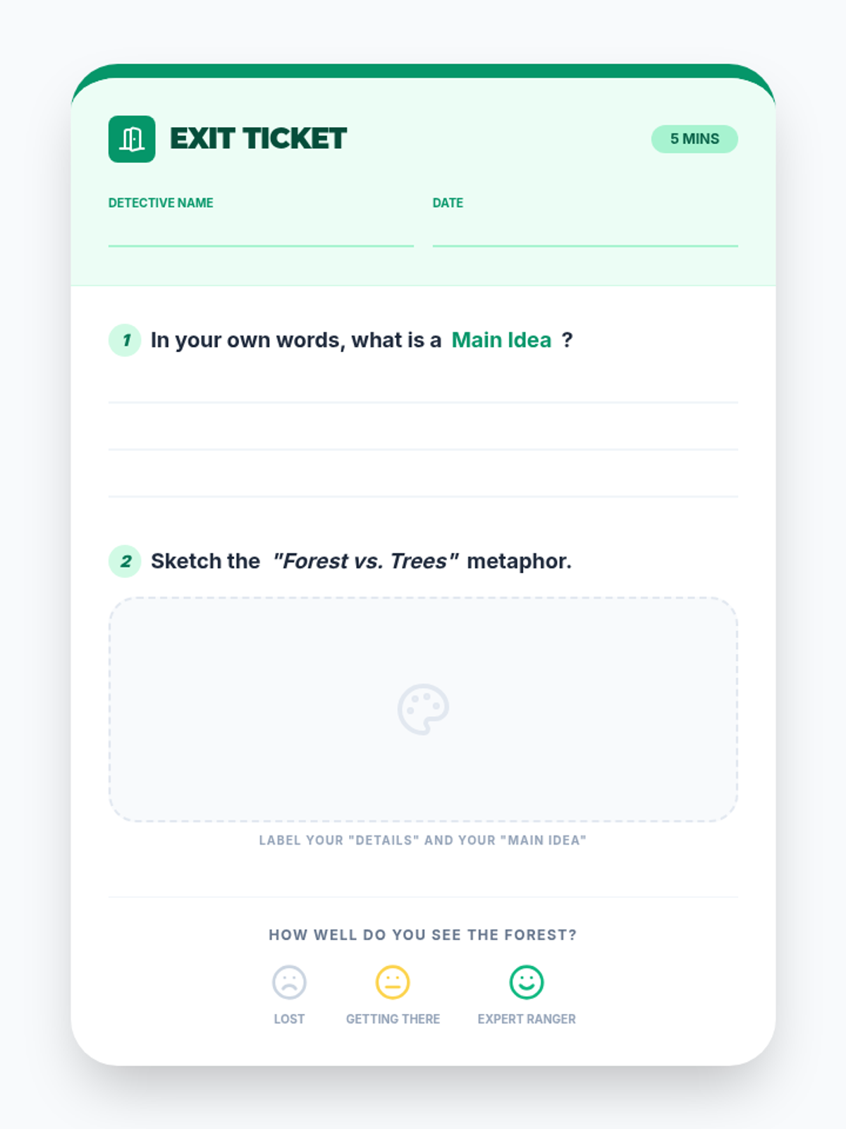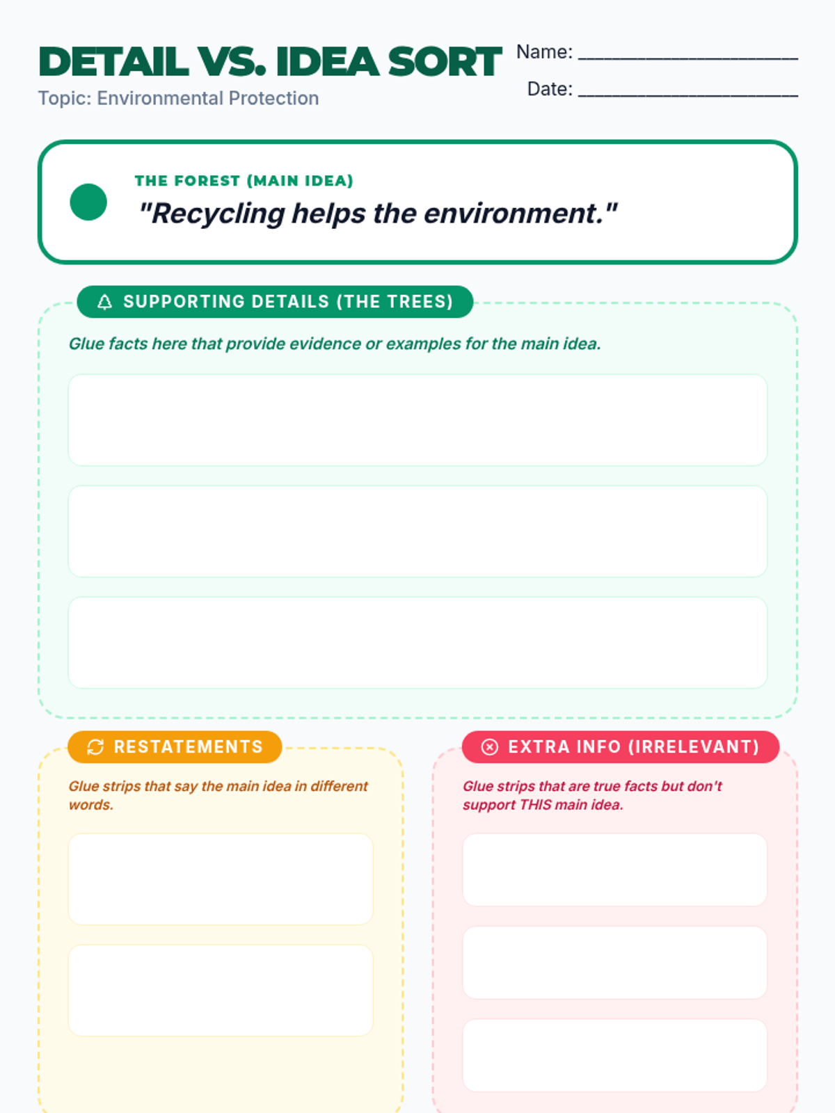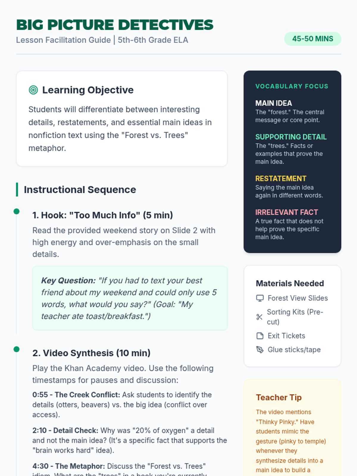 Students learn to distinguish between main ideas and supporting details using a 'forest vs. trees' analogy. This lesson includes interactive sorting, video synthesis, and a writing extension.
