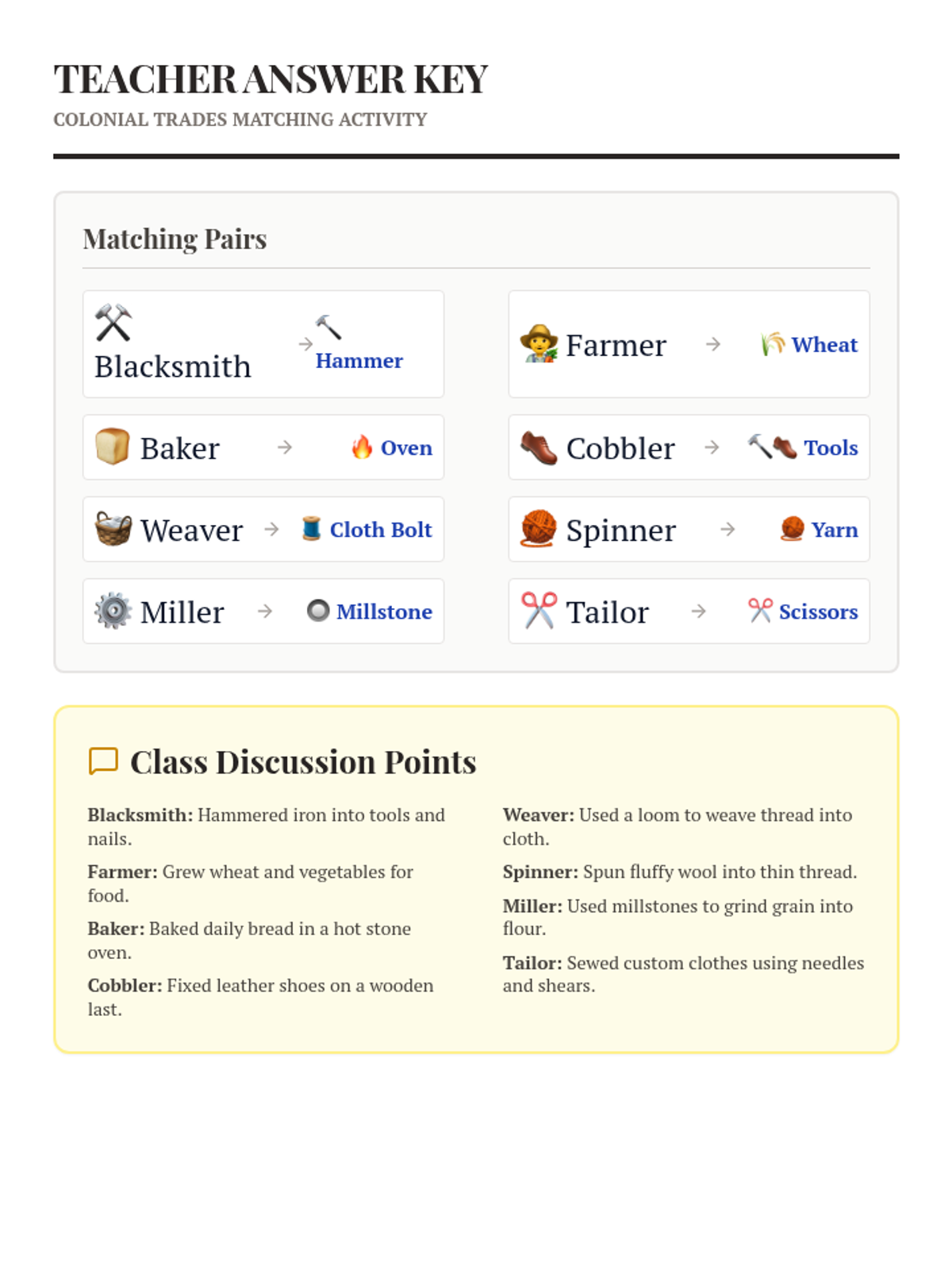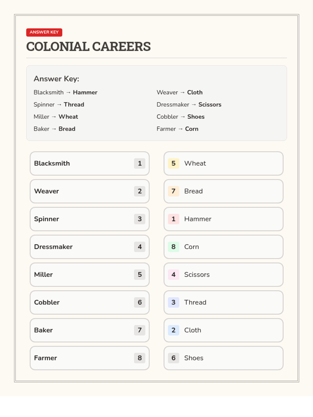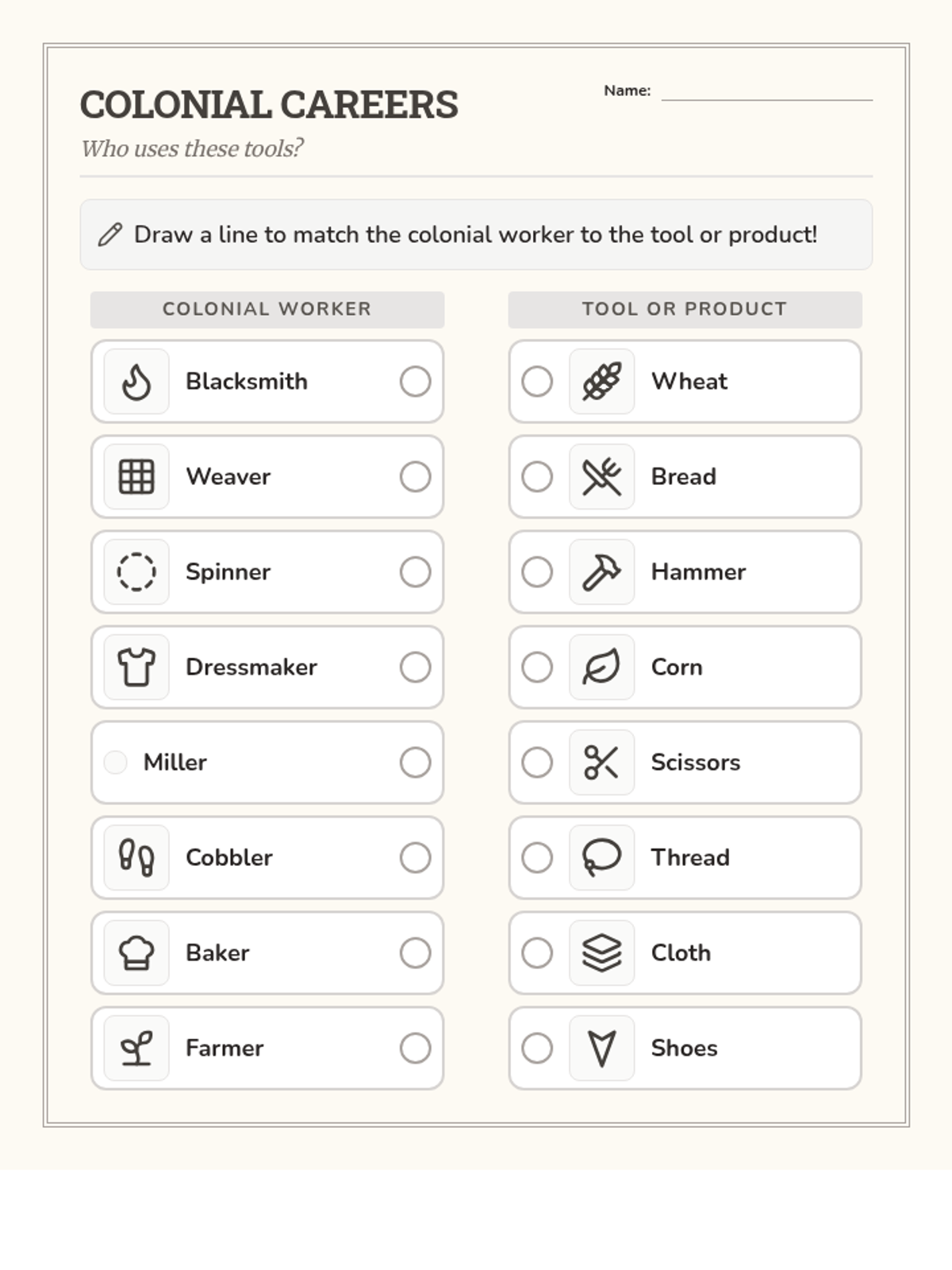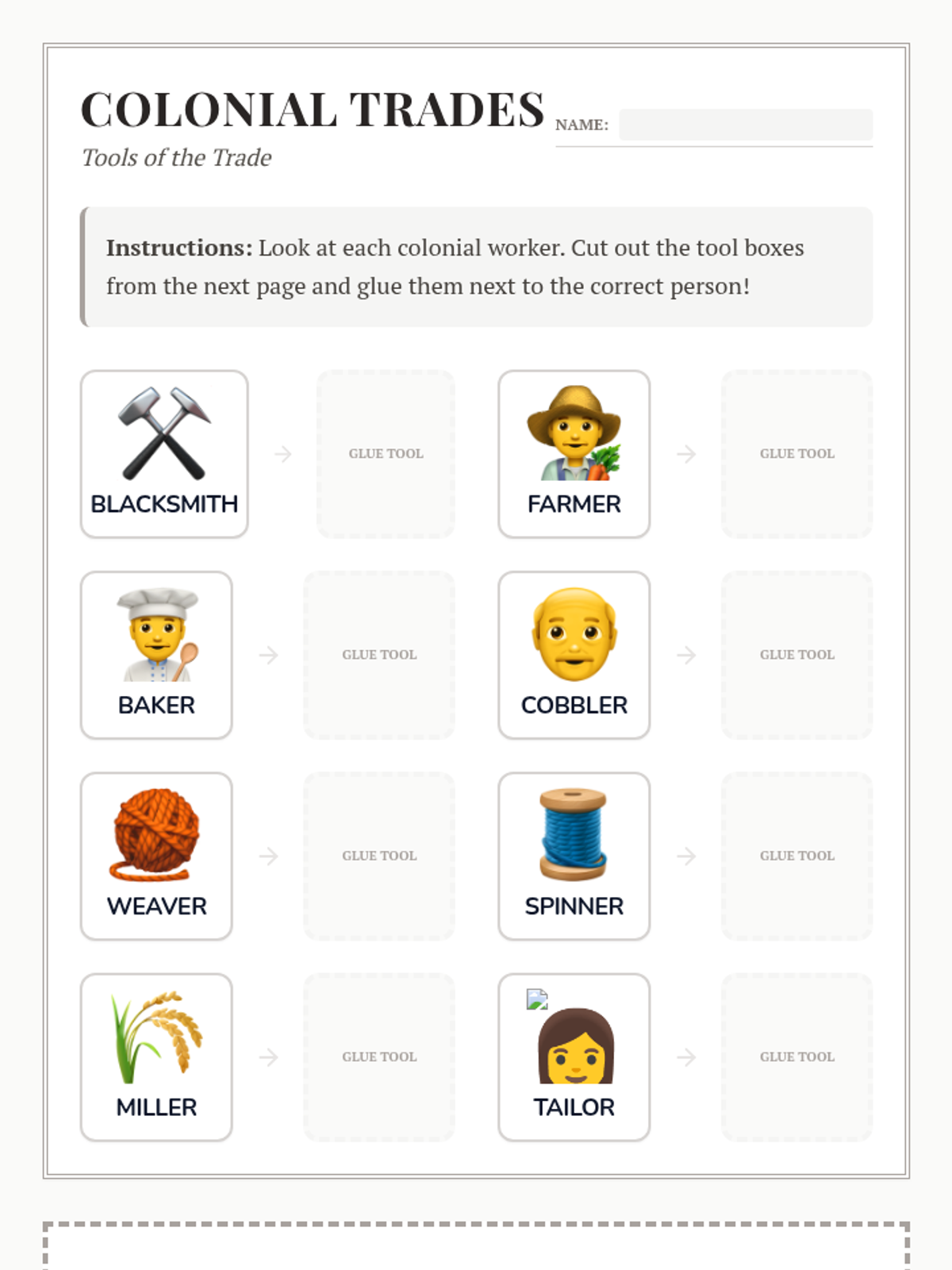 A hands-on exploration of colonial occupations where students match tradespeople like blacksmiths and bakers to their essential tools through a cut-and-paste activity.