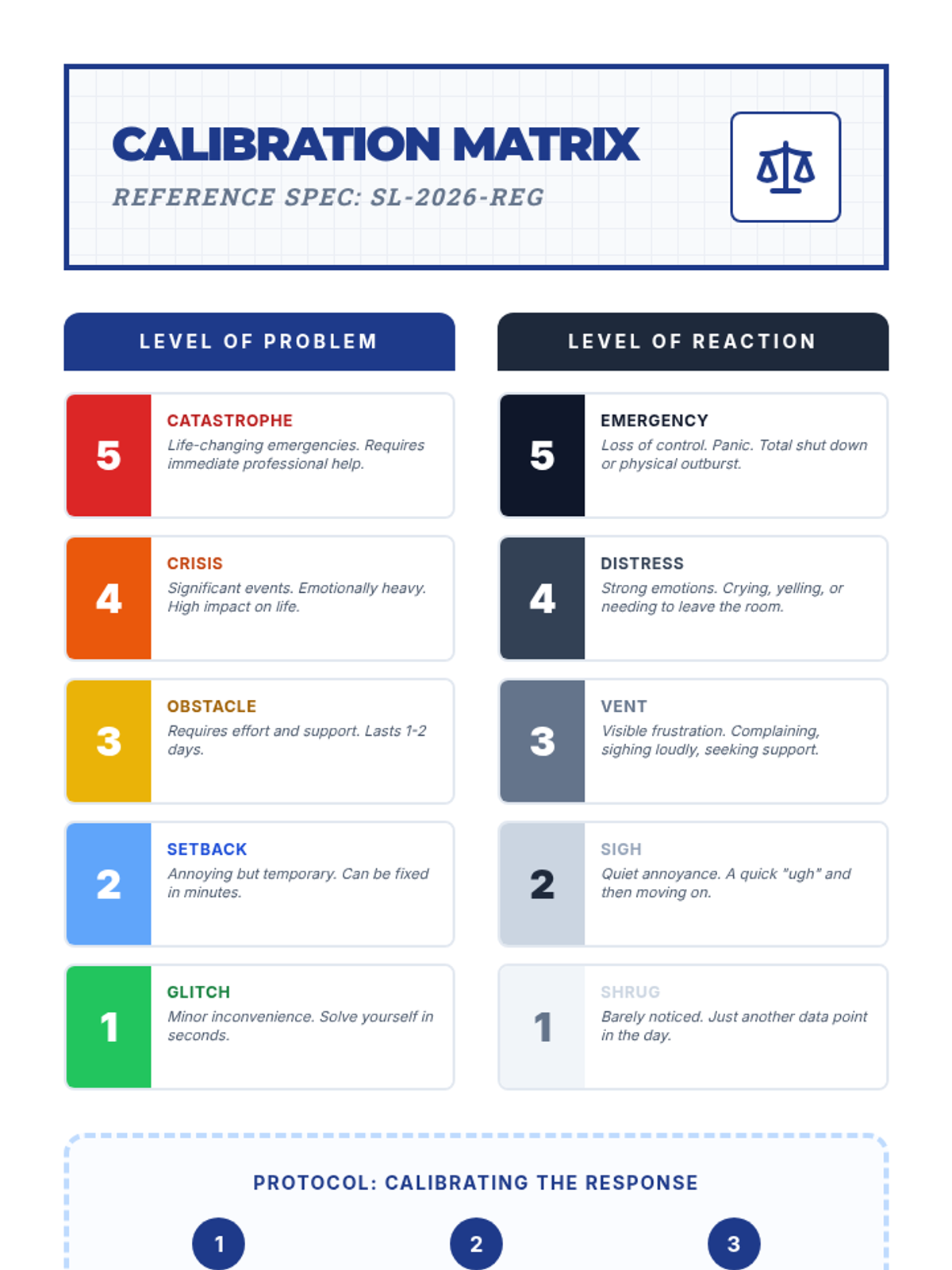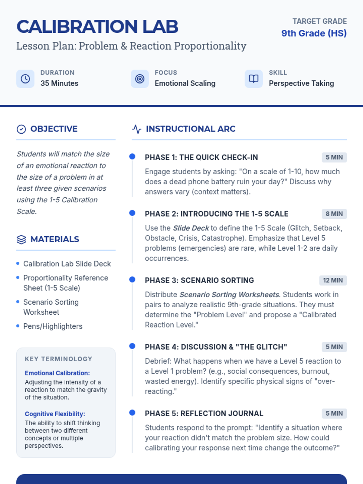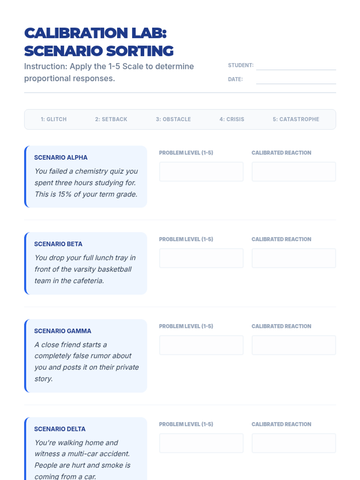 A high-school focused lesson on emotional regulation and perspective, teaching students to calibrate their emotional responses to the actual severity of life challenges. Students use a 1-5 scale to categorize problems and match appropriate reactions, fostering cognitive flexibility.