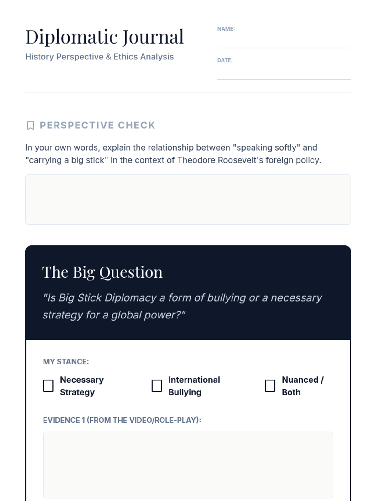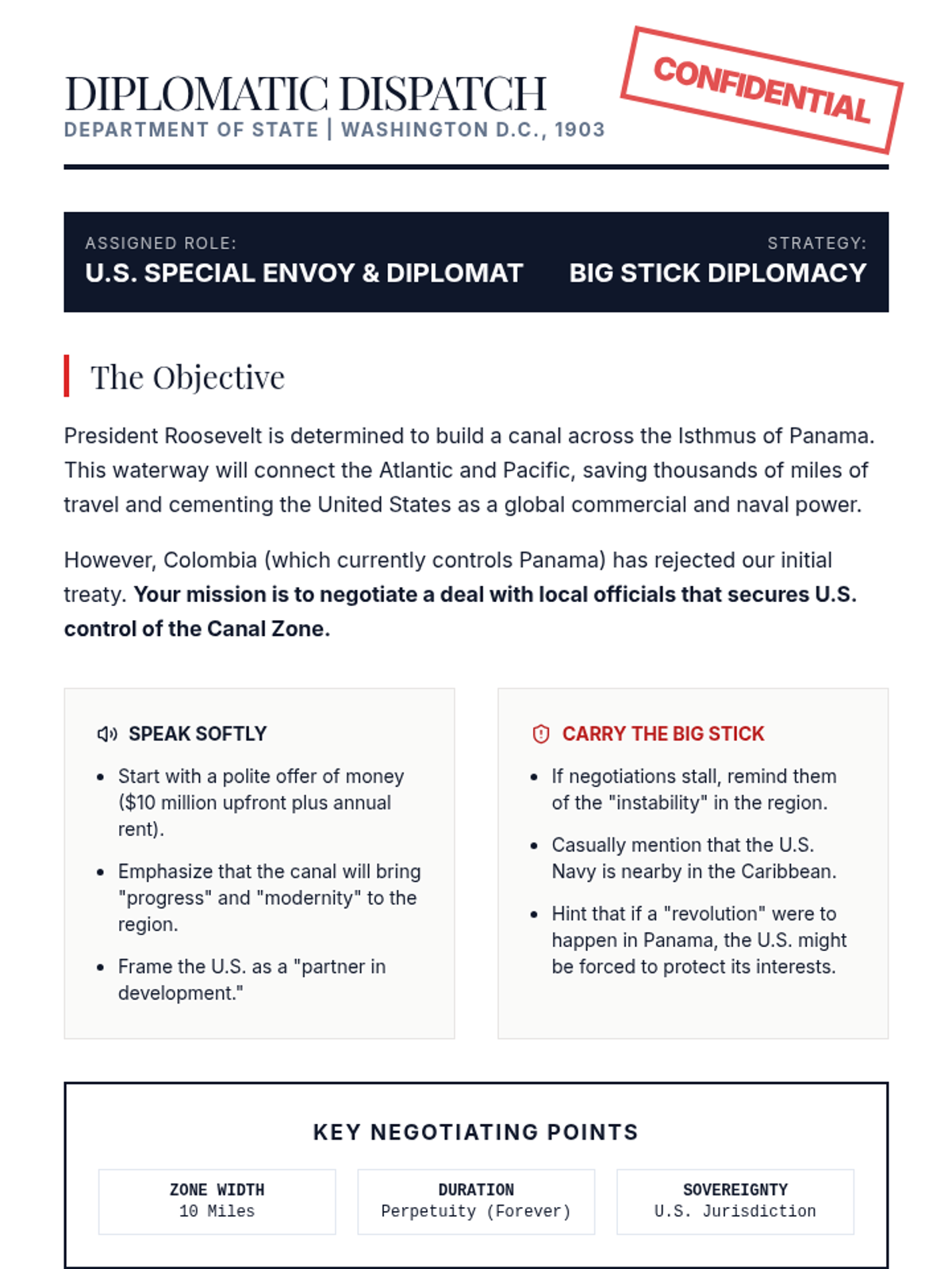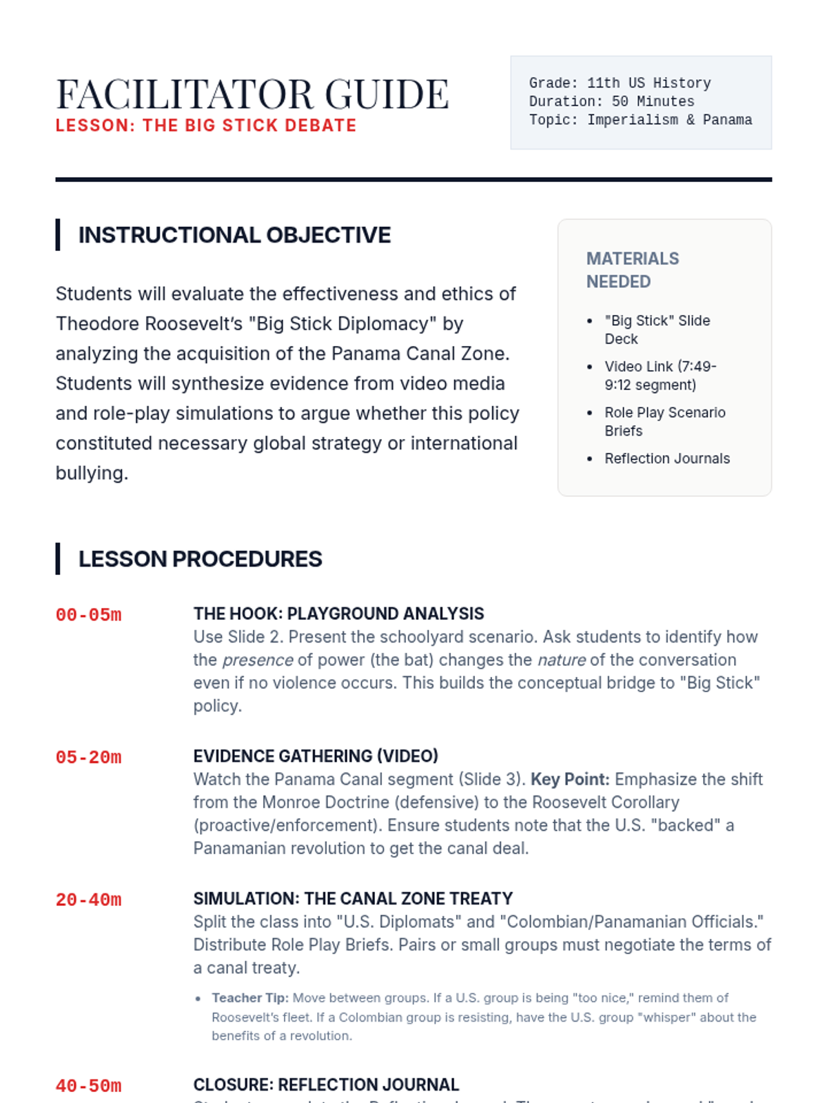 An 11th-grade US History lesson evaluating the ethics and effectiveness of Theodore Roosevelt's 'Big Stick Diplomacy' through a case study of the Panama Canal. Students analyze primary source concepts, view historical video evidence, and engage in a high-stakes diplomatic role-play.