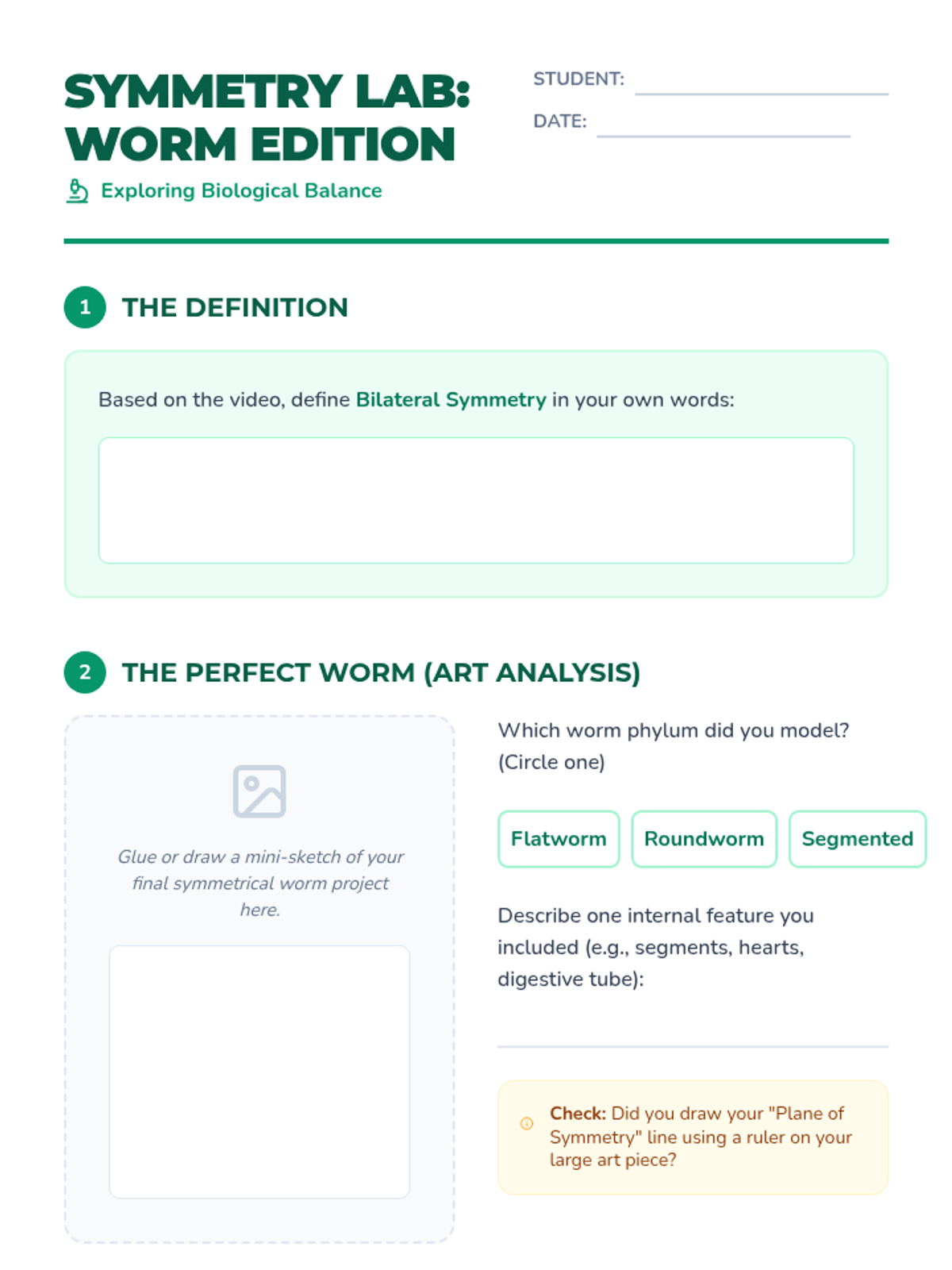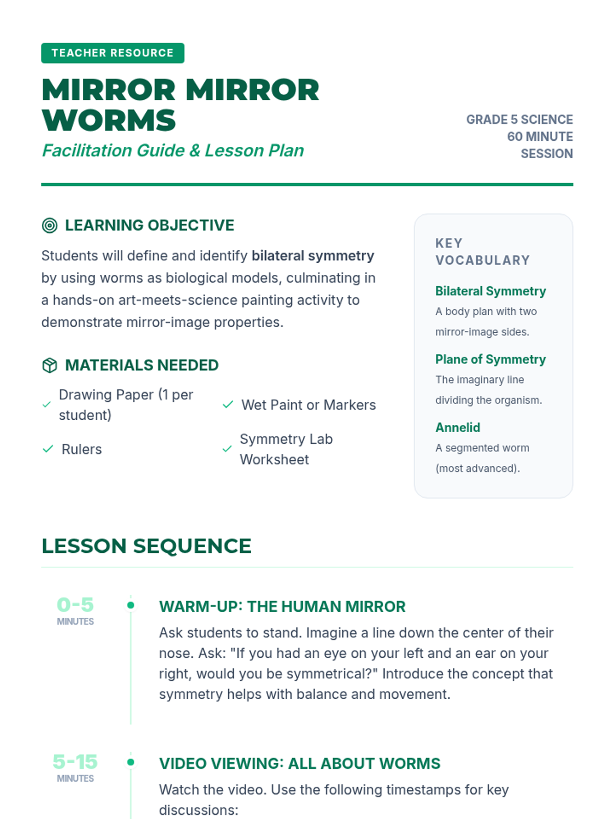 A biological science lesson exploring bilateral symmetry using worms as a model, featuring a hands-on art-meets-science painting activity.
