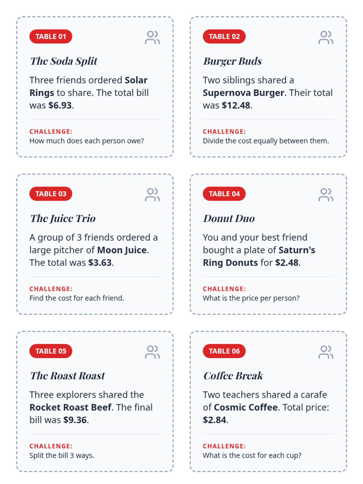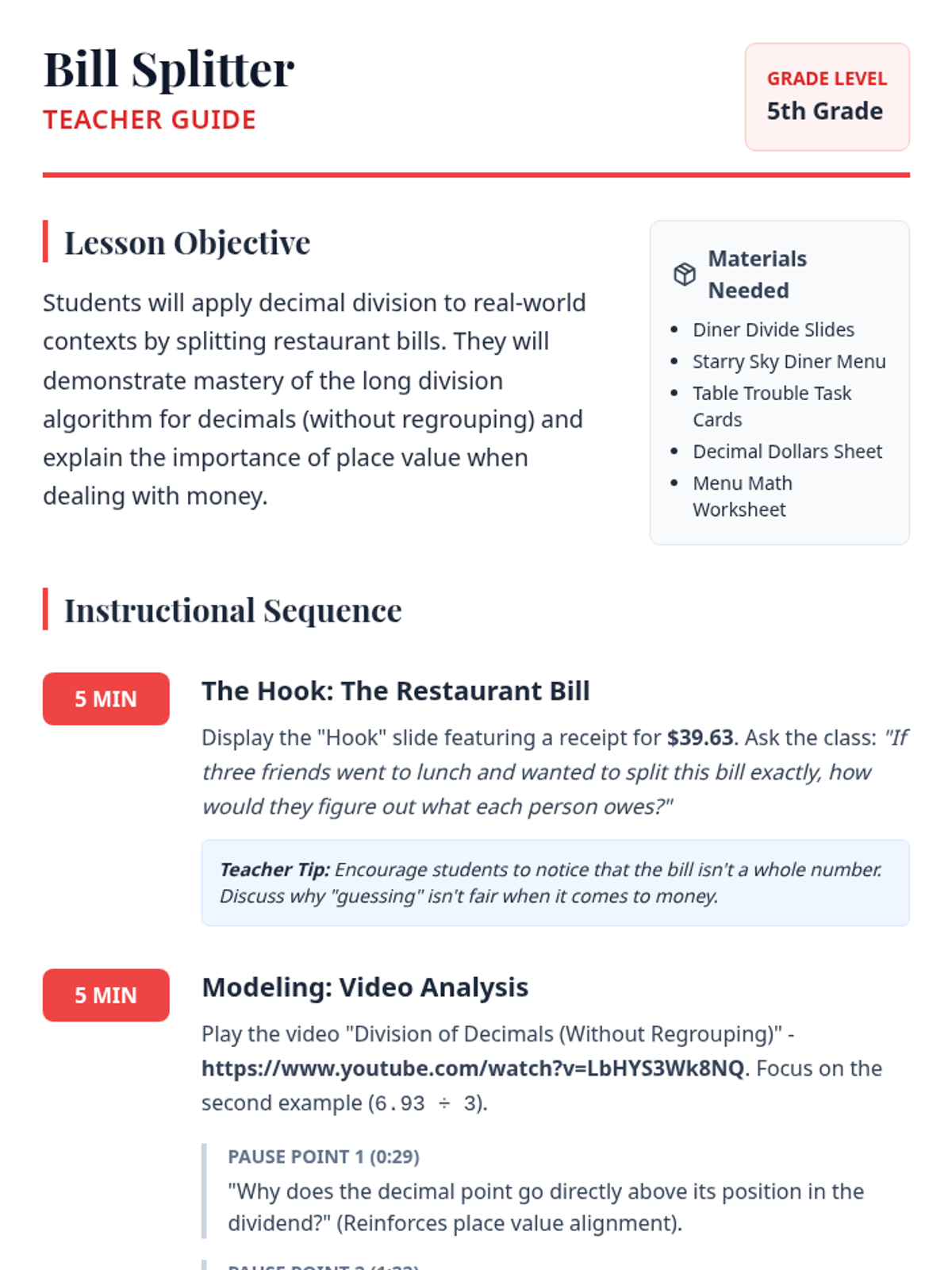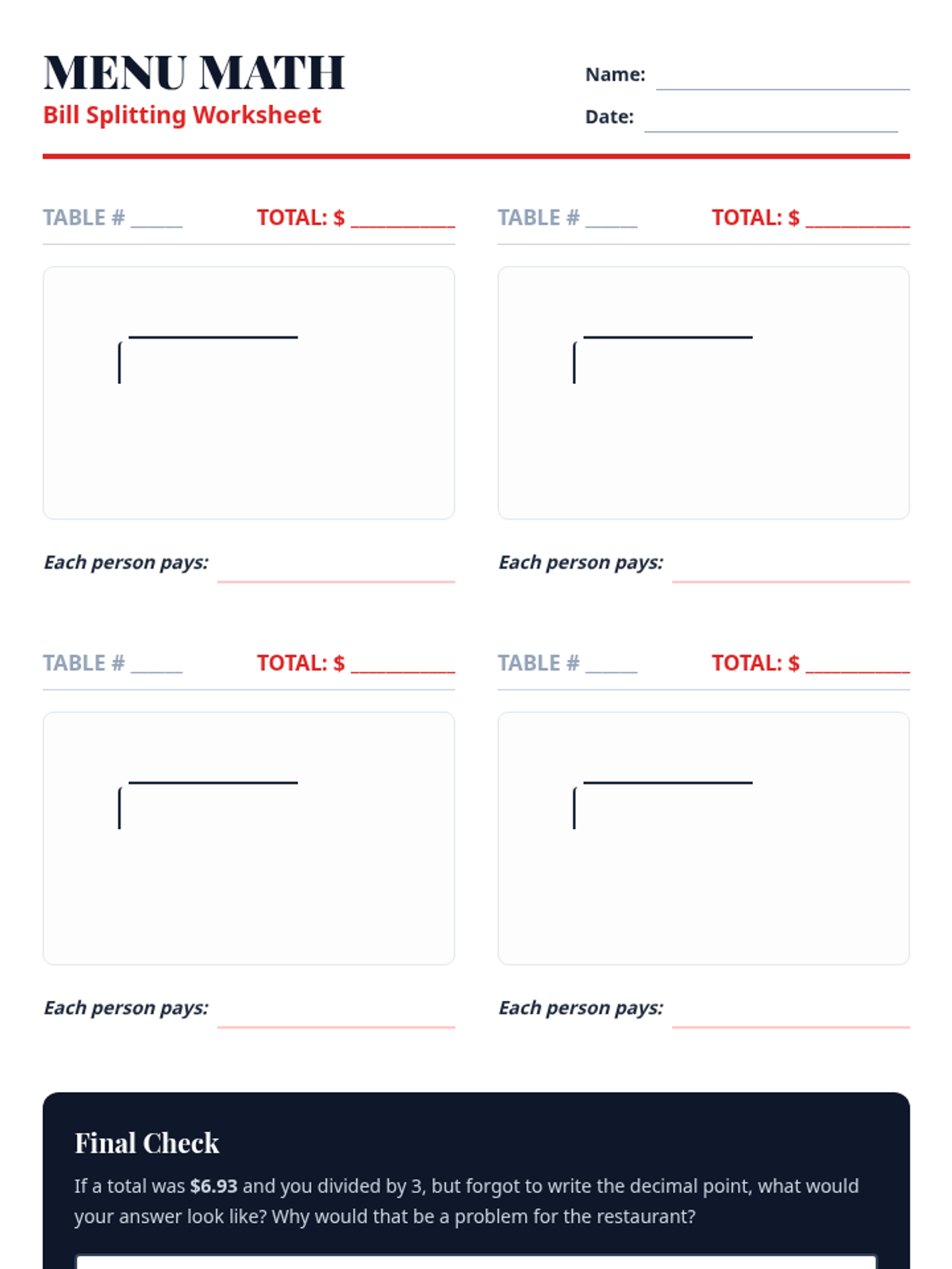 Students will apply decimal division to real-world contexts by simulating restaurant scenarios. They will practice dividing prices by groups of people to determine individual costs, reinforcing place value understanding in the context of currency.