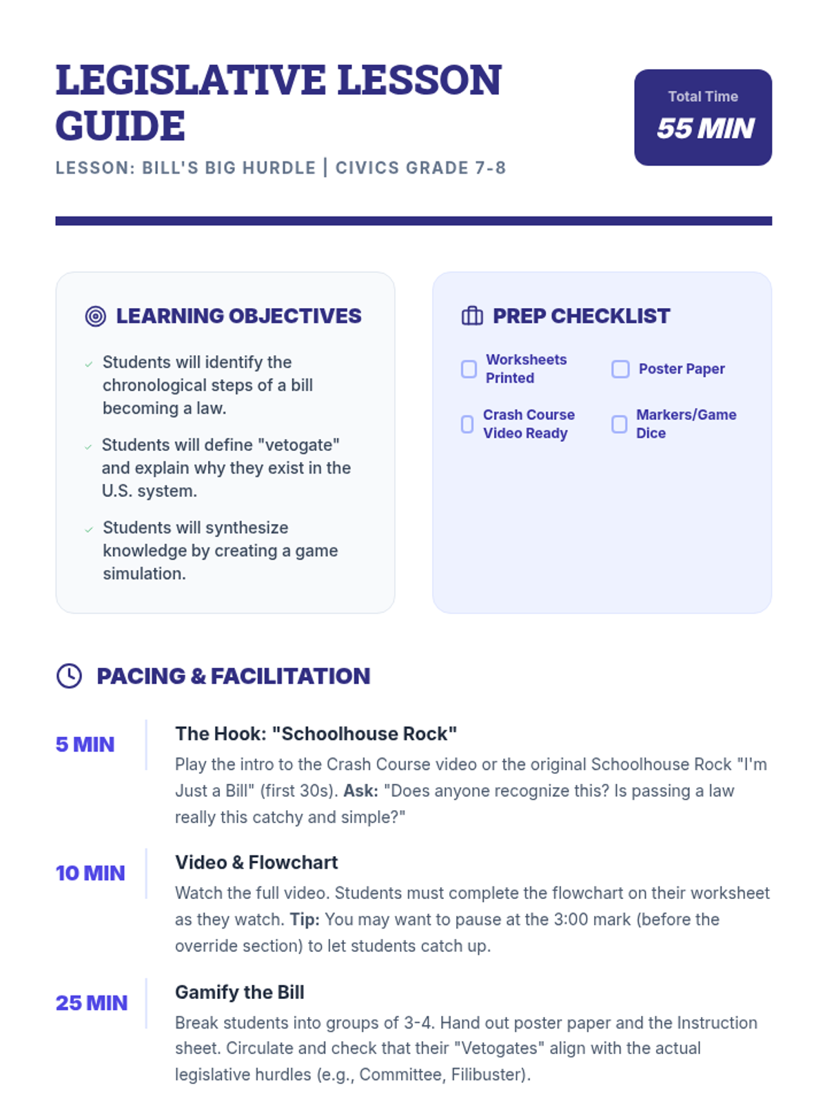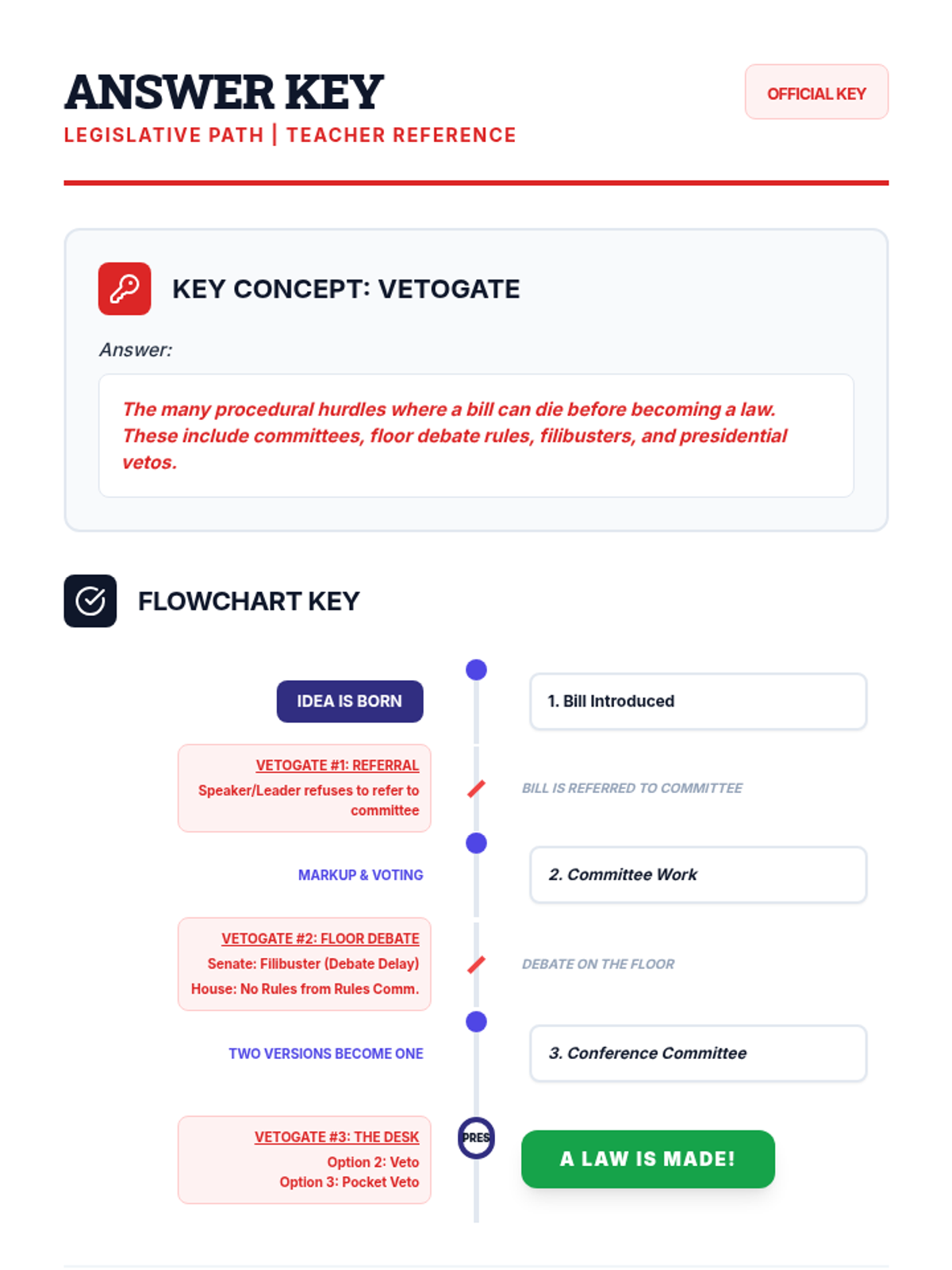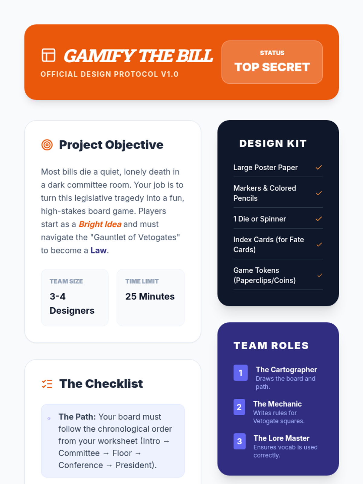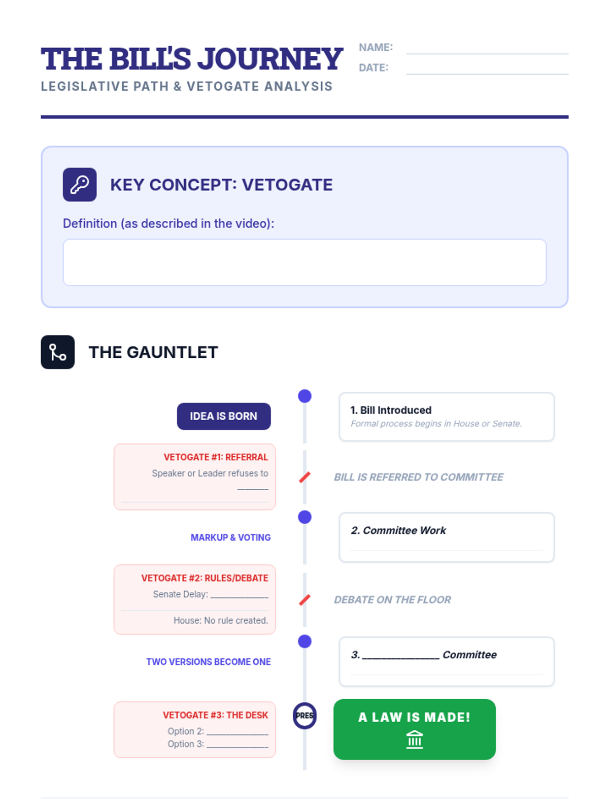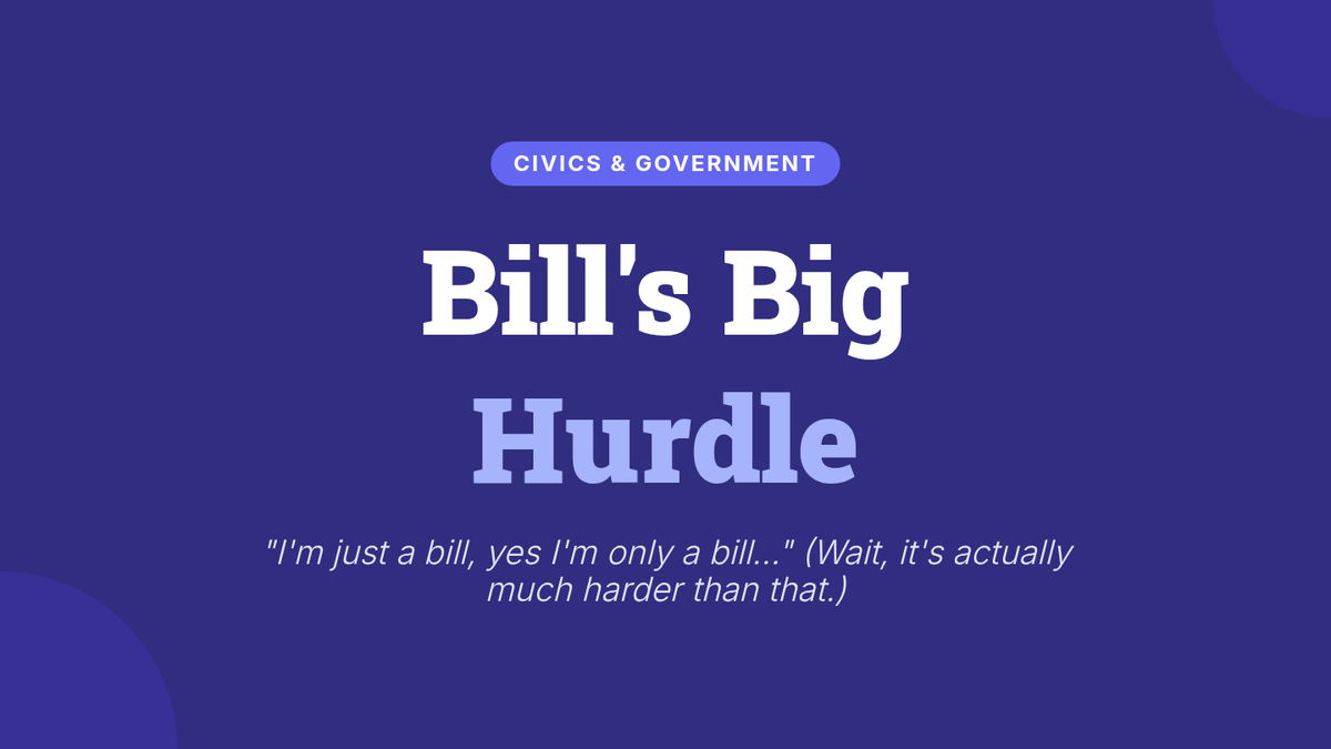 A civics lesson for middle schoolers exploring the legislative process and 'vetogates'—the numerous hurdles where a bill can die. Students watch a Crash Course video and design a board game that simulates the difficult journey from bill to law.