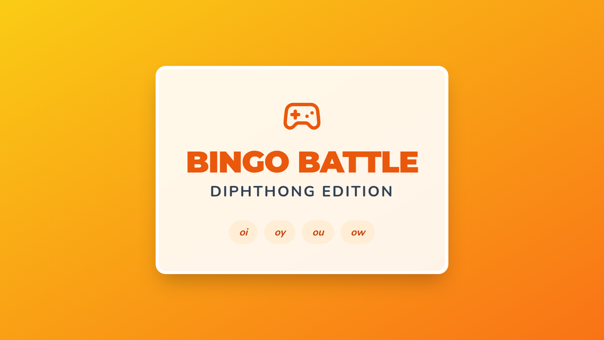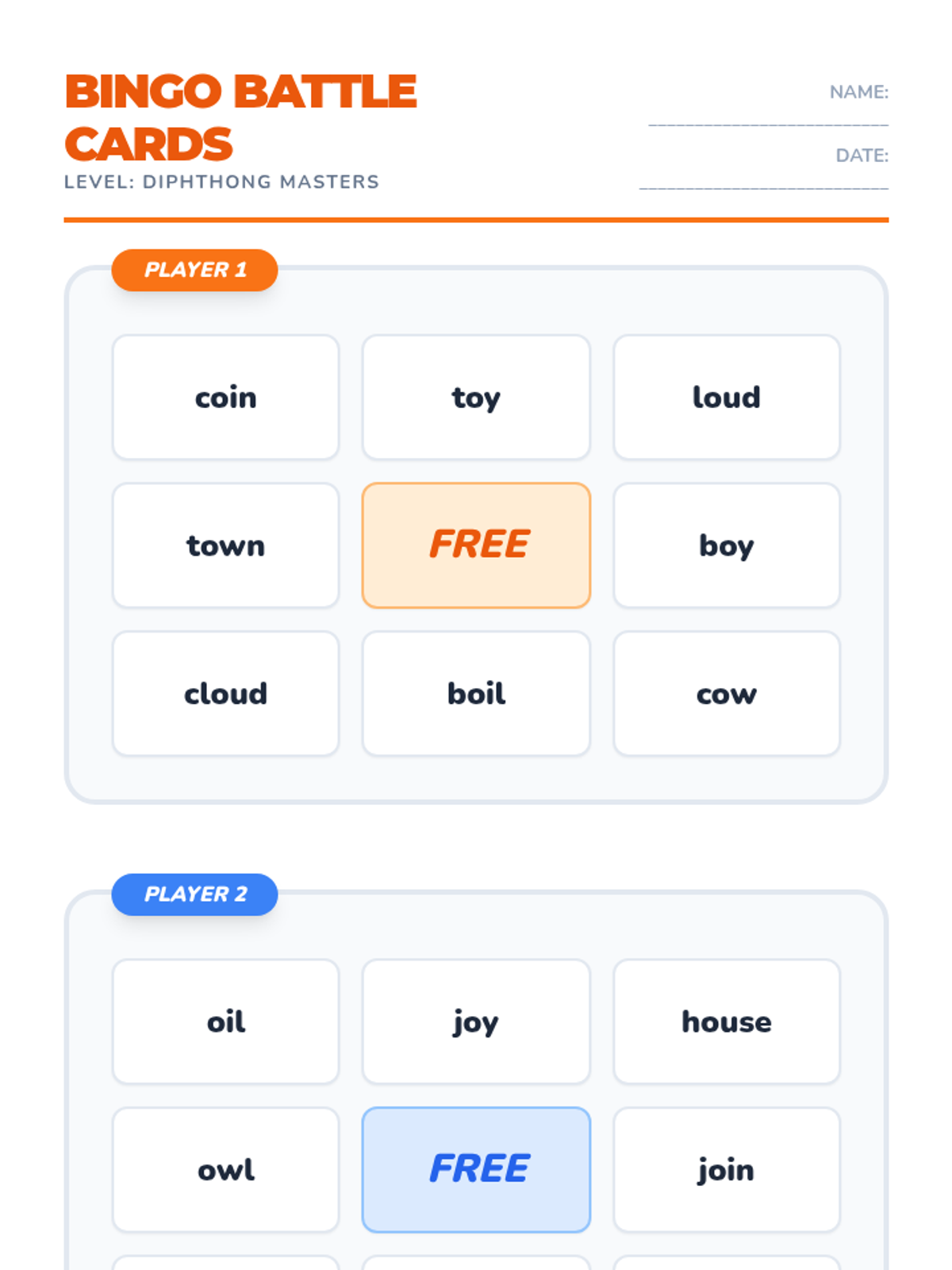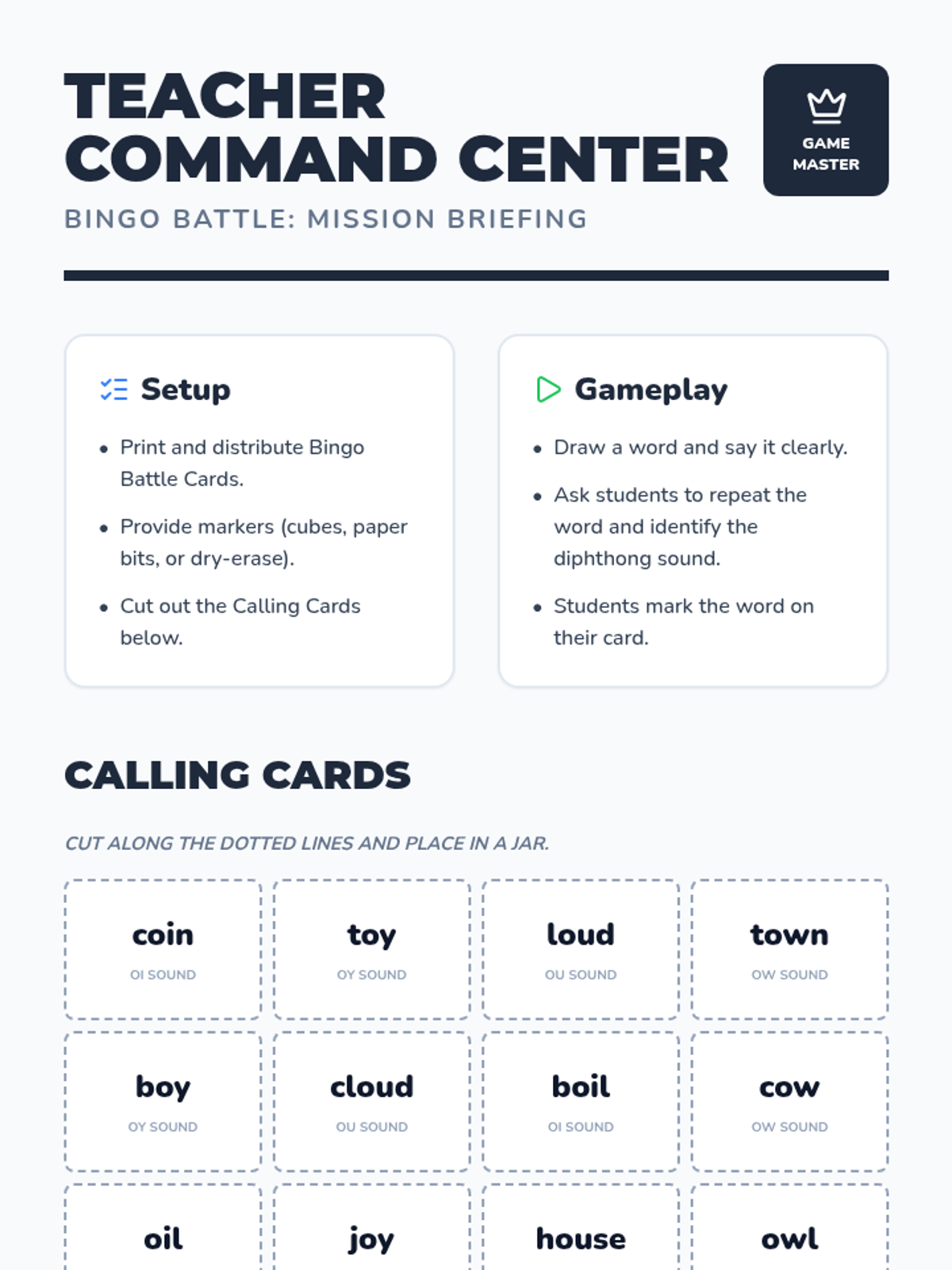 Students practice rapid recognition of diphthong words through a high-stakes Bingo game. The focus is on decoding mixed oi, oy, ou, and ow words in a fun, competitive environment.