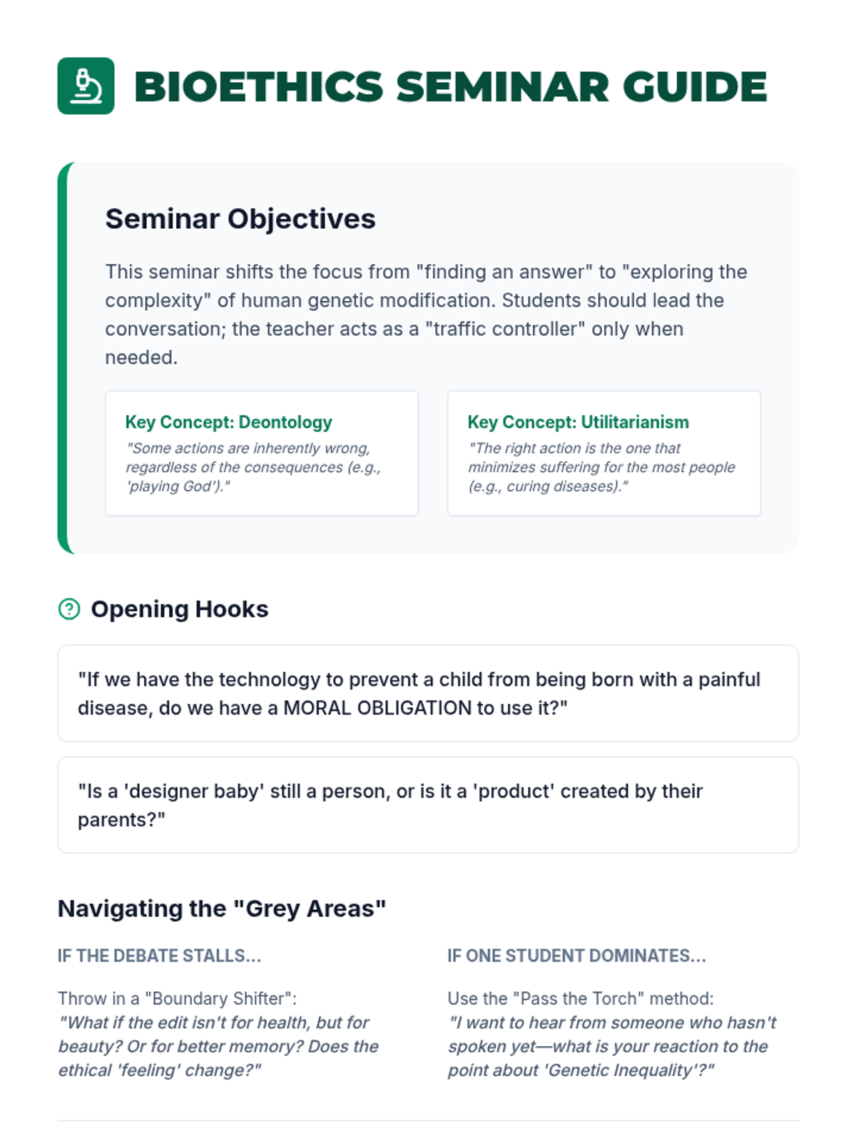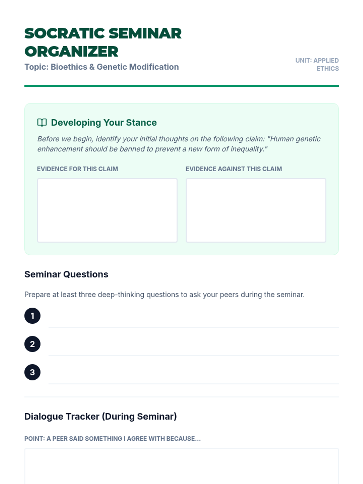 Students explore the boundaries of genetic engineering through a Socratic seminar, weighing the potential for curing diseases against the ethical risks of human enhancement.