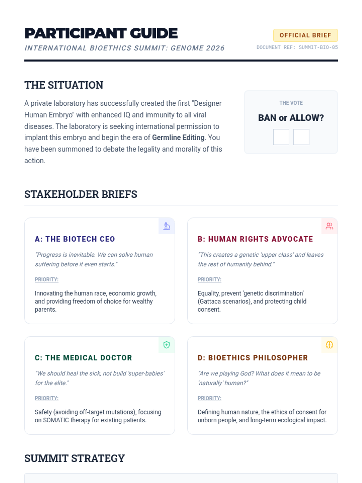 A culminating role-playing summit where students debate the ethics of germline editing and 'designer babies' using scientific and ethical reasoning.