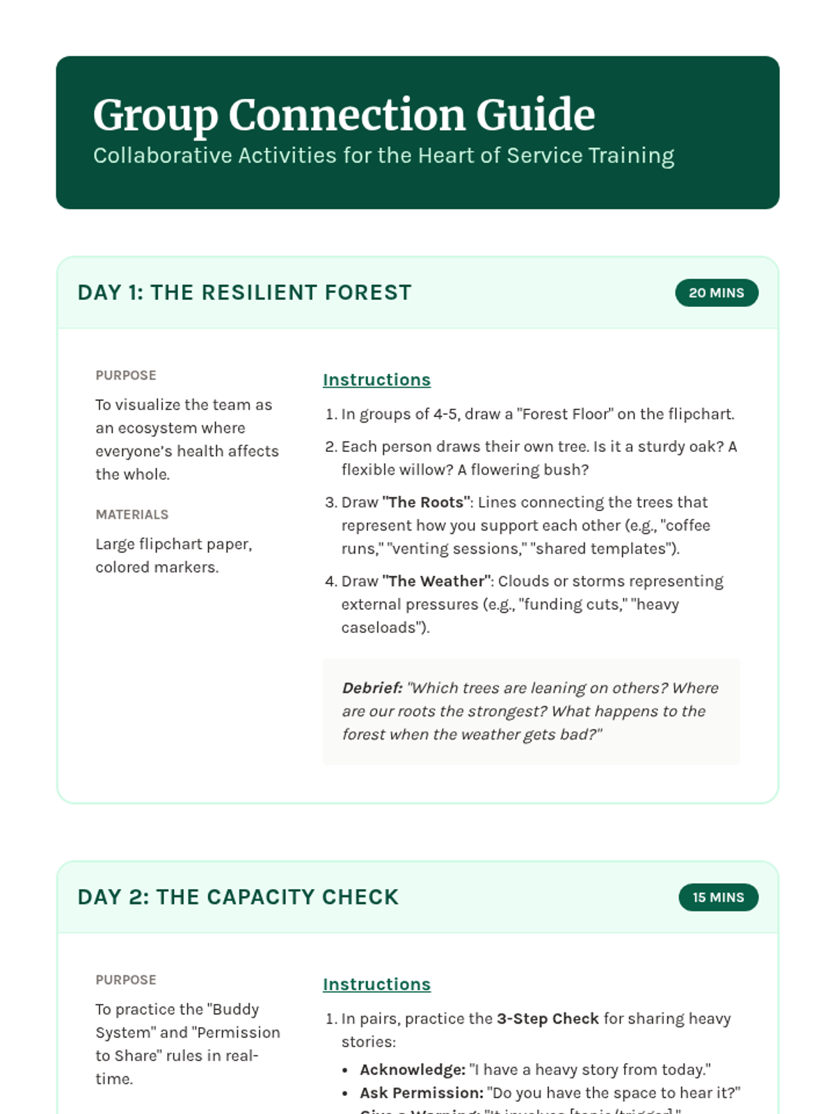 A collection of facilitator-facing resources, including group activity guides, scenario cards, and supplemental notes to support the delivery of the 3-day training.