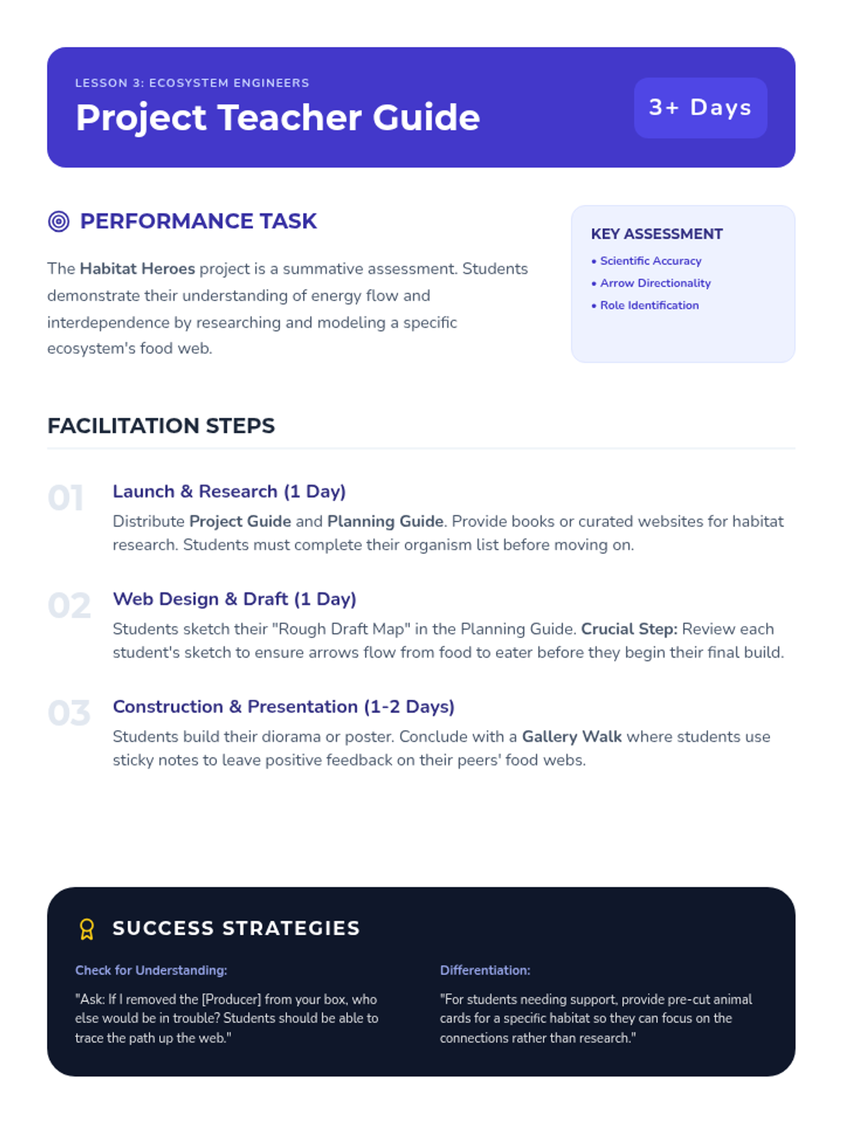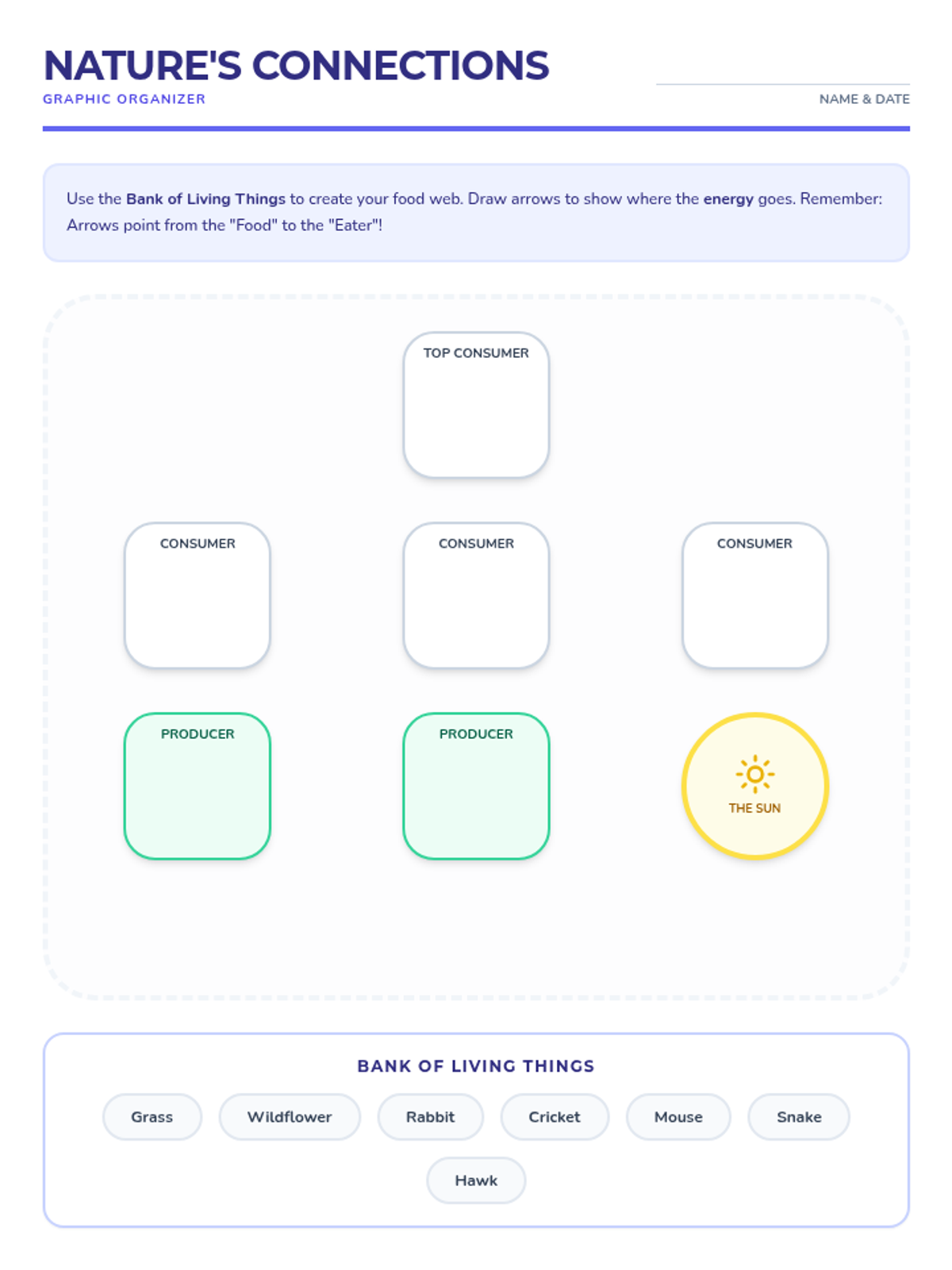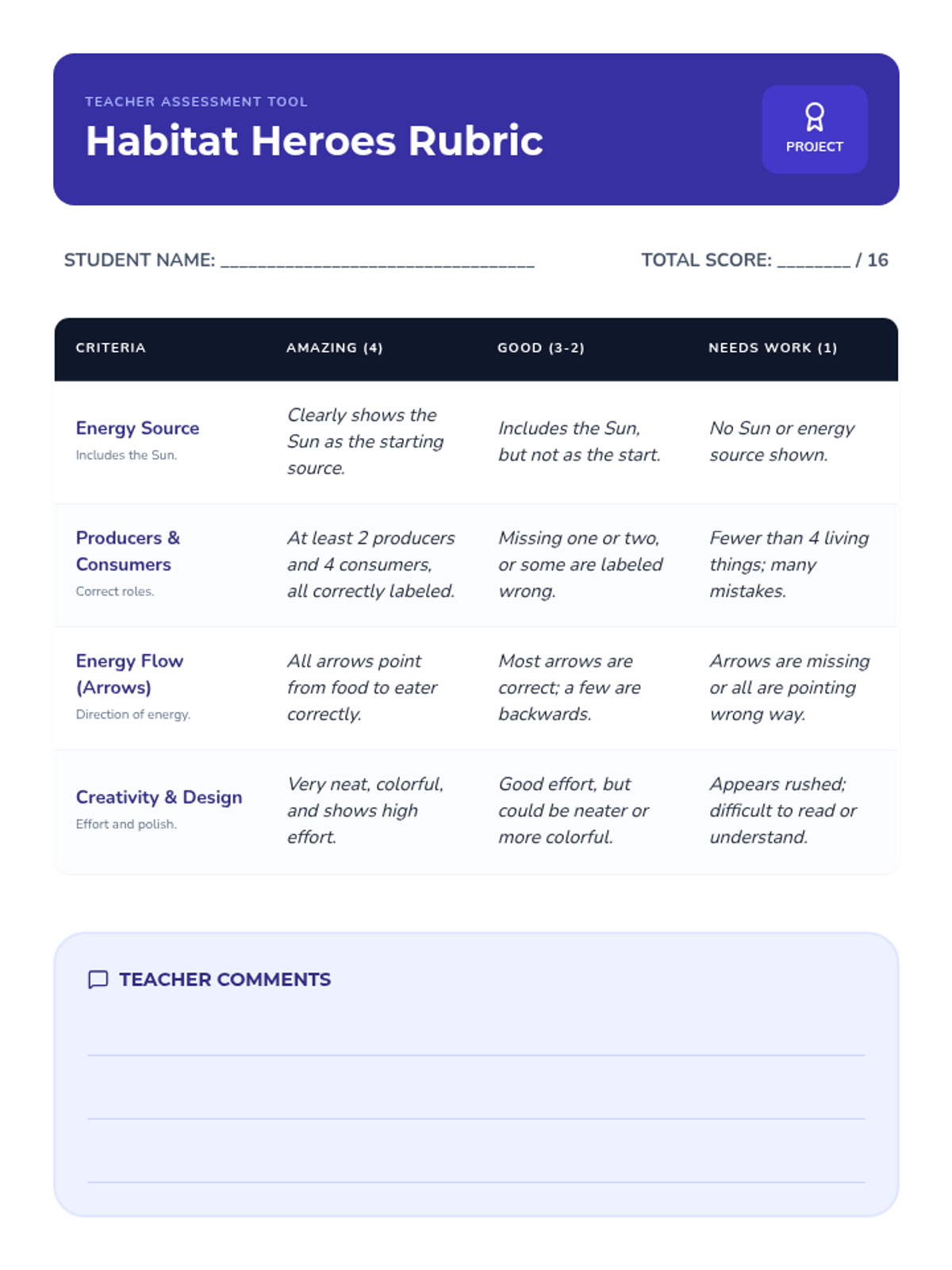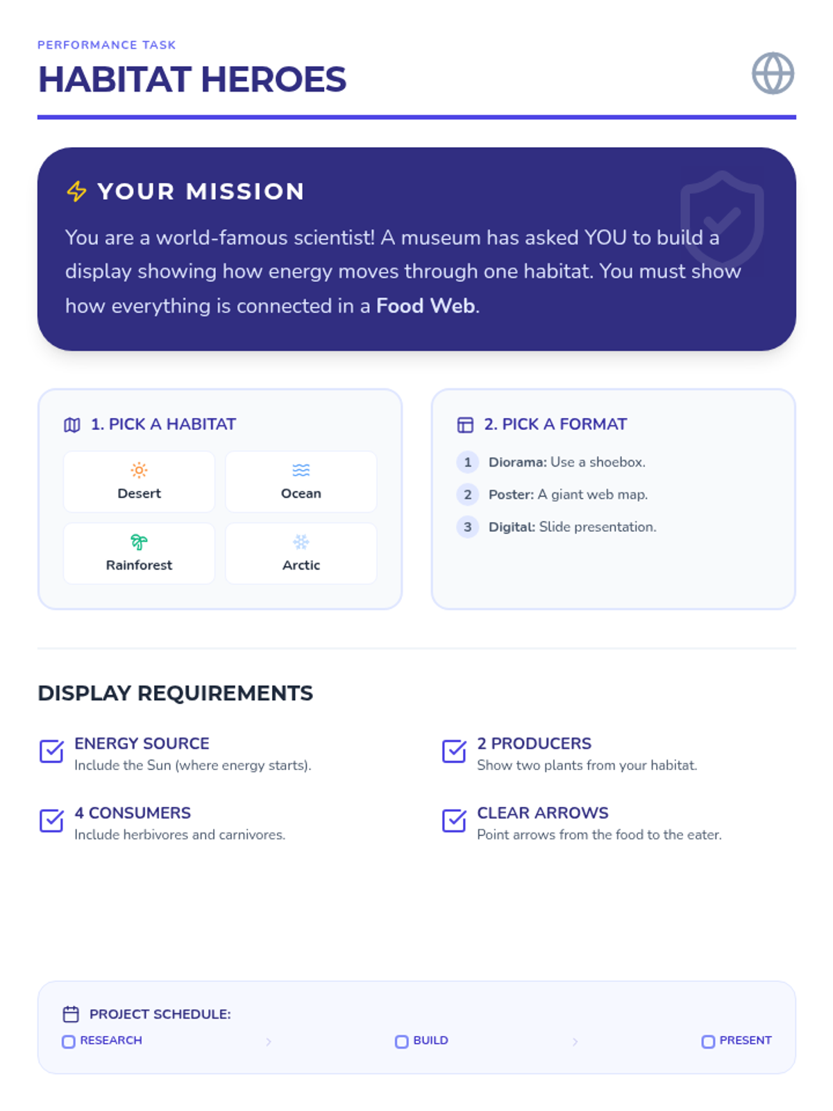 Students apply their knowledge of energy flow by researching a specific habitat and creating a comprehensive food web project.