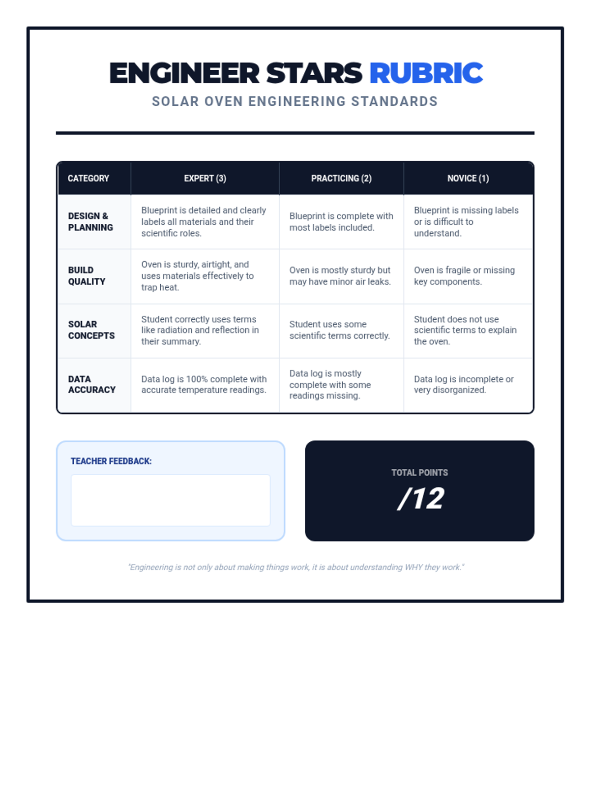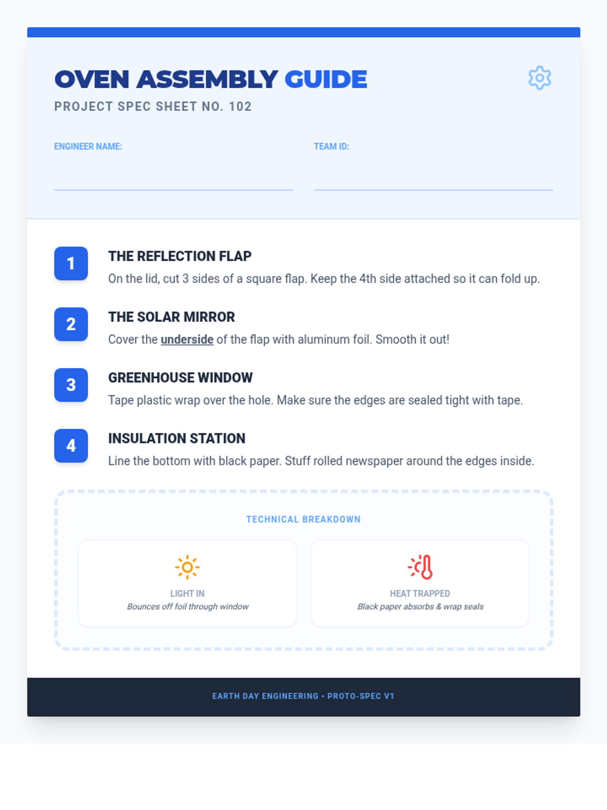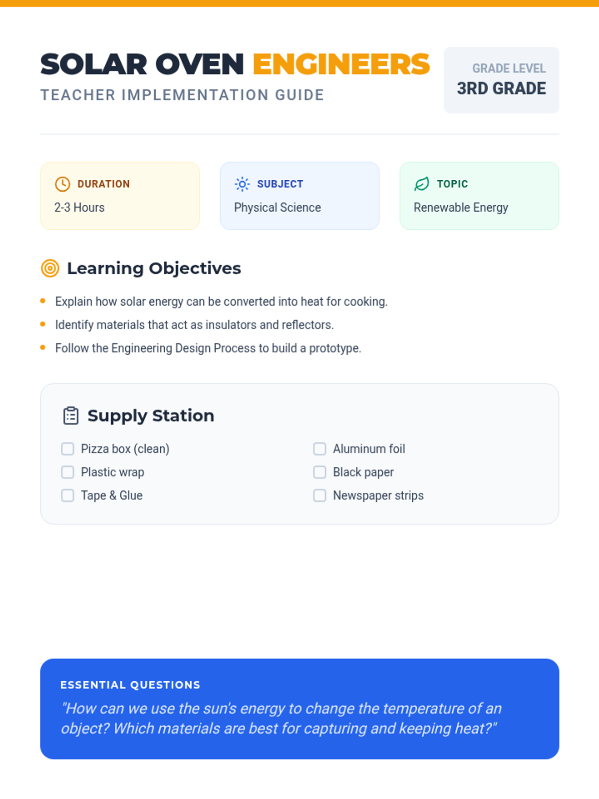 An Earth Day engineering challenge where 3rd graders design, build, and test solar ovens to explore renewable energy and heat transfer. Students apply the engineering design process to harness solar radiation for cooking simple snacks.