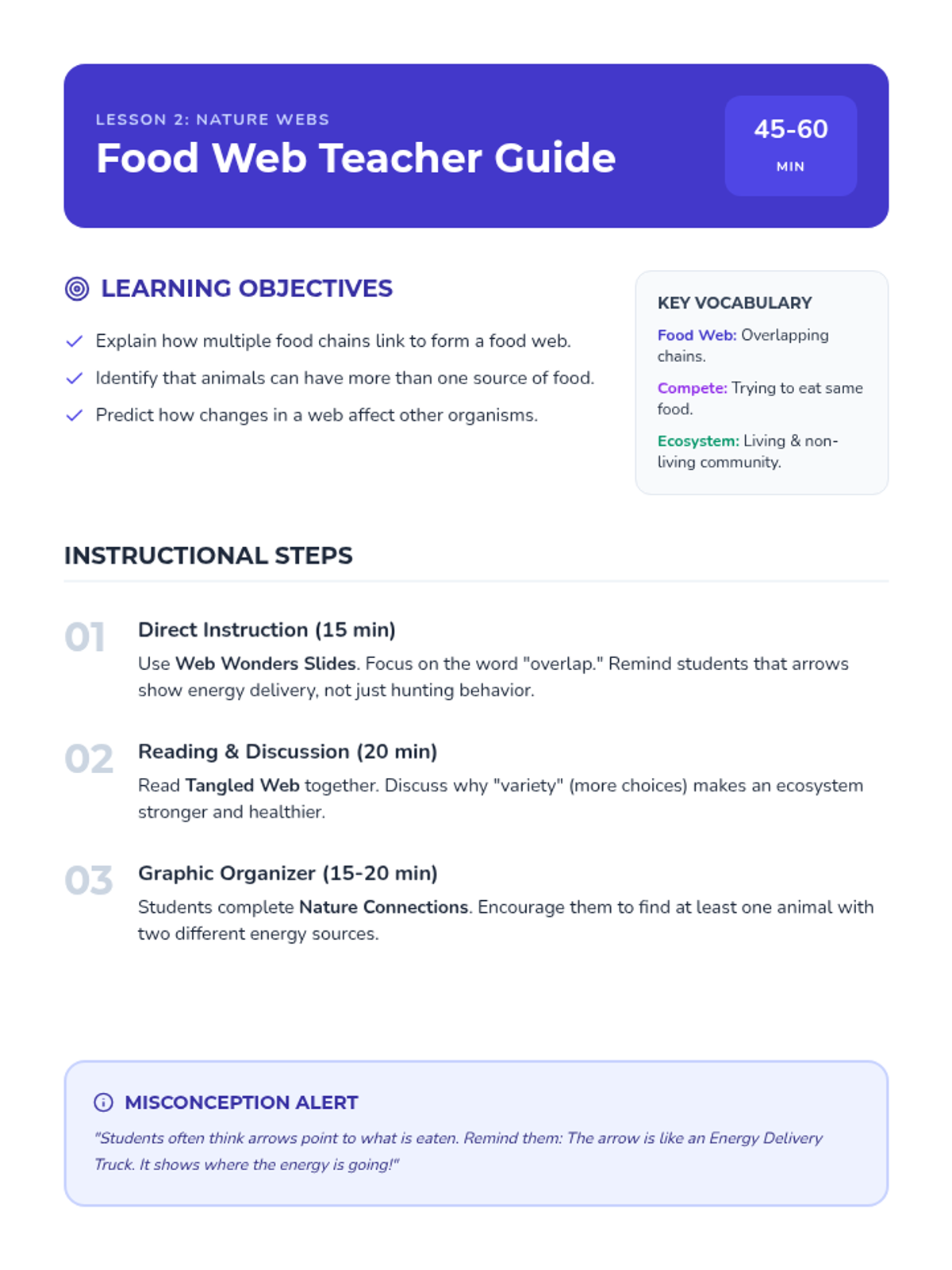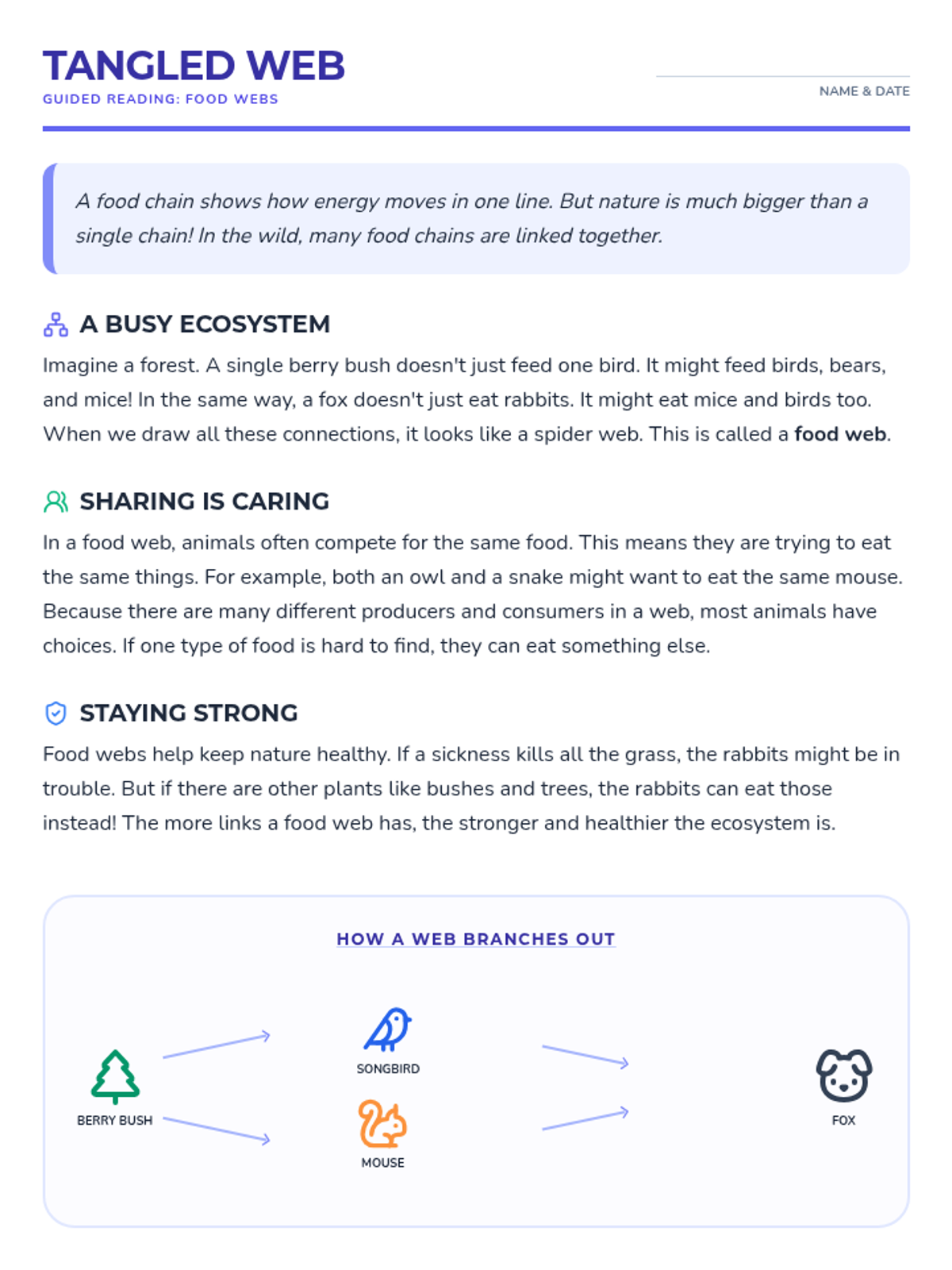Students explore how multiple food chains connect to create complex food webs, illustrating the interdependence of living things in an ecosystem.