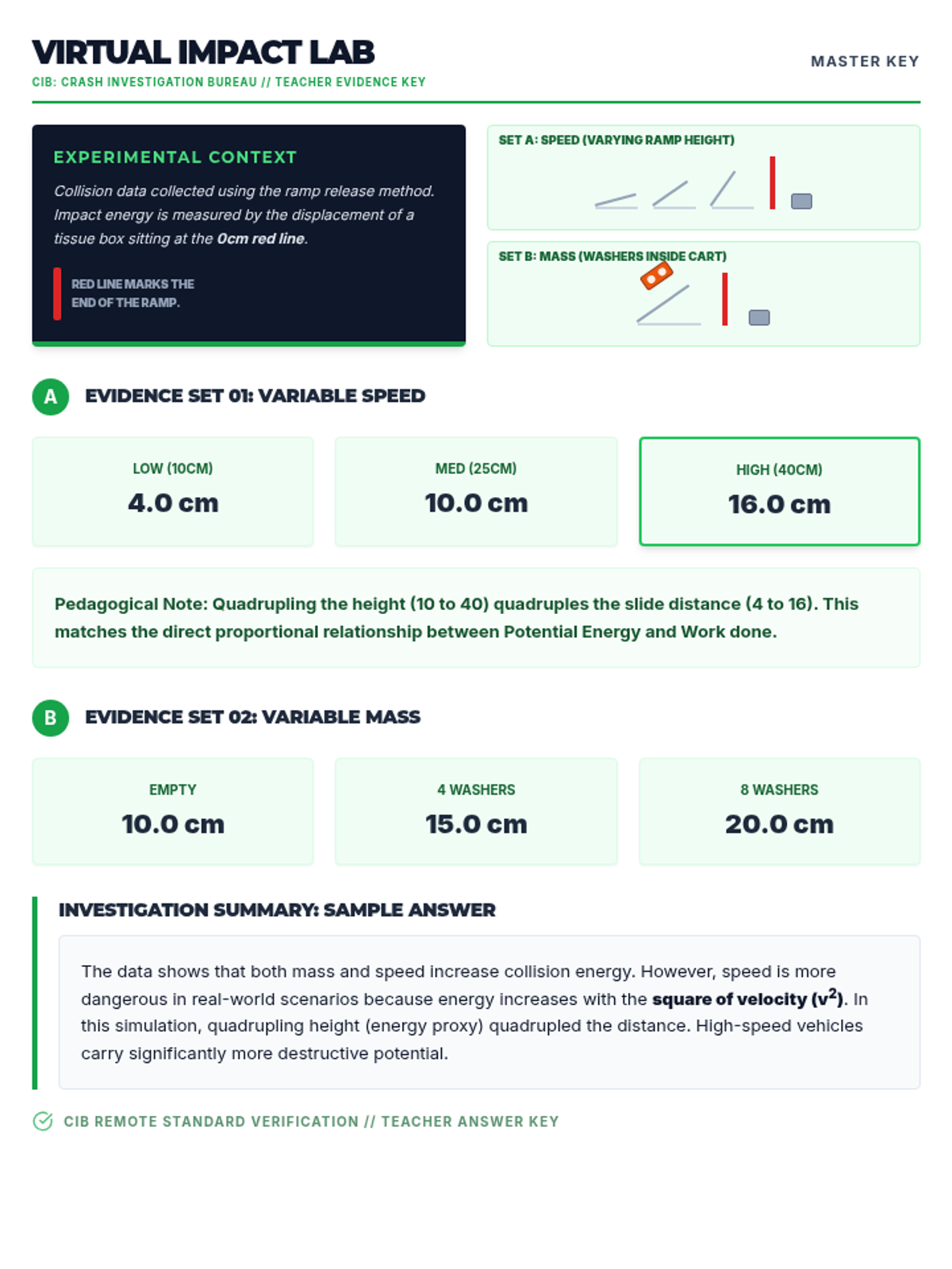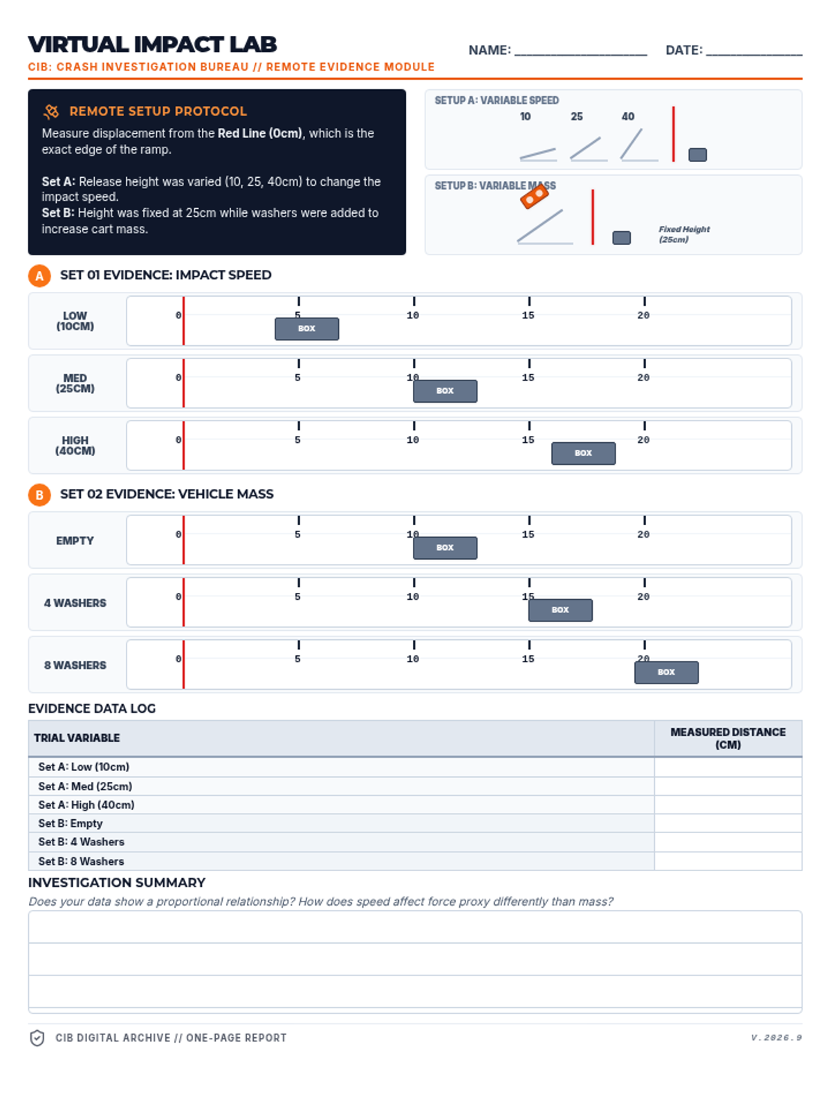 A hands-on interactive session where students investigate the relationship between mass, speed, and impact force using ramps and sliding targets.