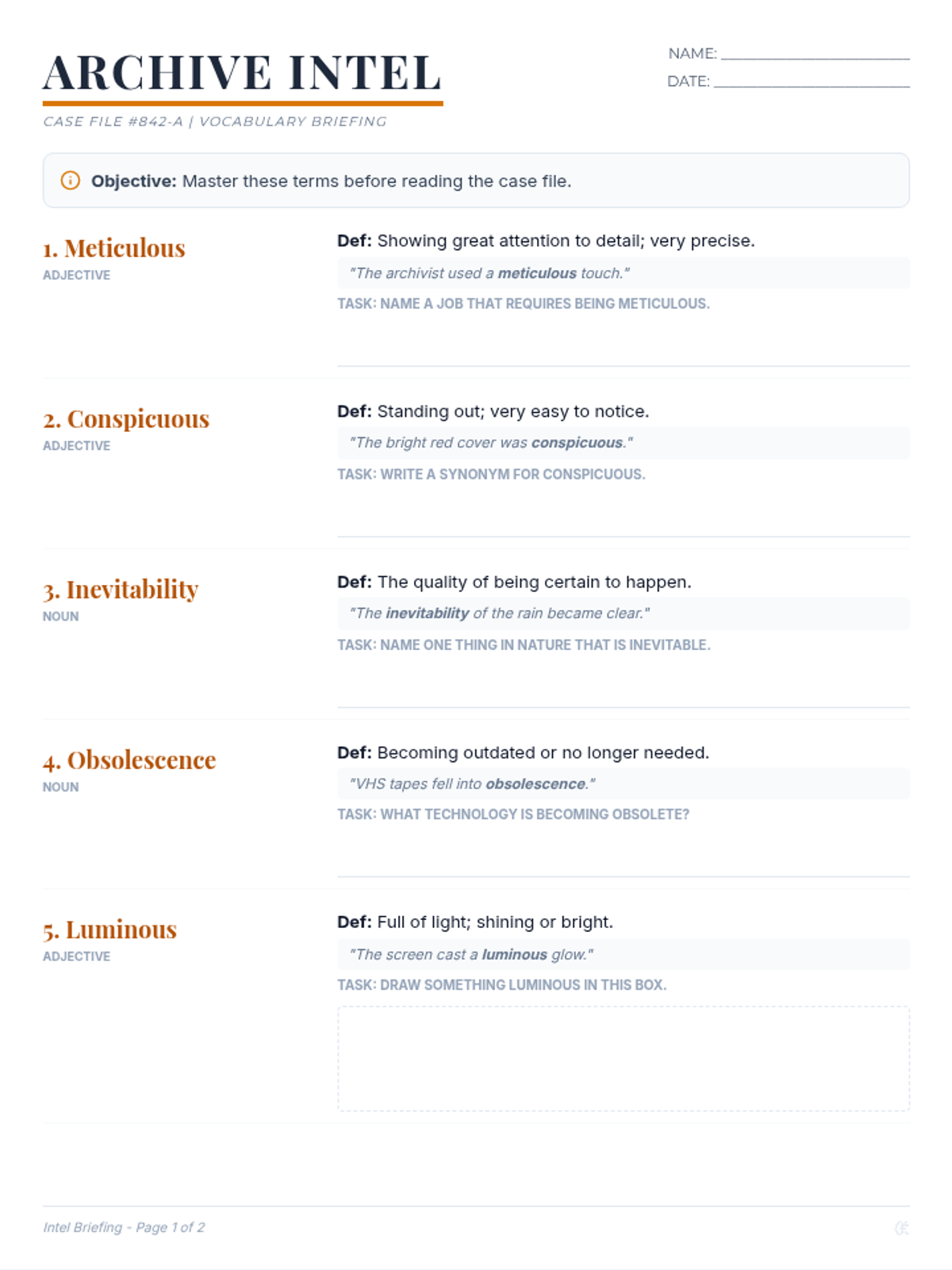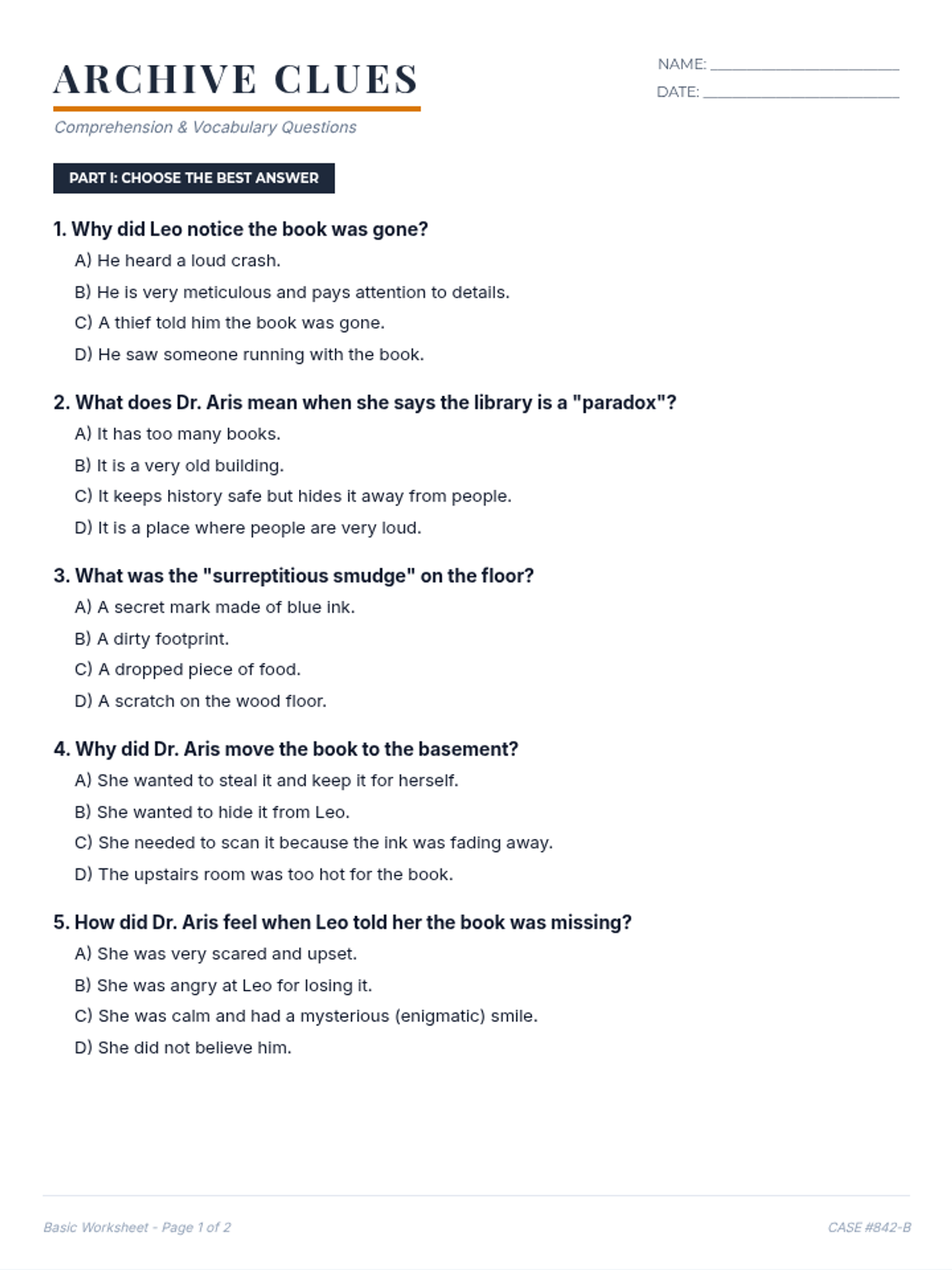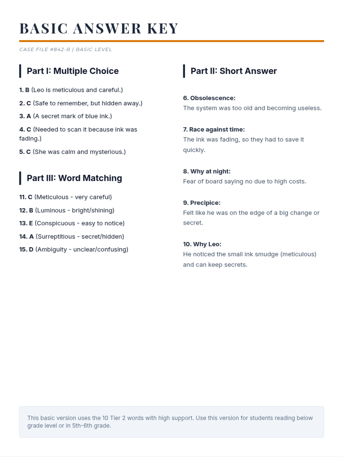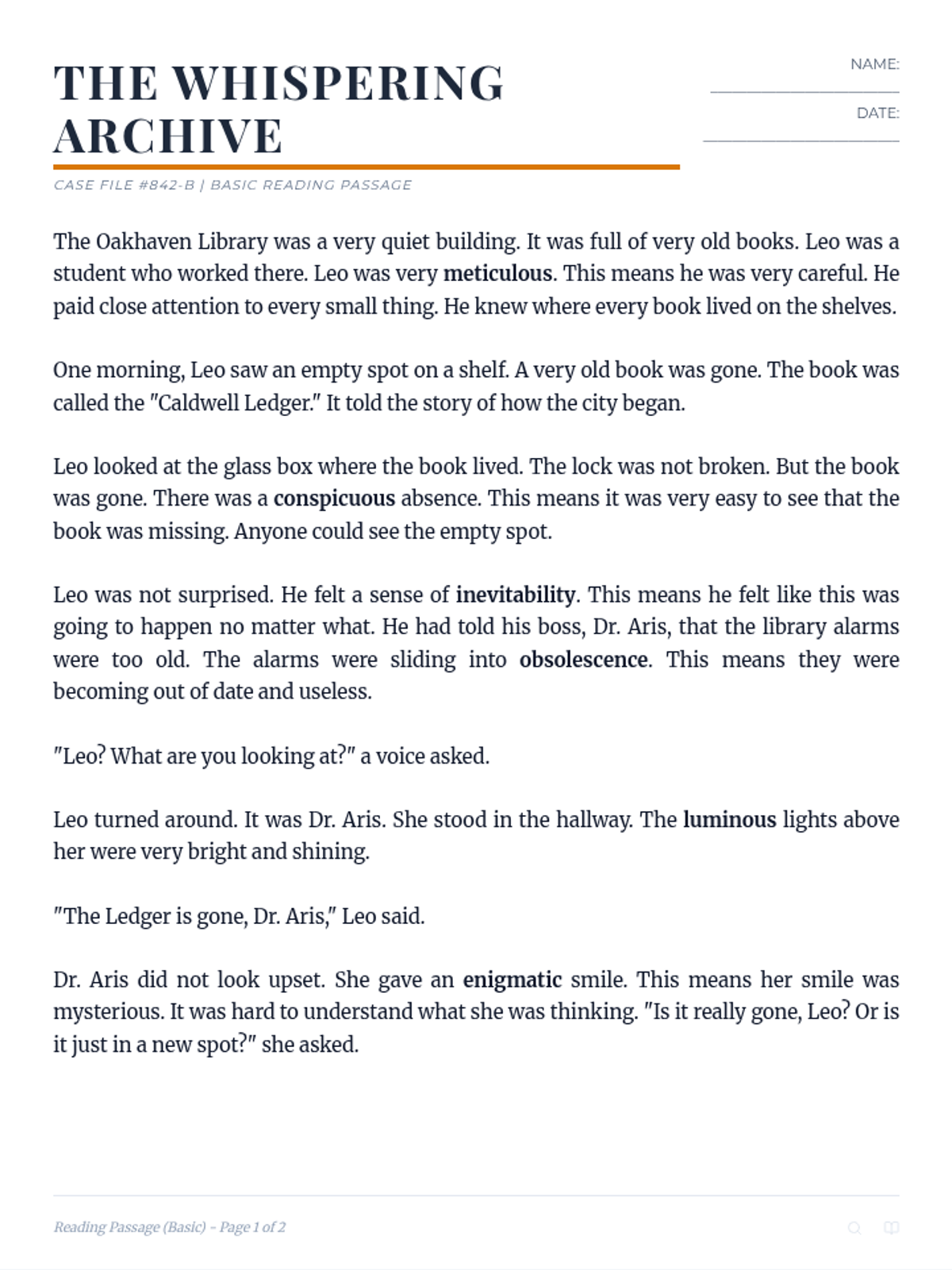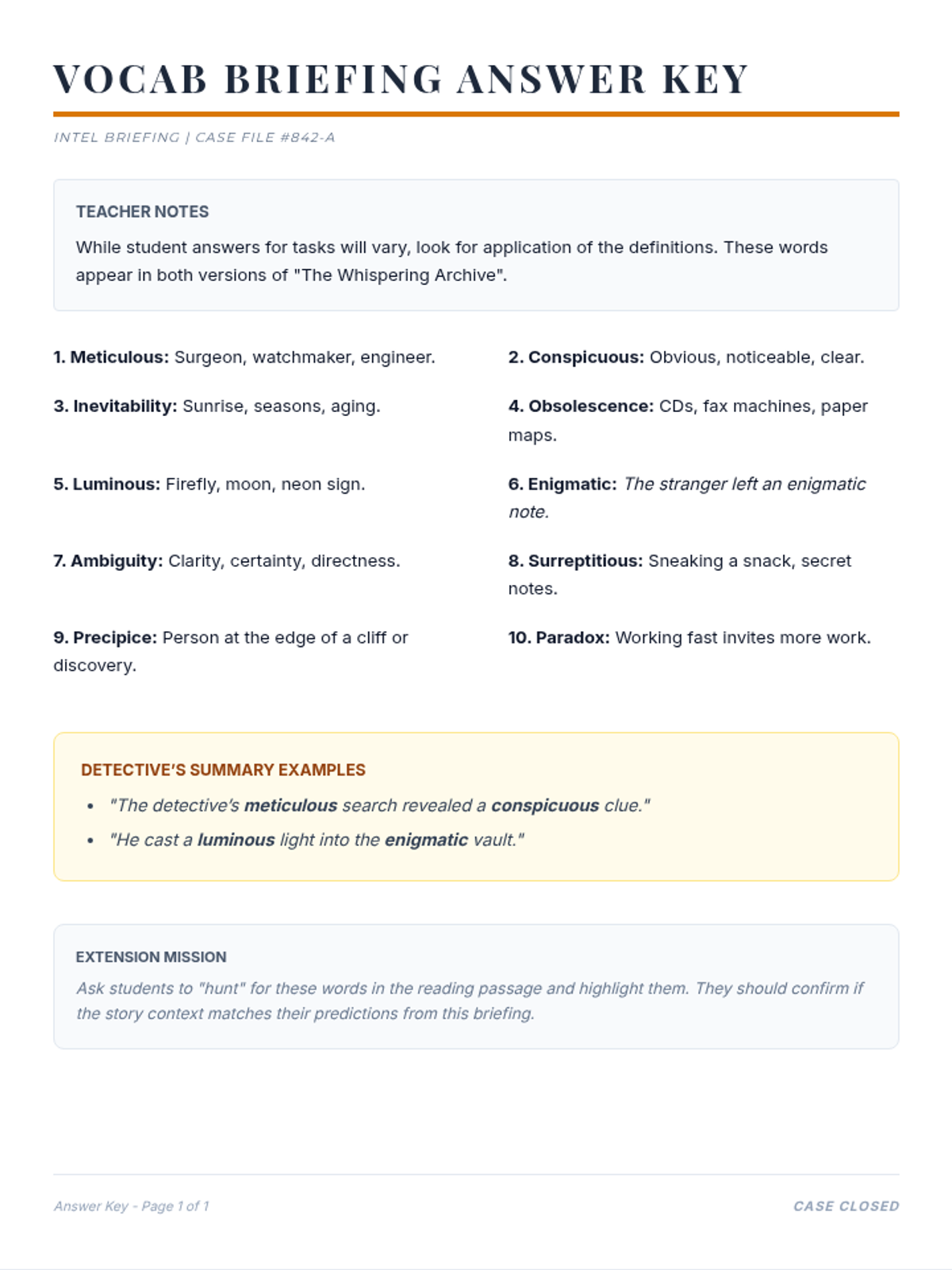 A mystery-themed reading comprehension lesson featuring a 2-page original fiction story and a comprehensive assessment focused on Tier 2 vocabulary and analytical skills.
