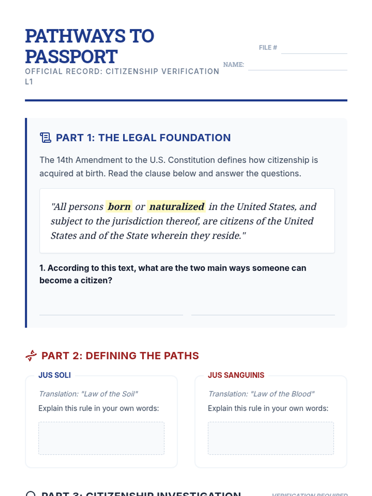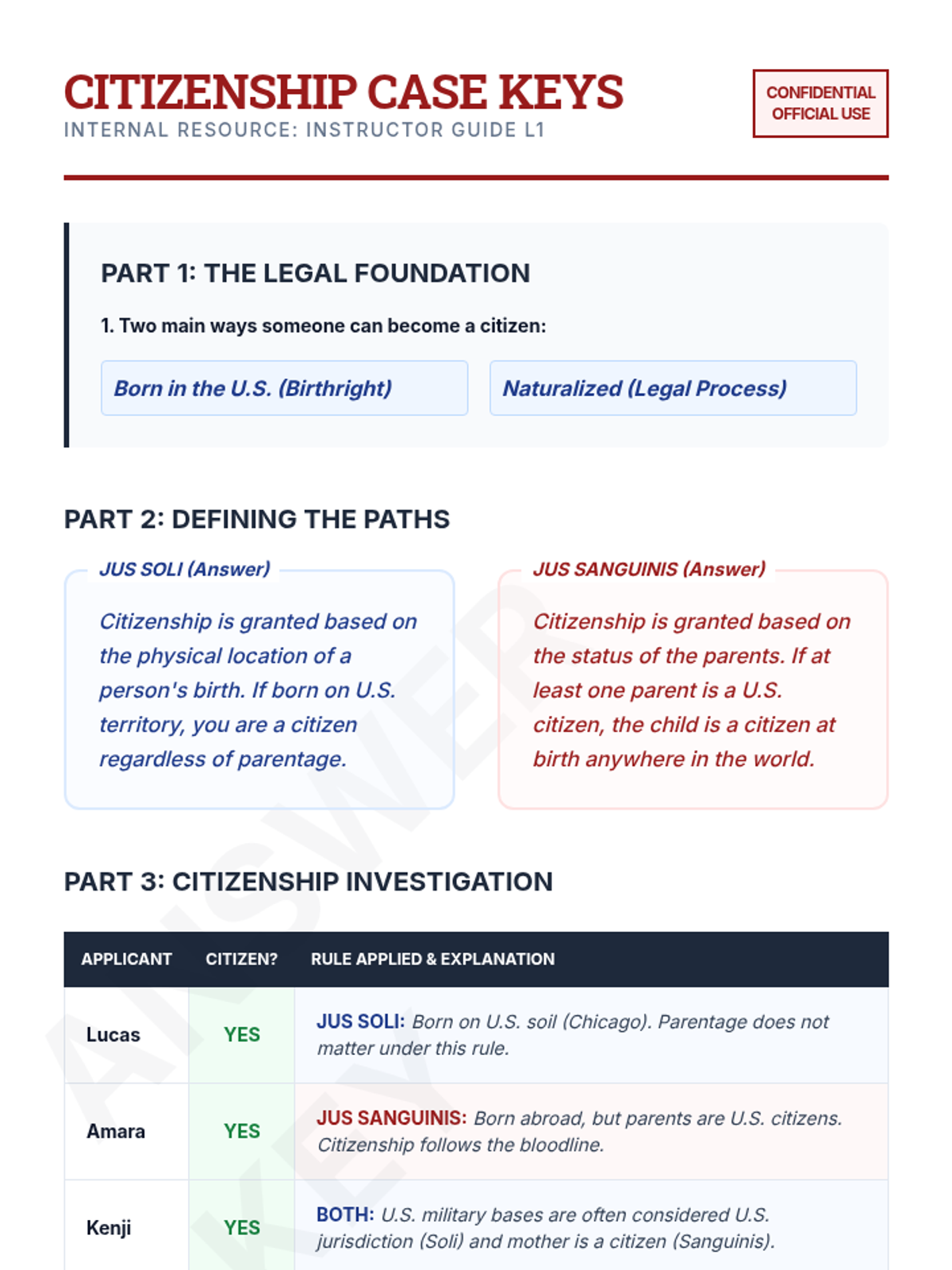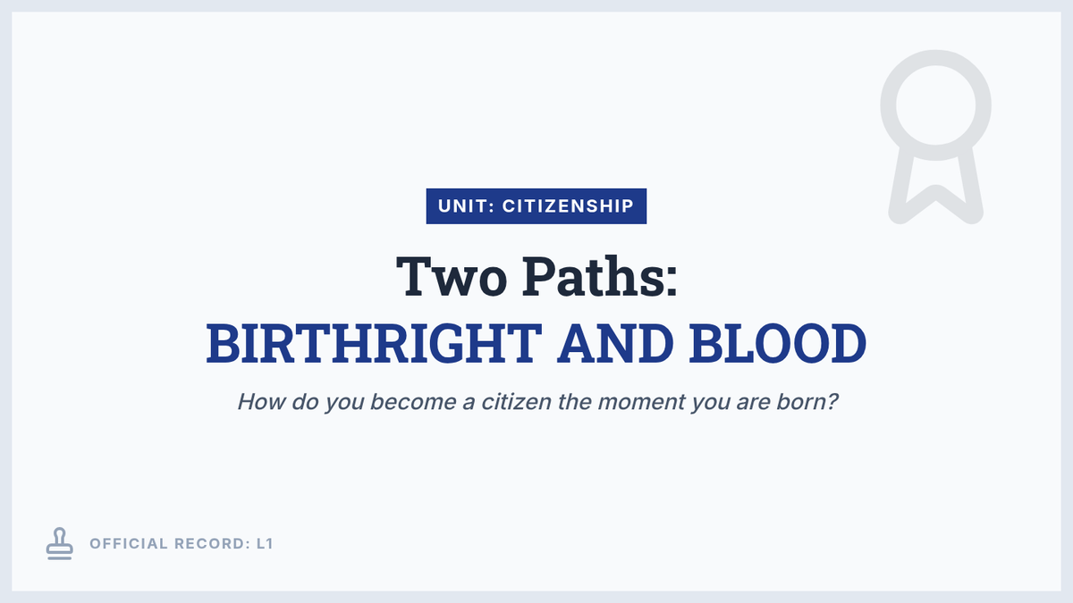 Analyze the 14th Amendment to understand the two primary ways one becomes a citizen at birth: Jus Soli (law of soil) and Jus Sanguinis (law of blood). Apply these concepts to complex scenarios.