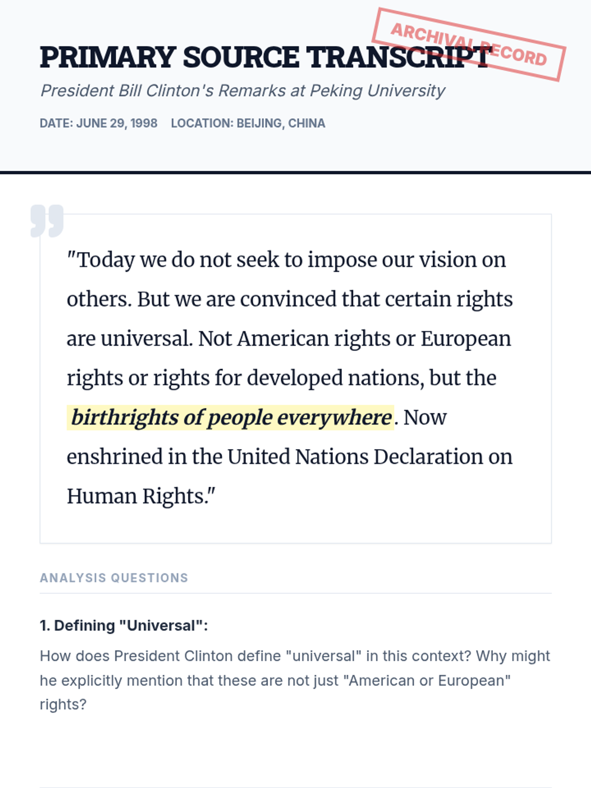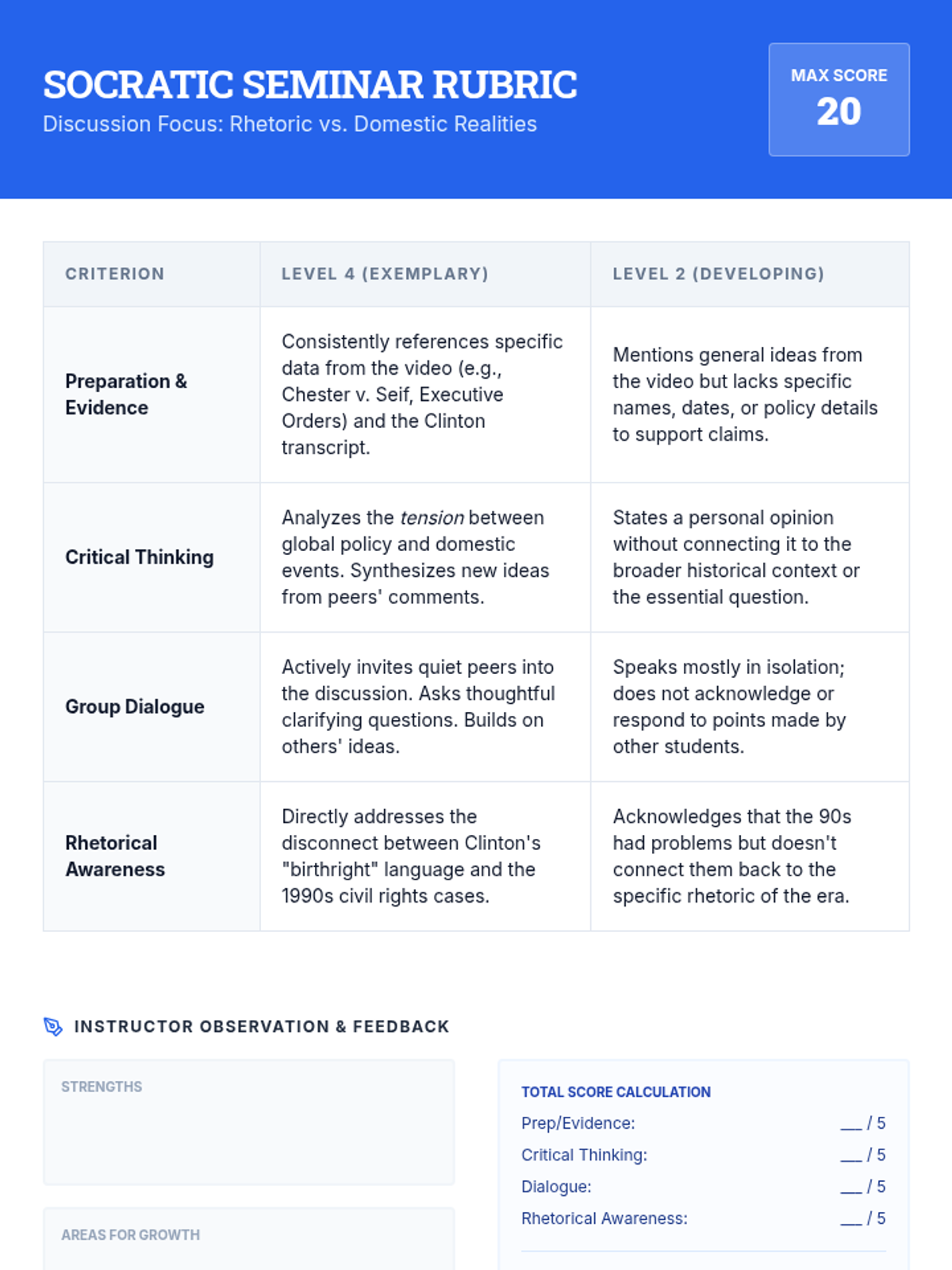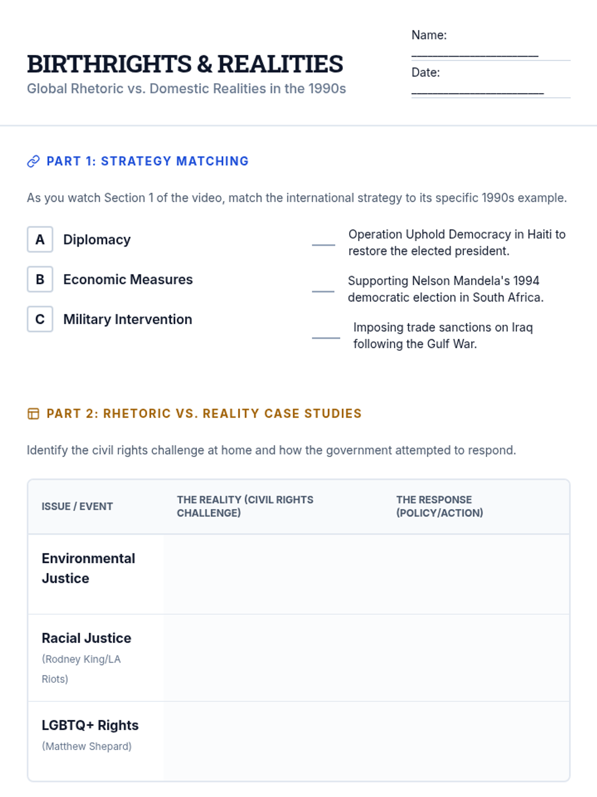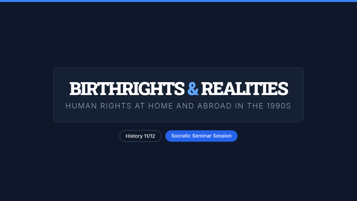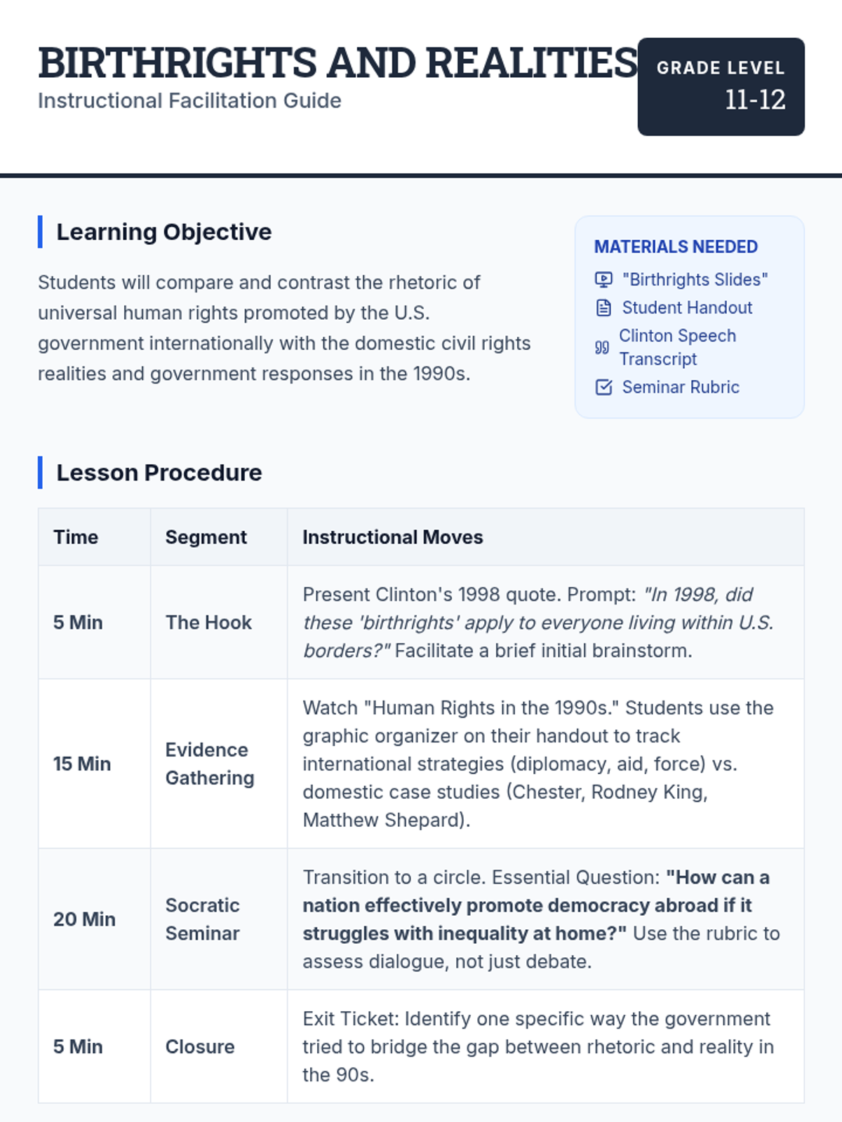 A high school history lesson exploring the tension between the U.S. government's international promotion of human rights and the domestic civil rights struggles of the 1990s, featuring a Socratic Seminar and video analysis.