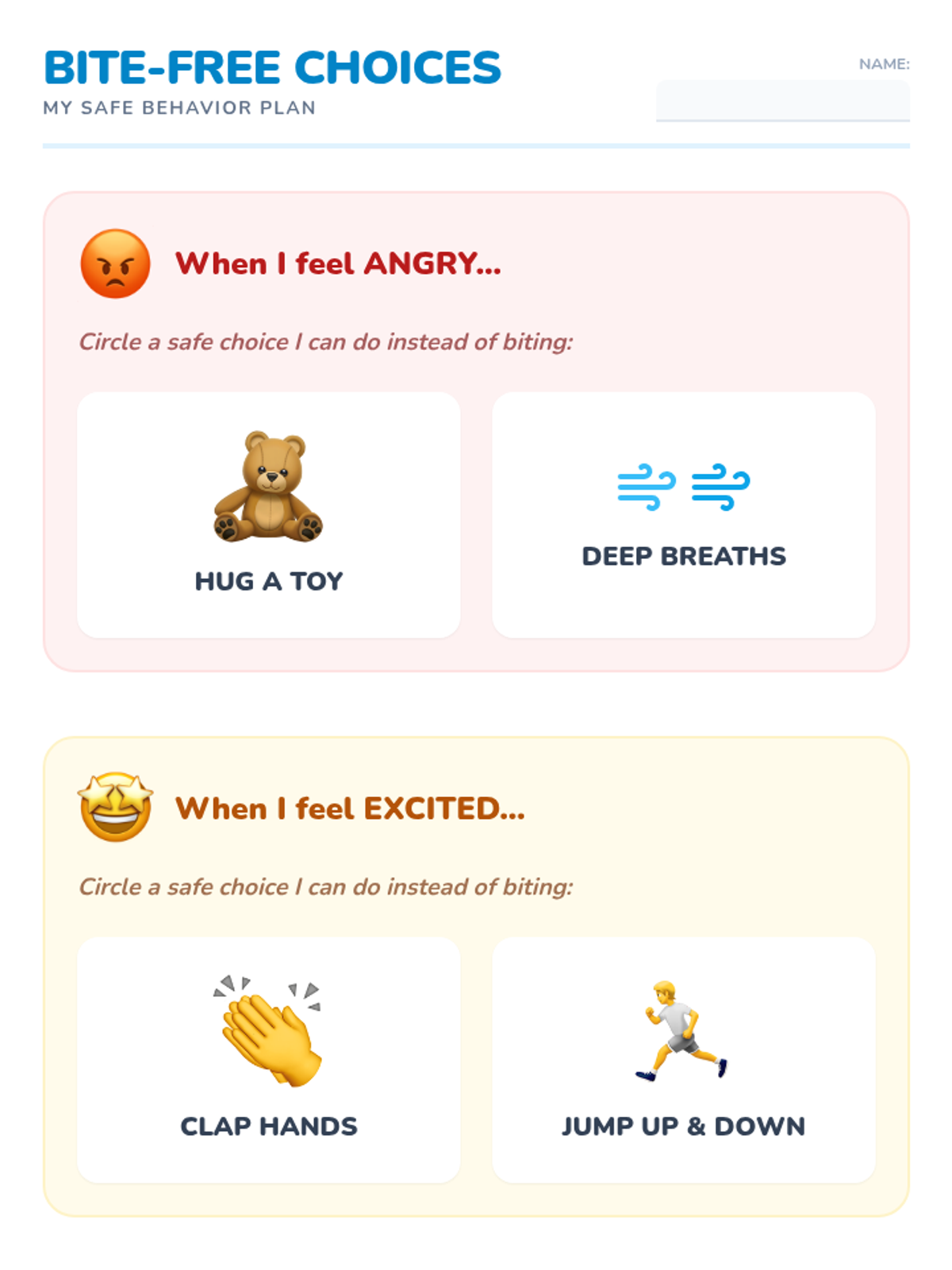 A Tier 3 intervention lesson for young nonverbal autistic students focused on reducing biting behavior through emotional recognition and safe alternative choices.
