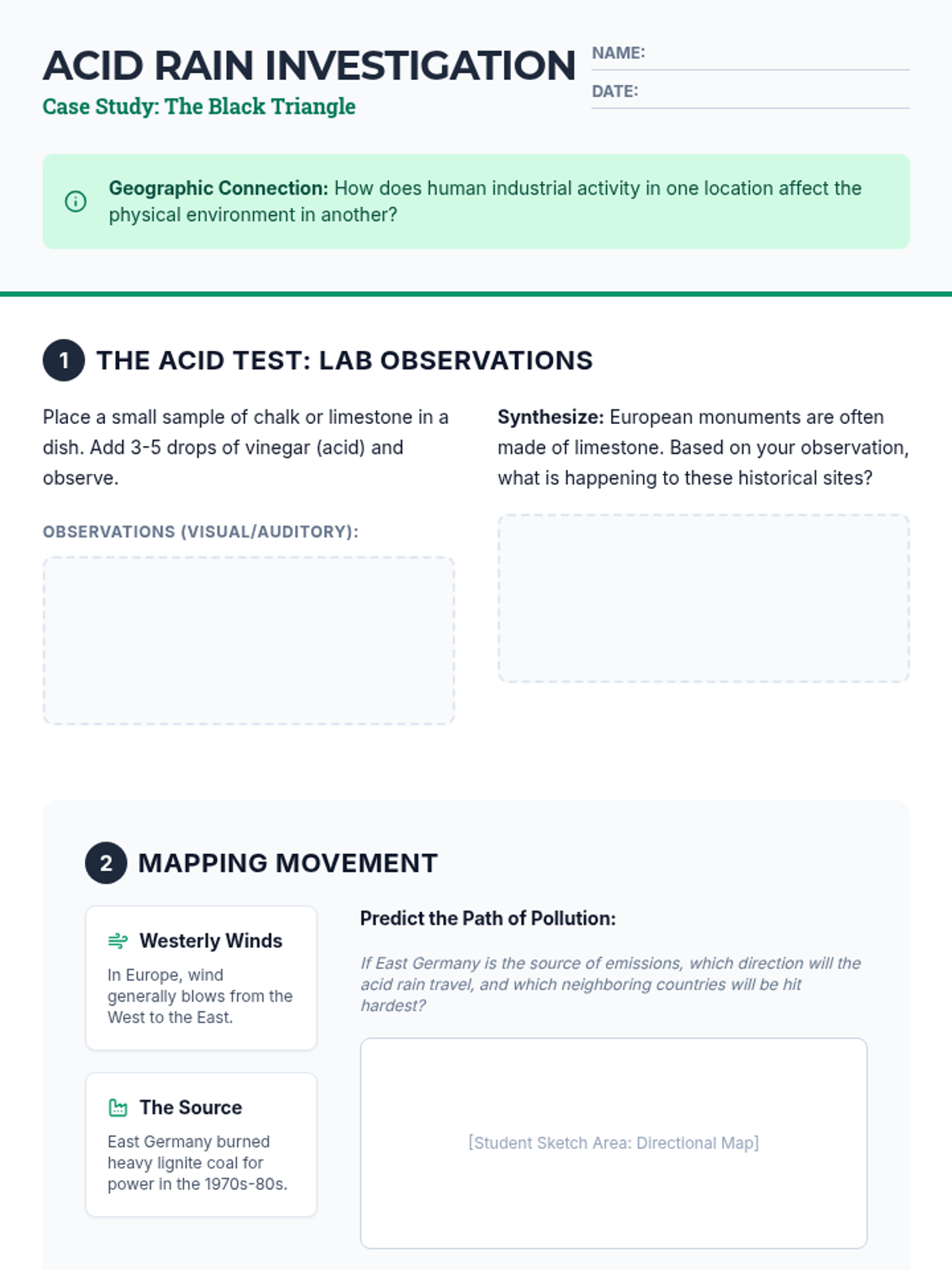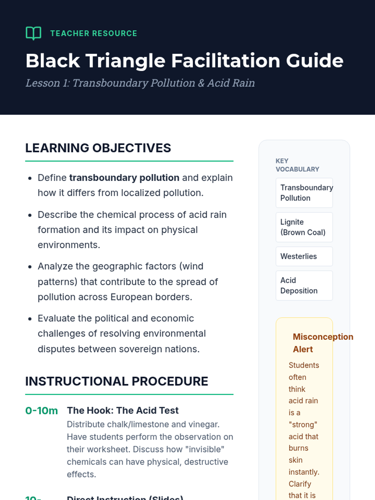 Investigate the 'Black Triangle' region to understand how industrial emissions in one country cause acid rain that destroys forests in another.