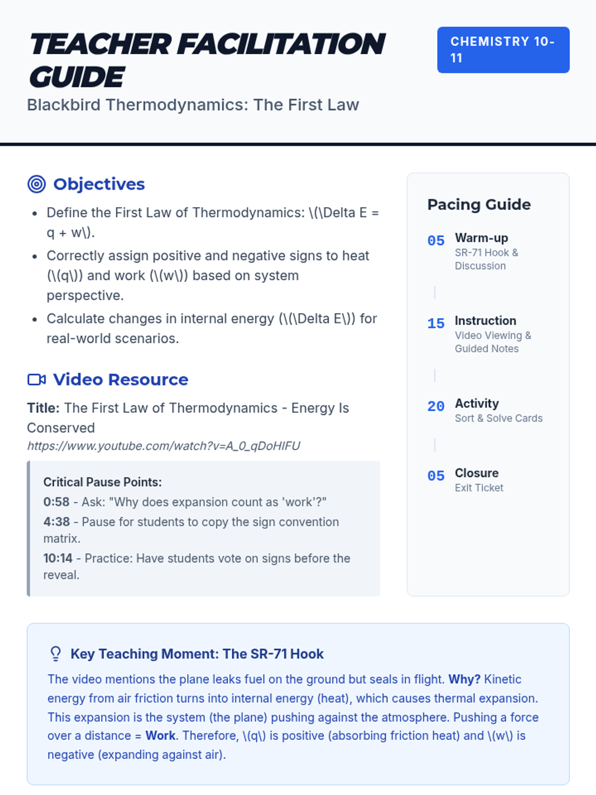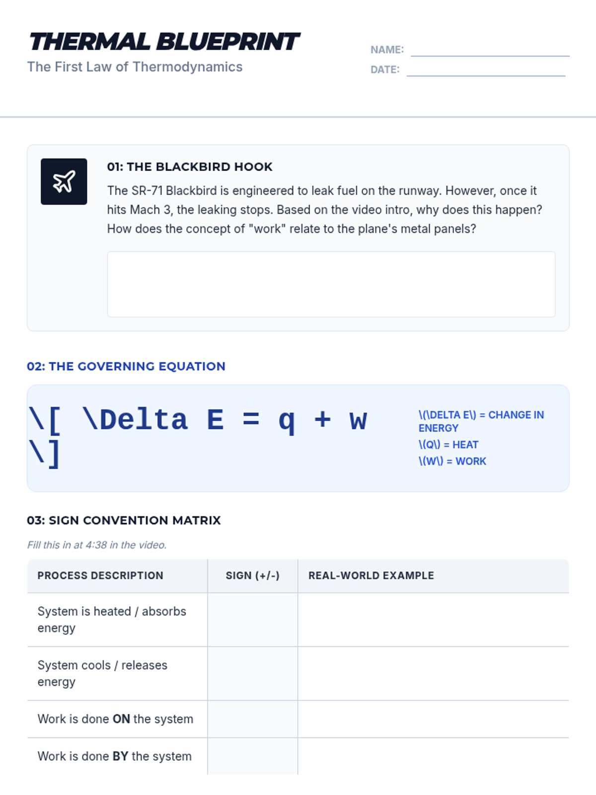 A high school chemistry lesson exploring the First Law of Thermodynamics through the lens of the SR-71 Blackbird, focusing on sign conventions for heat (q) and work (w).