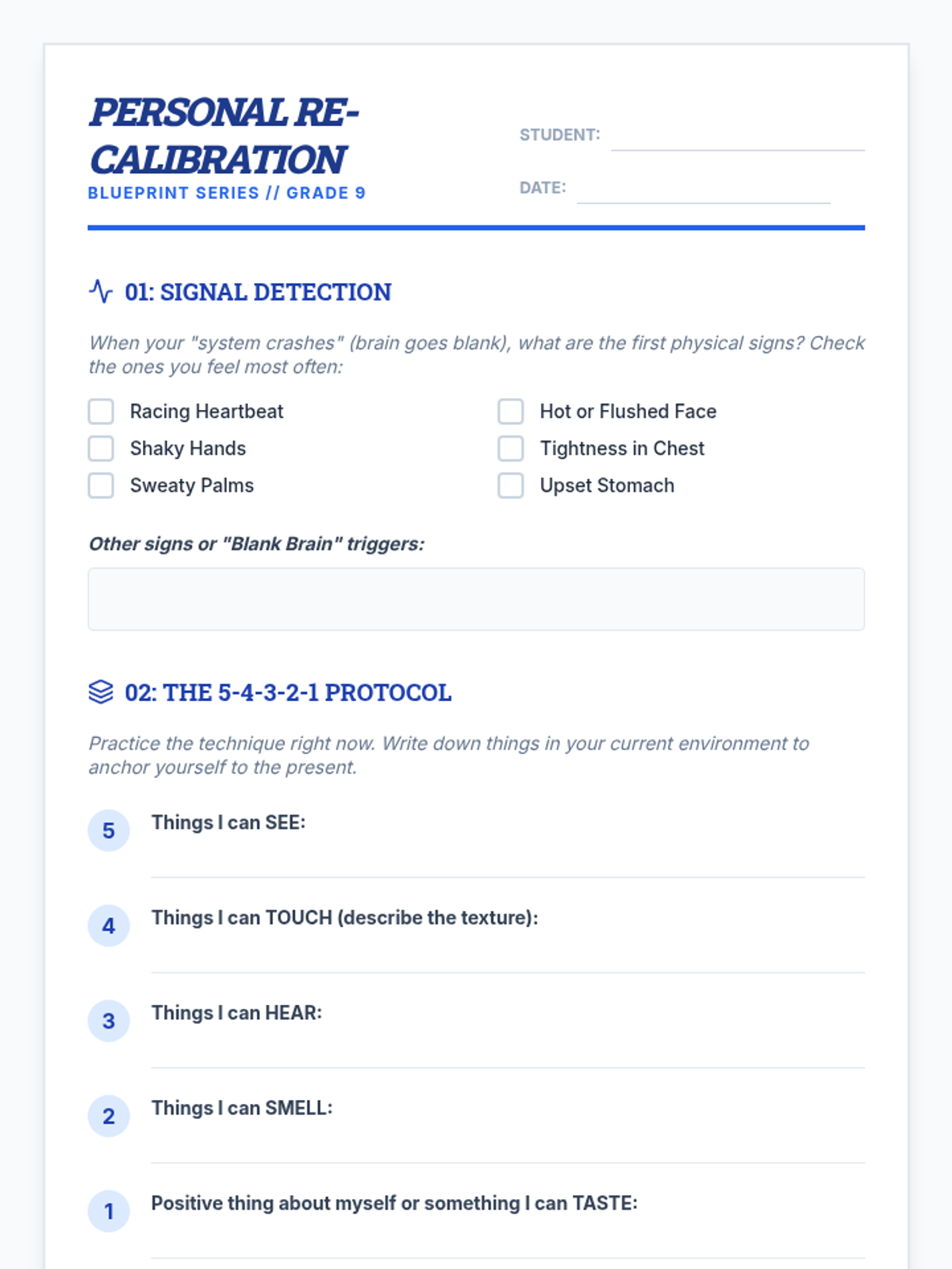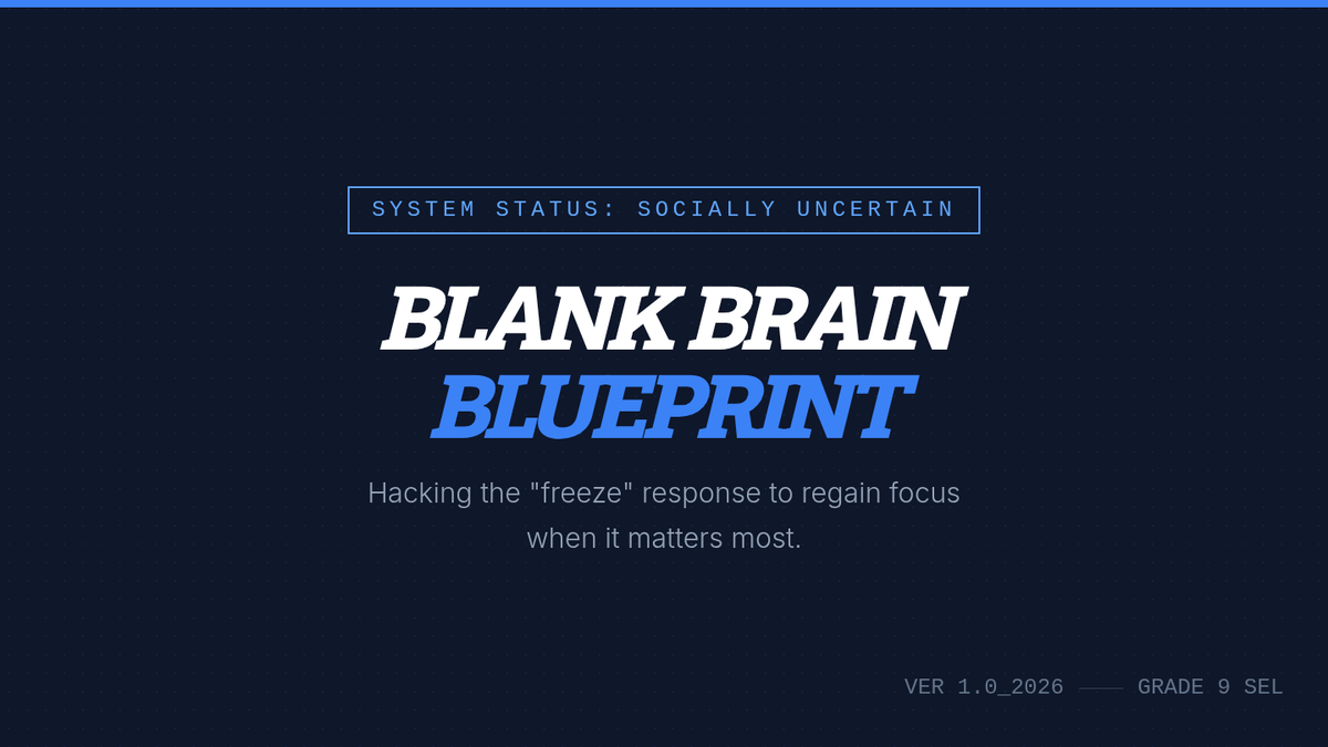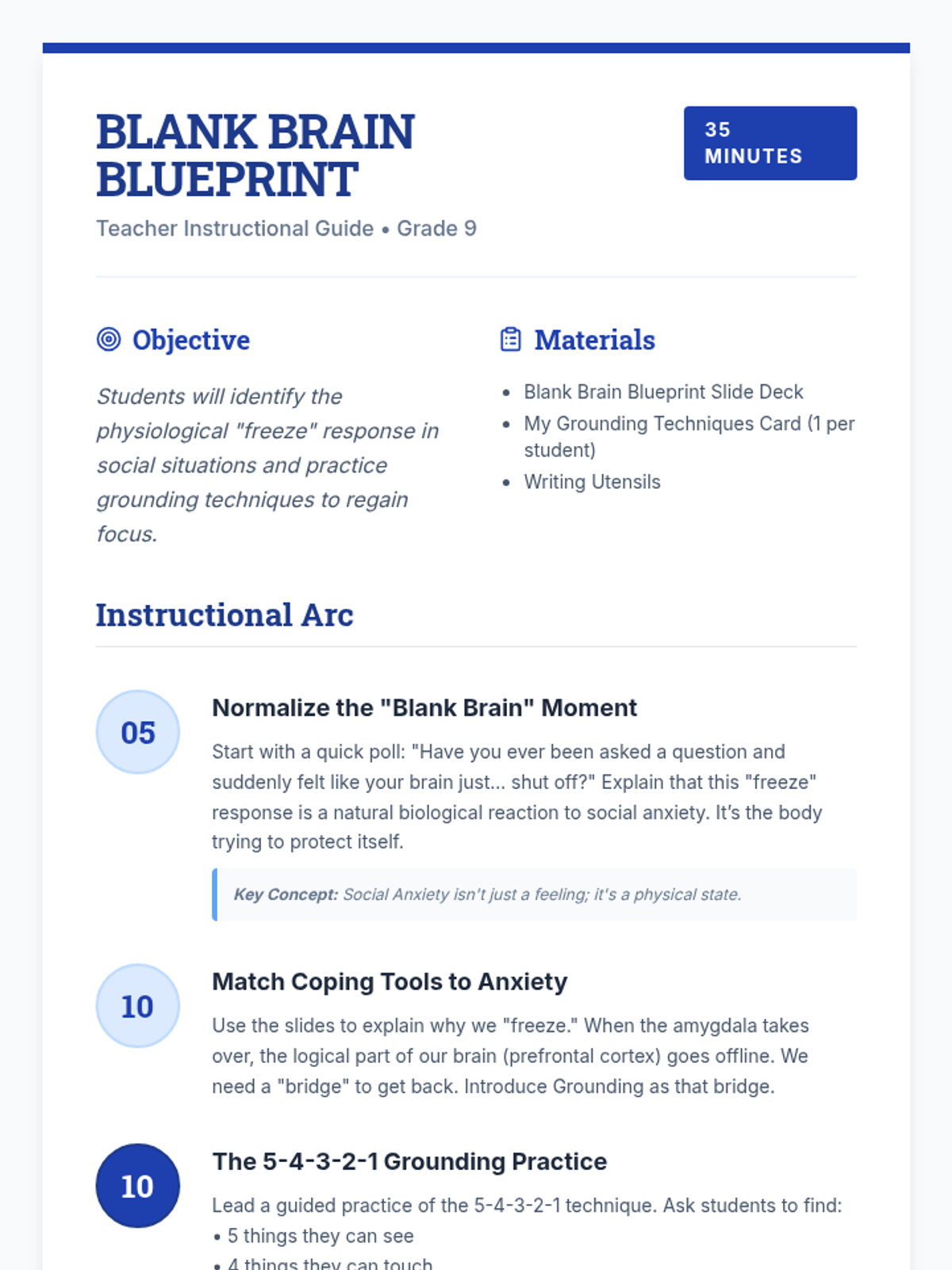A 35-minute lesson focused on identifying the physiological response of social anxiety and practicing grounding techniques to regain focus during 'blank brain' moments.