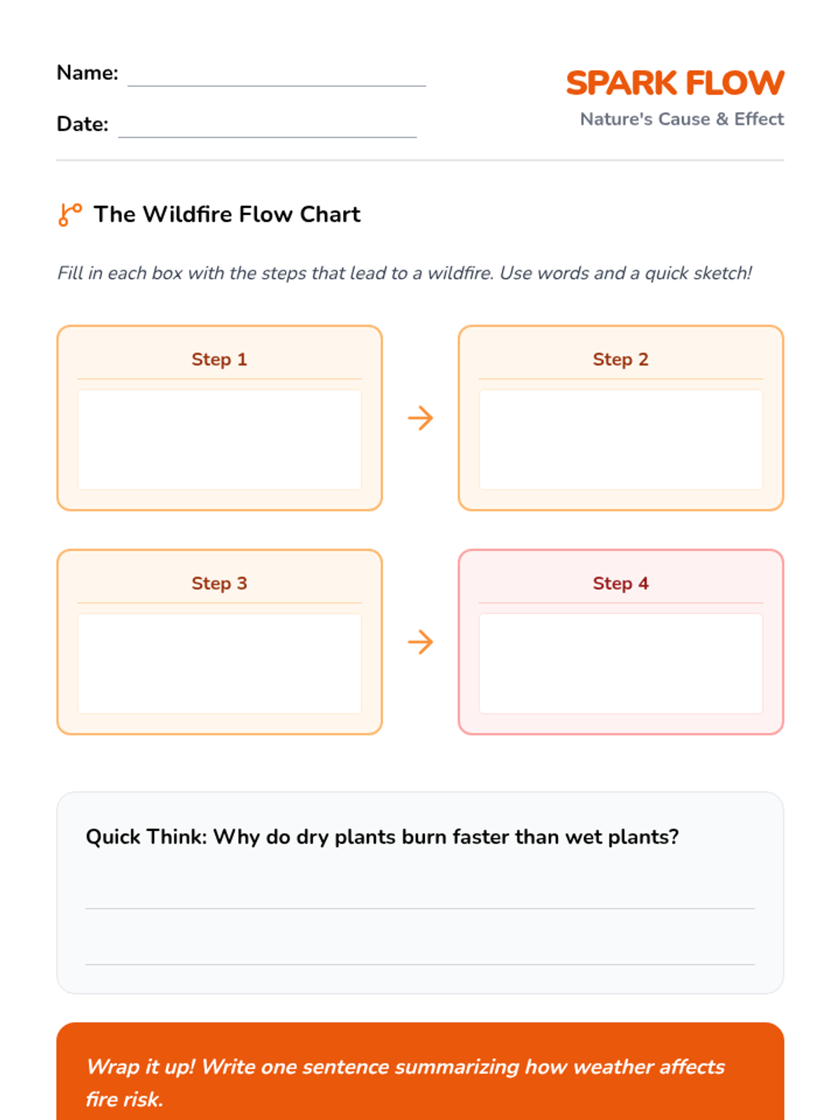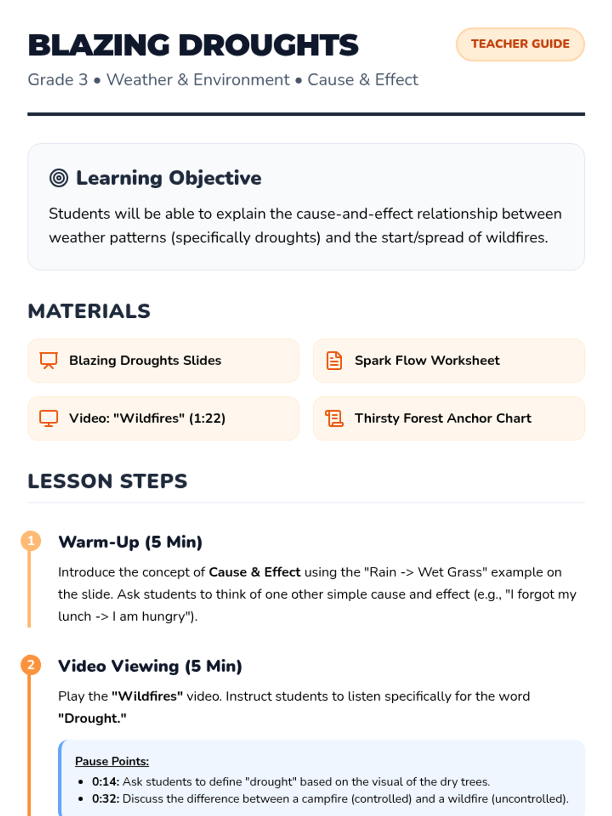 A 3rd-grade lesson exploring how drought conditions lead to wildfires through a cause-and-effect flow chart and video analysis.