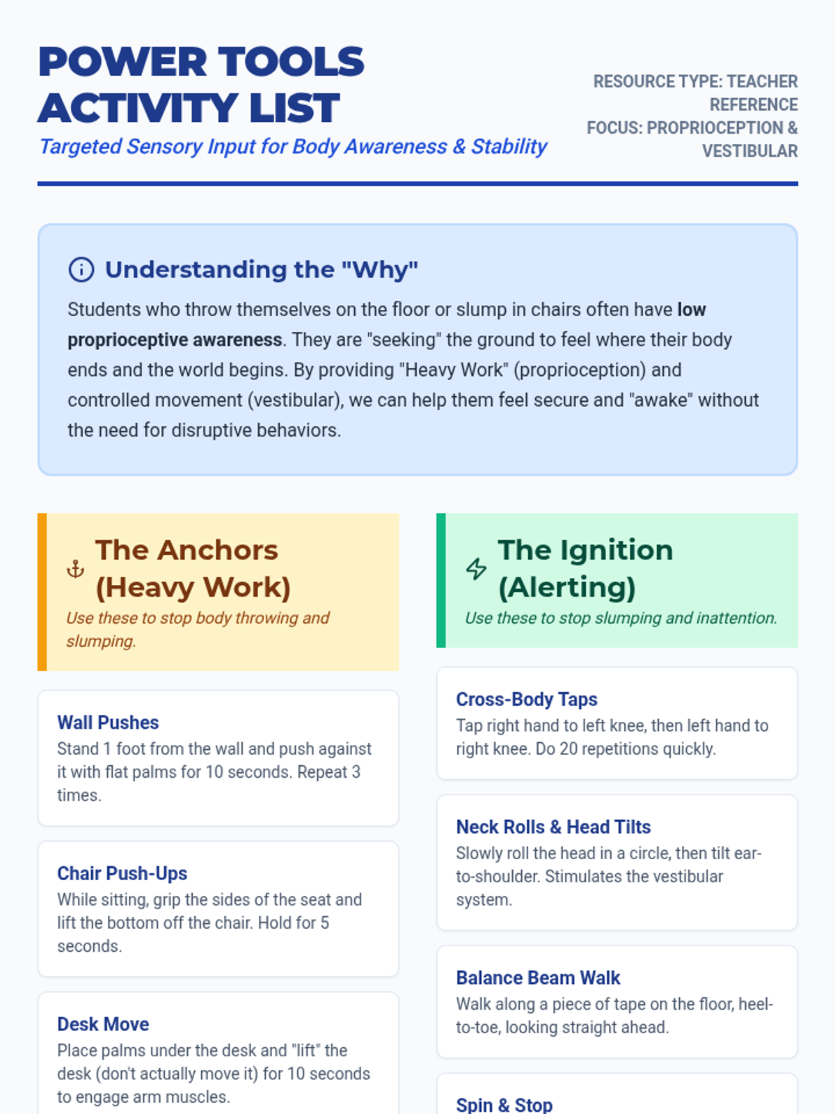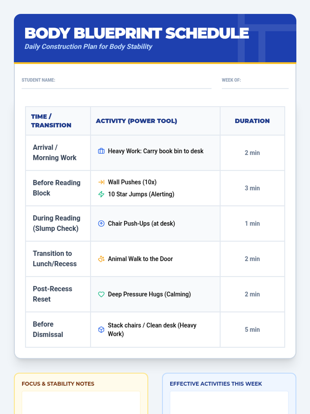 A comprehensive sensory diet protocol designed for a first-grade student to improve body awareness, reduce postural slumping, and minimize floor-throwing behaviors through targeted heavy work and movement breaks.