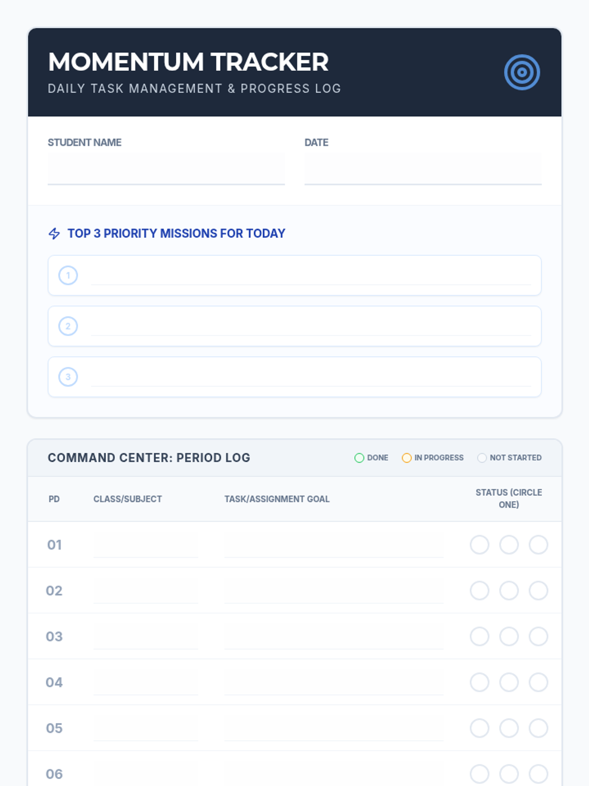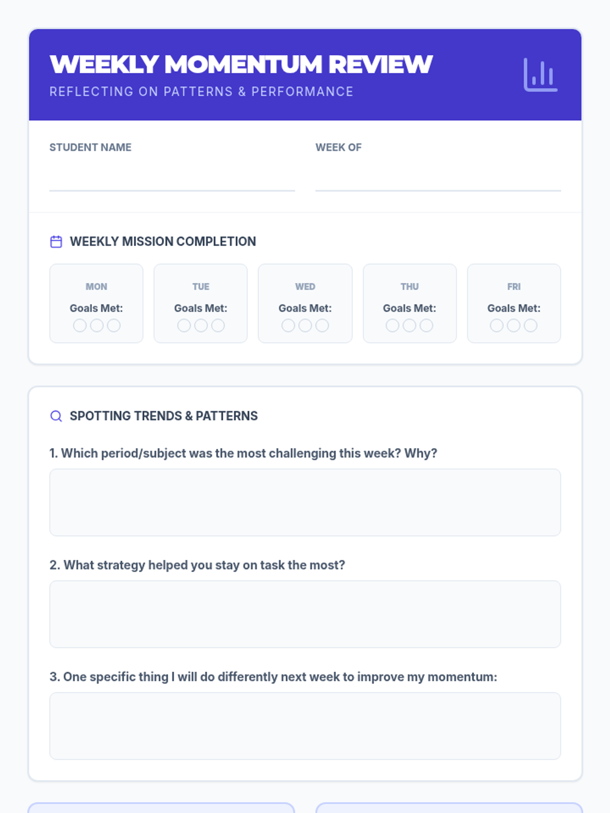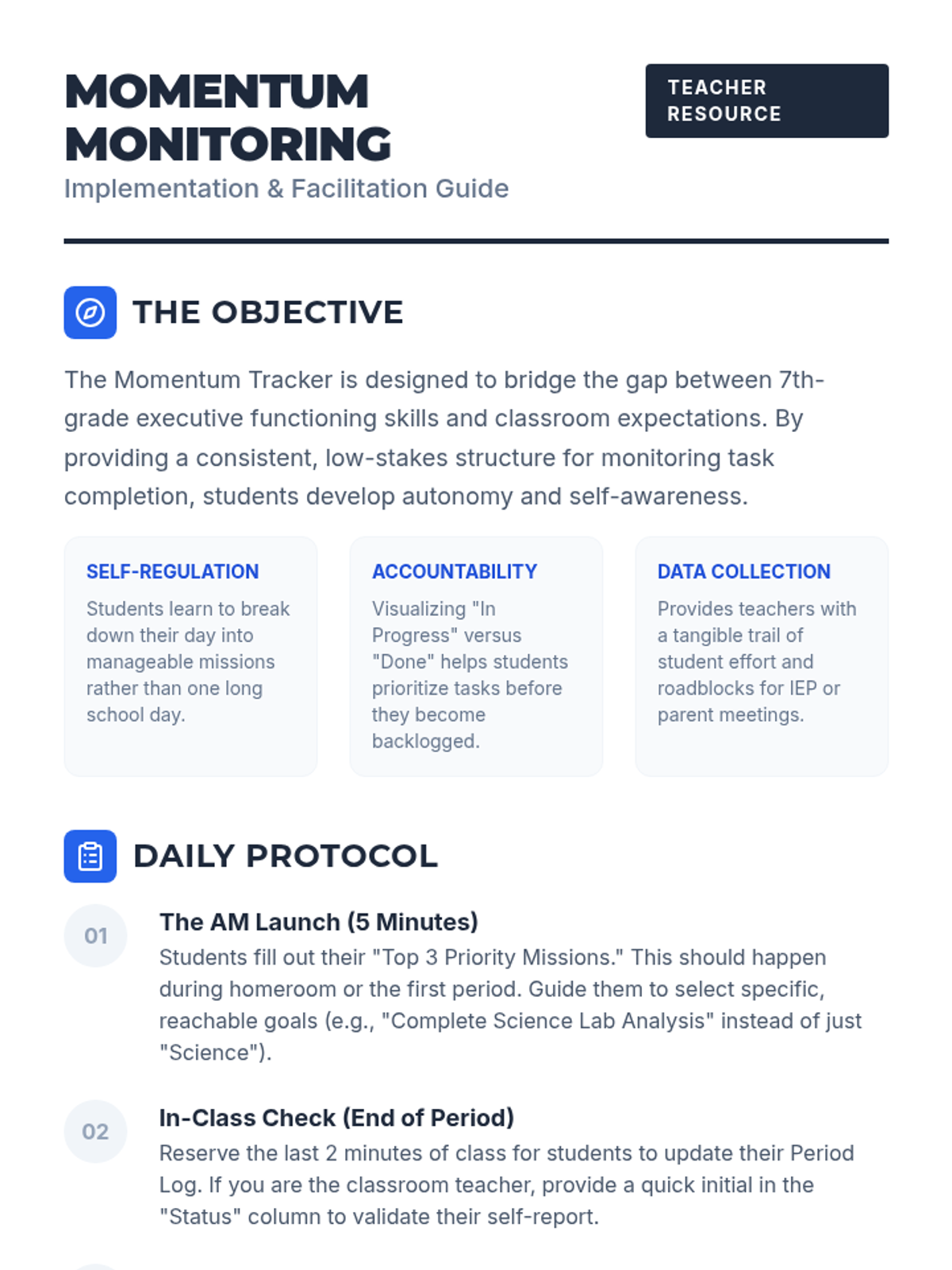 A system for students to self-monitor their task completion and for teachers to track daily progress using structured check-in tools.