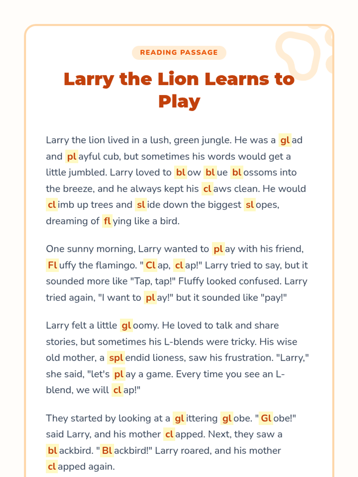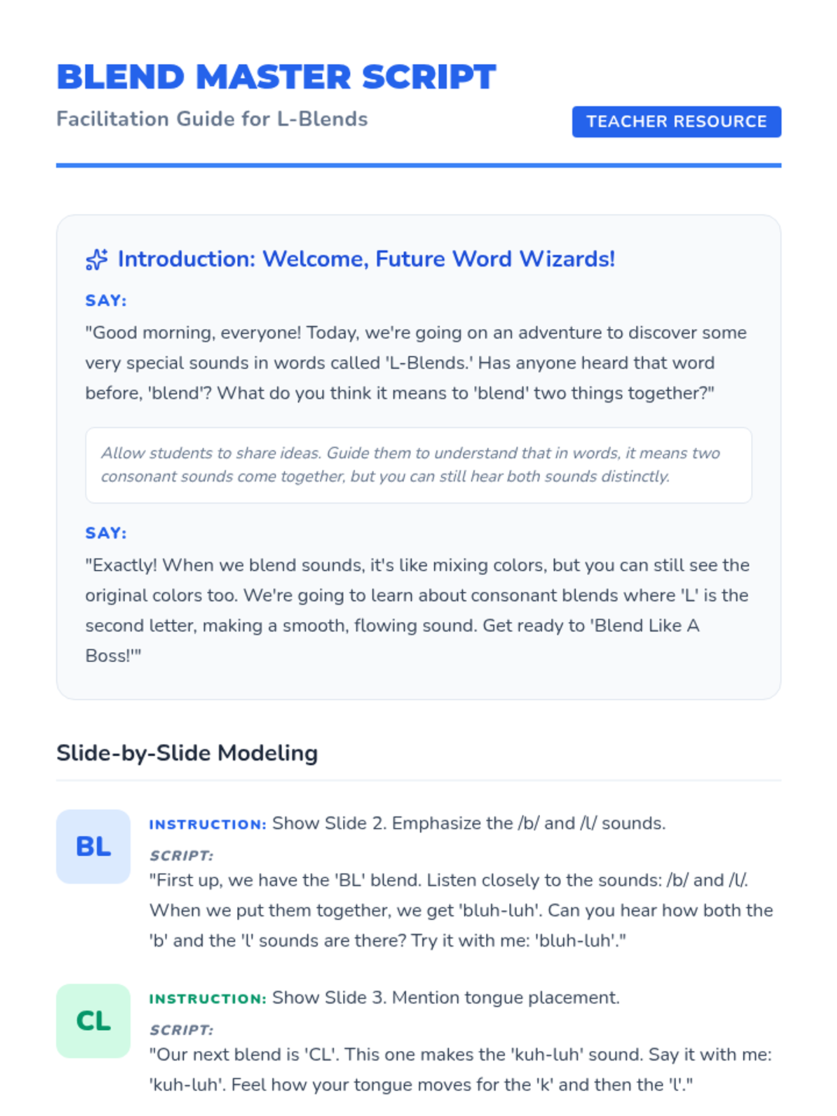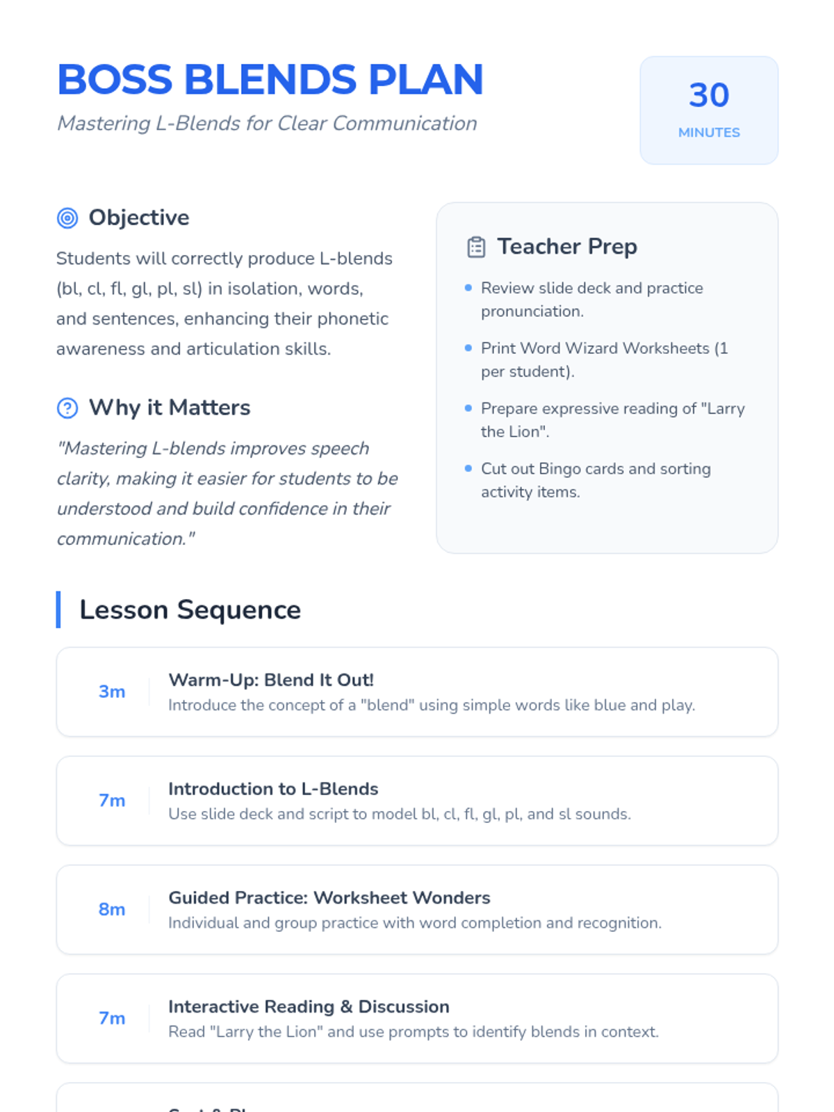 A comprehensive 30-minute speech therapy lesson designed for elementary students to master L-blends (bl, cl, fl, gl, pl, sl) through interactive slides, storytelling, and hands-on games.