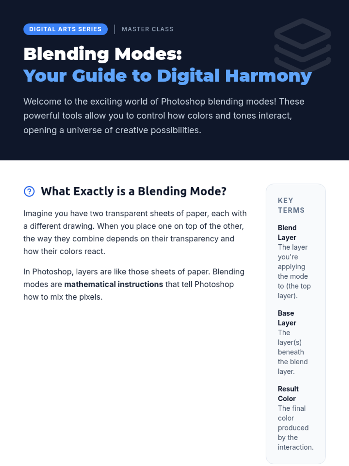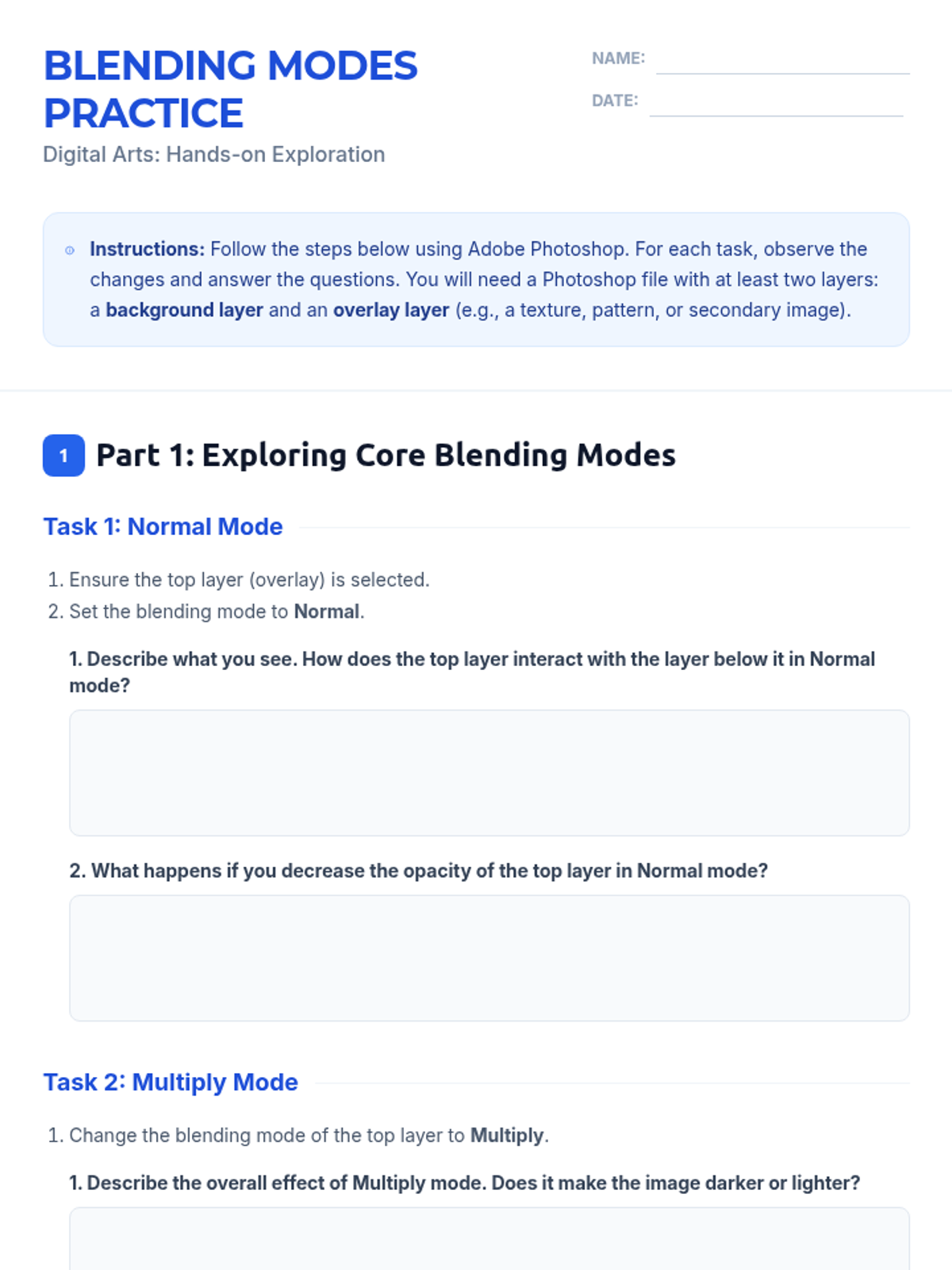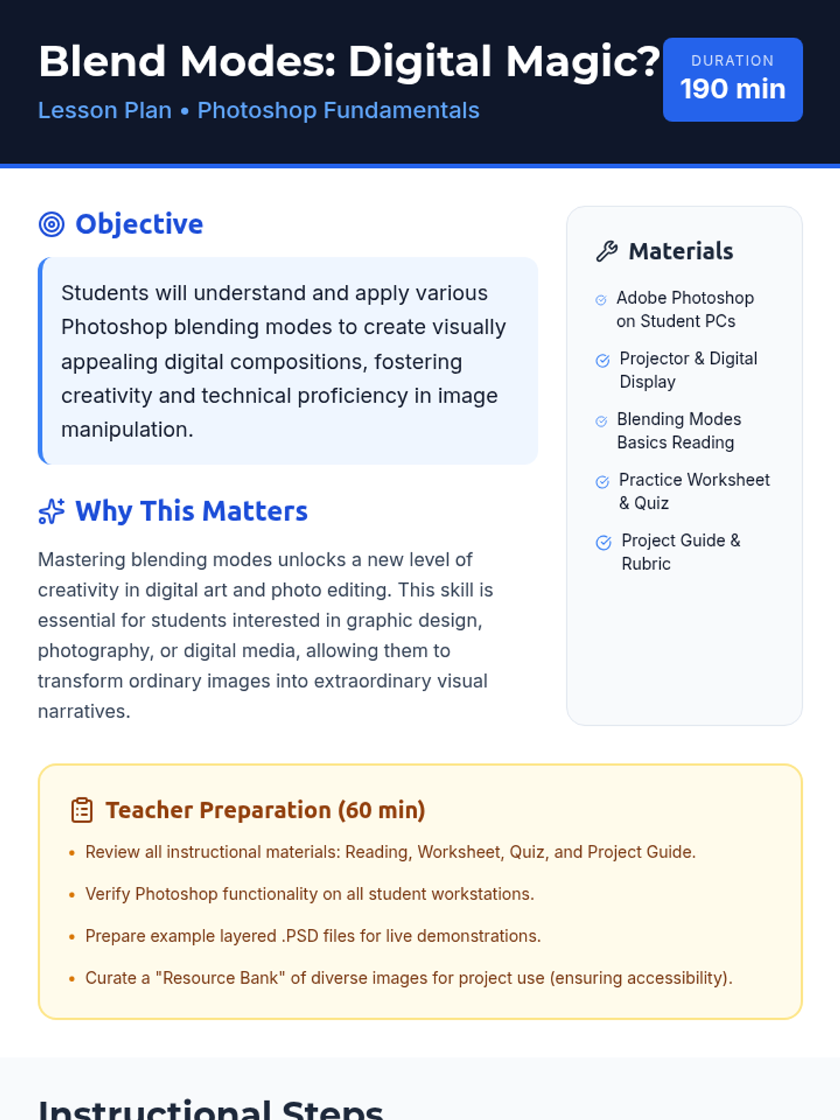 This lesson introduces 11th-grade neurodivergent students to the fundamental concepts of Photoshop blending modes. Students will learn how different blending modes affect image layers, enhancing their digital art and photo manipulation skills through hands-on exploration and a creative final project.