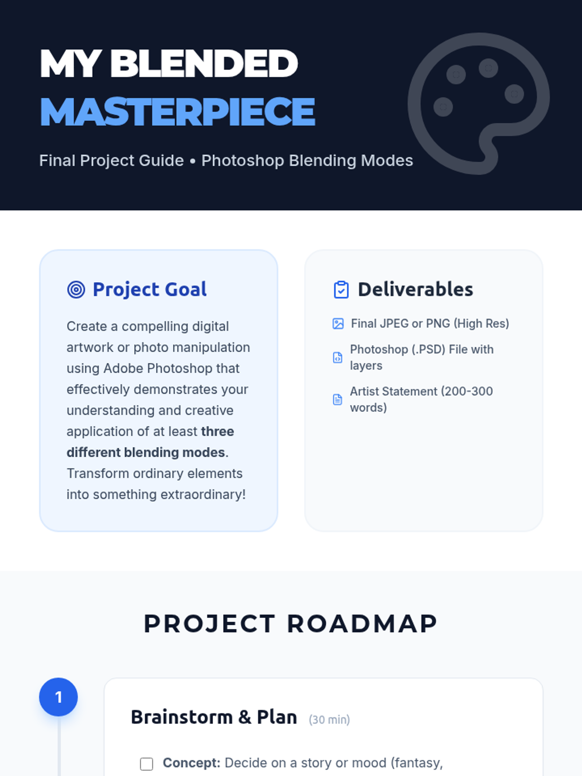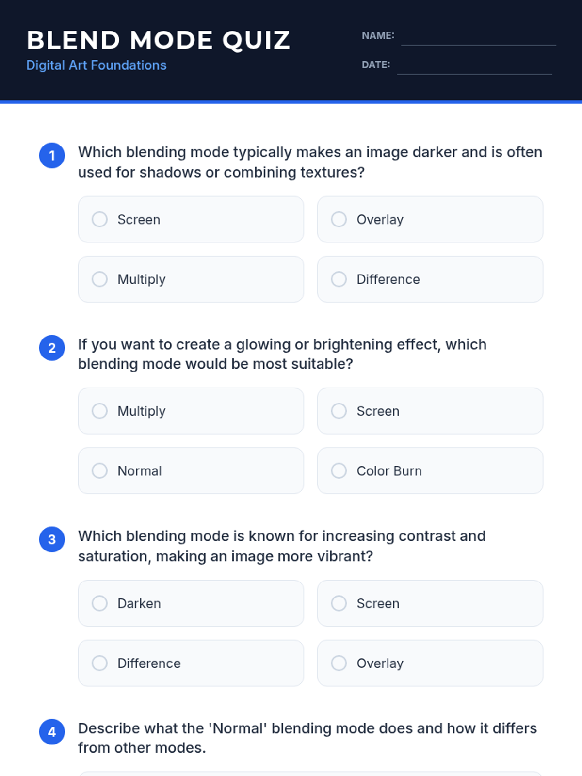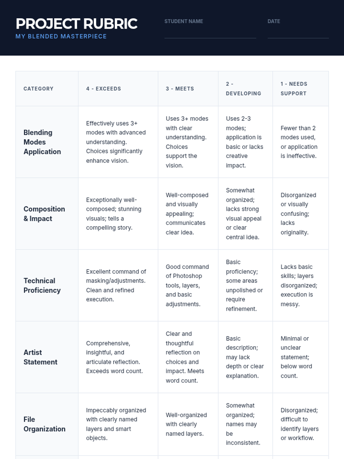 This lesson introduces 11th-grade neurodivergent students to the fundamental concepts of Photoshop blending modes. Students will learn how different blending modes affect image layers, enhancing their digital art and photo manipulation skills through hands-on exploration and a creative final project.