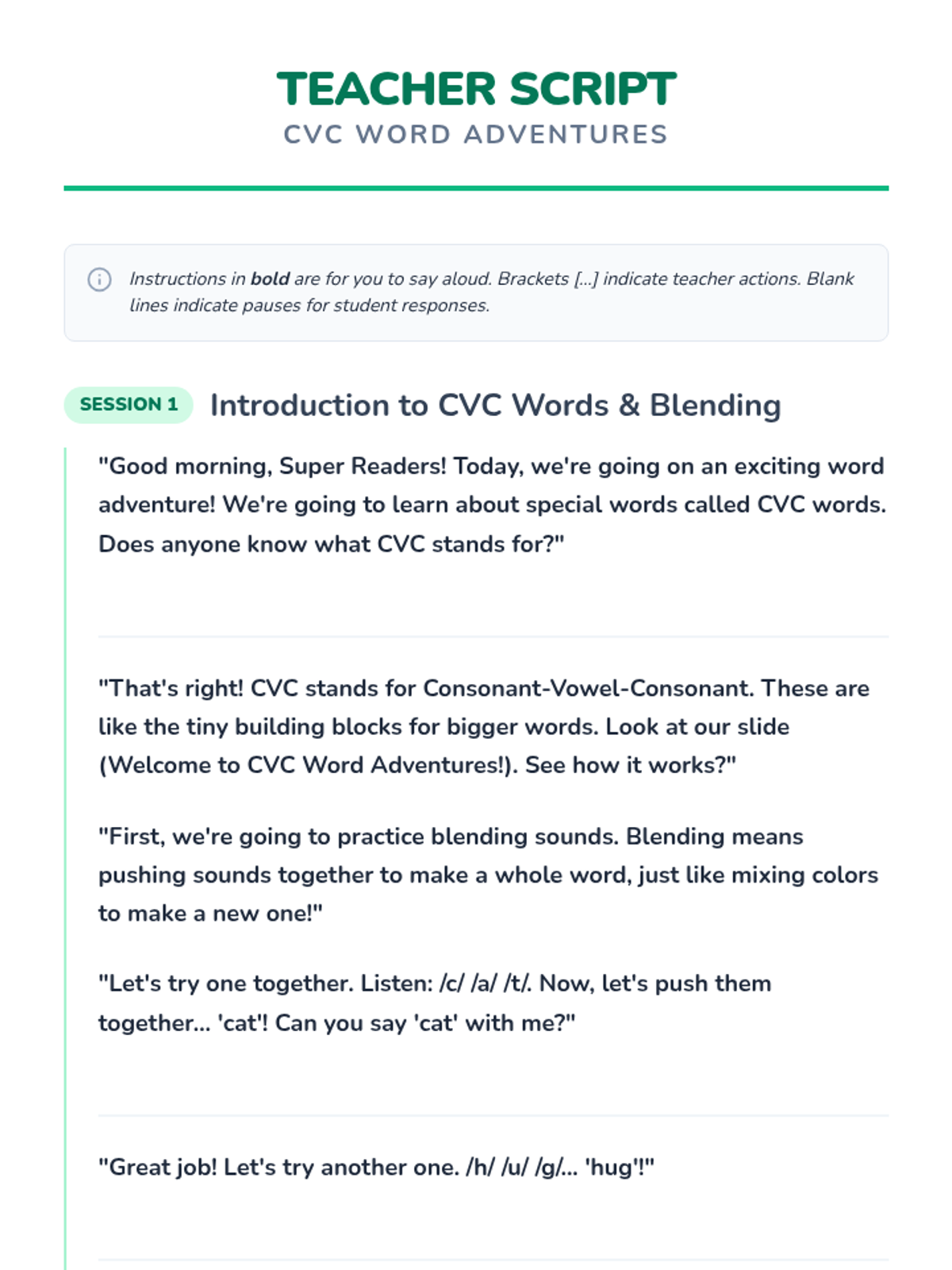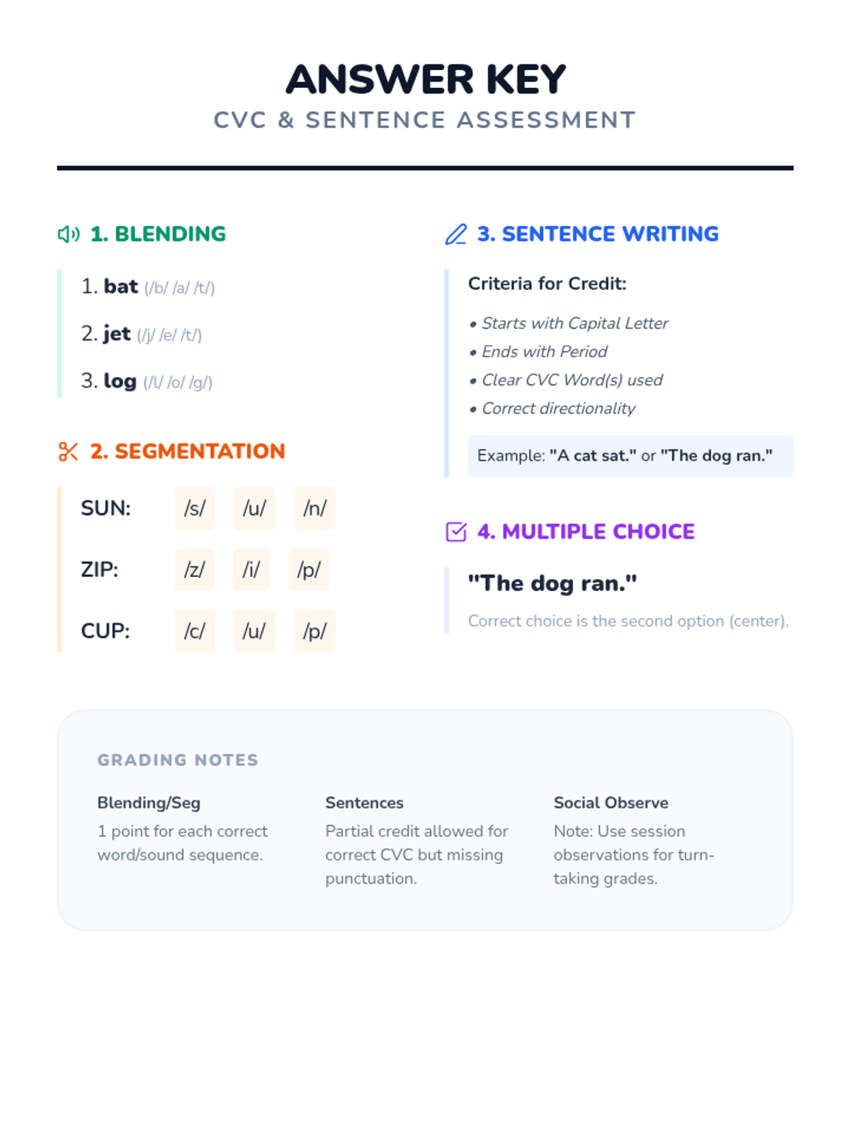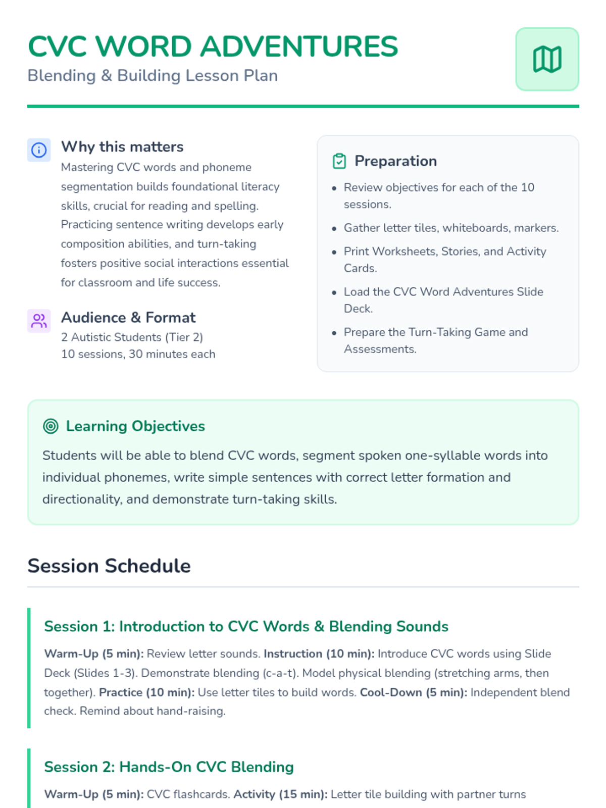 A comprehensive 10-session unit focused on mastering CVC words and introductory sentence writing through multi-sensory activities and social skill practice.