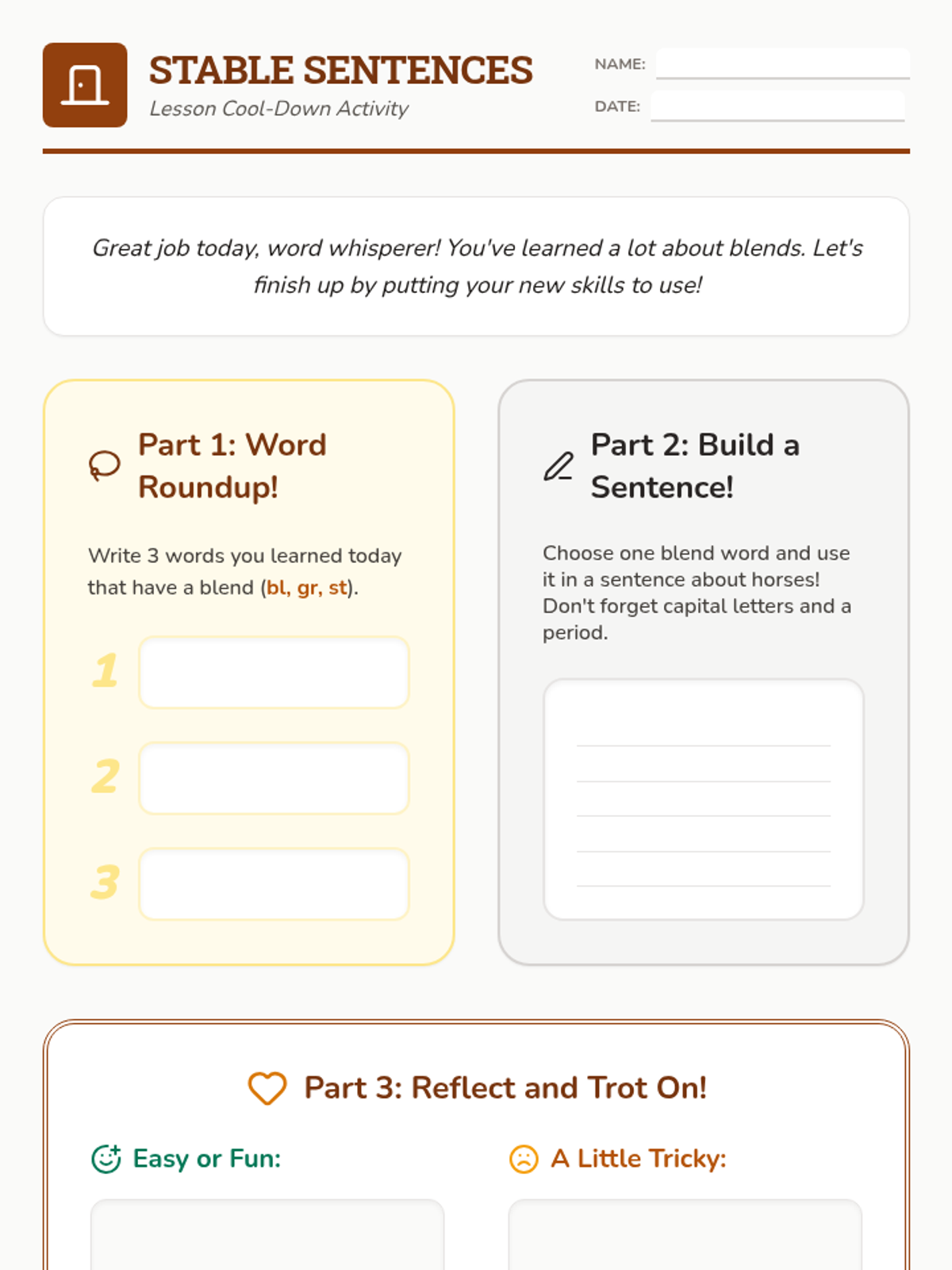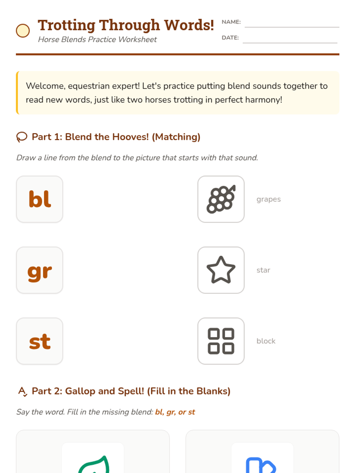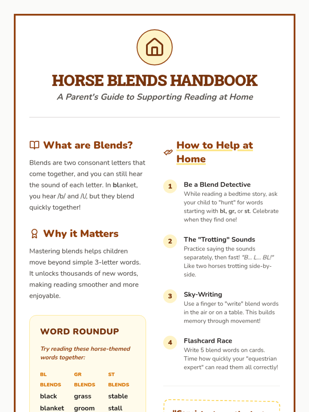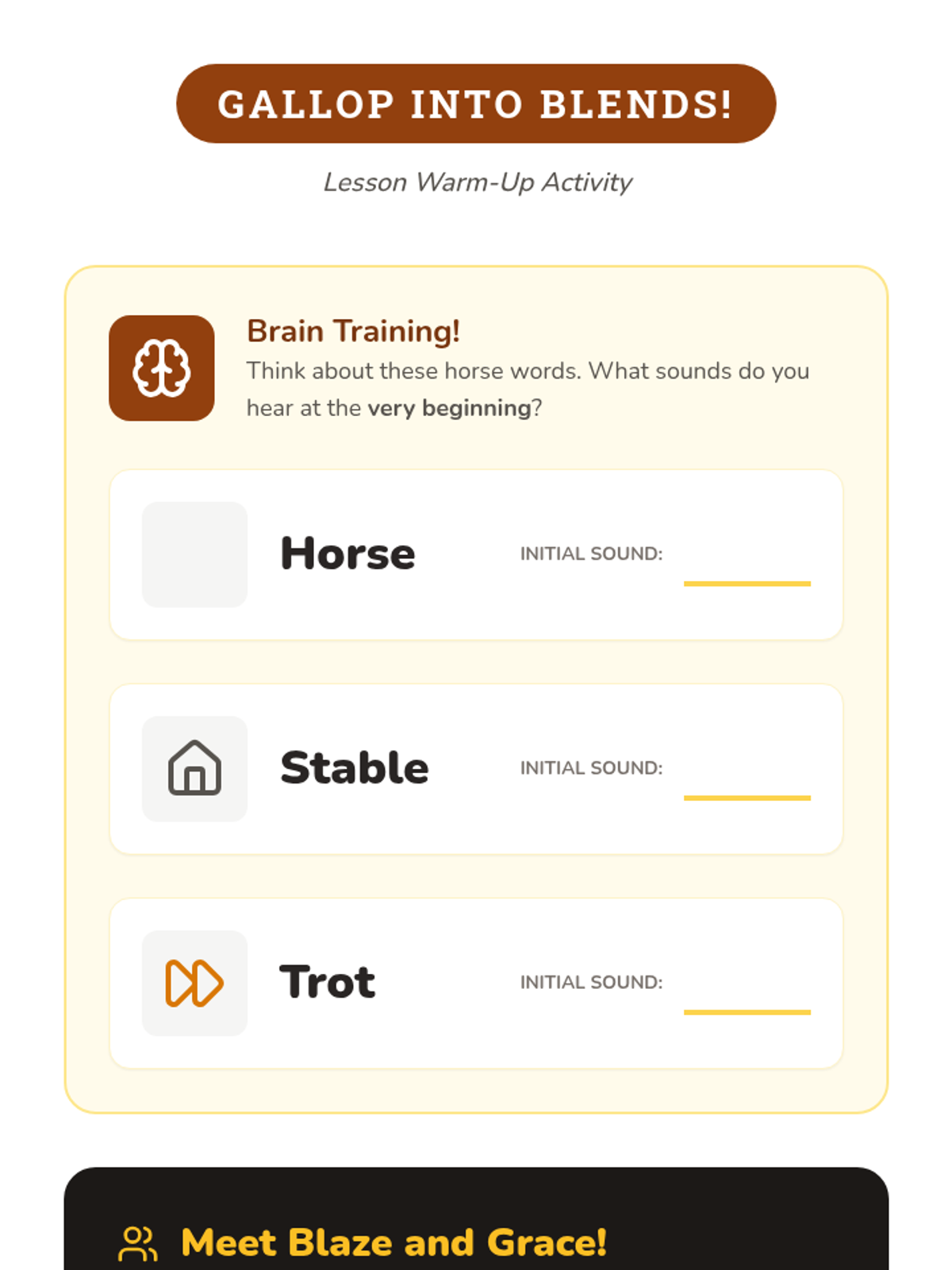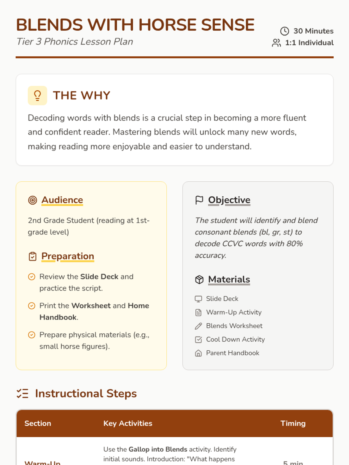 A 30-minute Tier 3 individual phonics lesson focusing on consonant blends (bl, gr, st) through a horse-themed narrative for 2nd graders reading at a 1st-grade level.