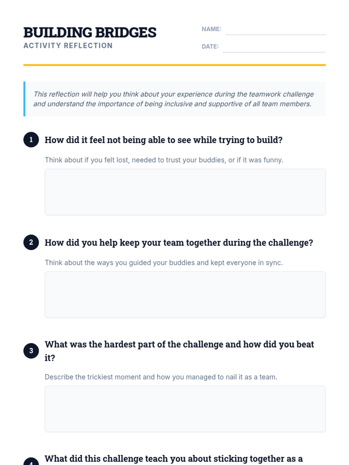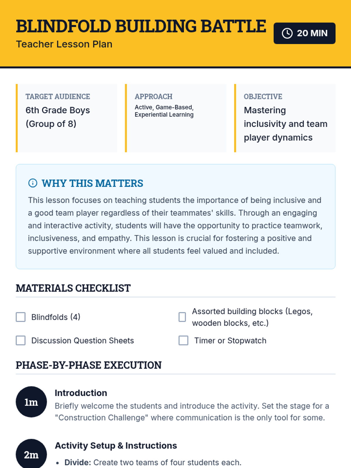 A high-energy, experiential lesson for sixth-grade students to practice inclusivity and teamwork through a collaborative building challenge. Students work in teams where some members are blindfolded, necessitating clear communication and empathy to succeed.