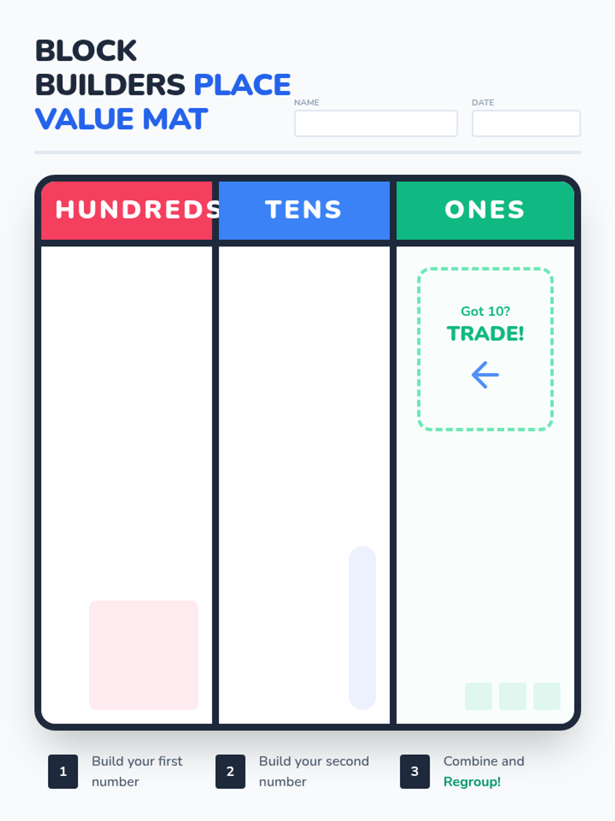 A foundational lesson on 3-digit addition focusing on composing (regrouping) across exactly one place value (either the ones or the tens). Students use a blueprint-themed packet to practice their architectural precision in mathematics.