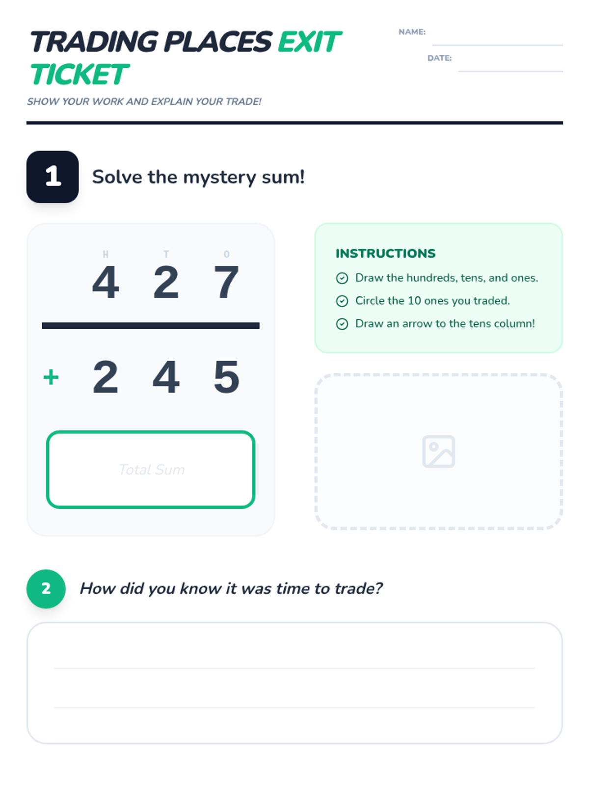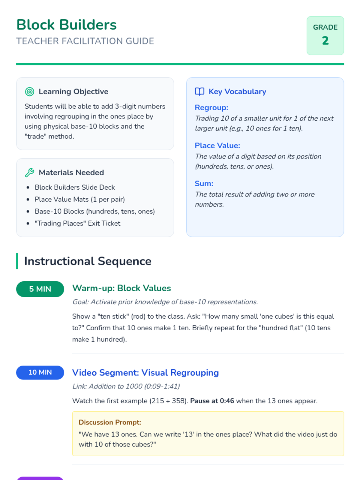 A 2-nd grade math lesson on 3-digit addition with regrouping. Students use base-10 blocks to visually and physically understand the process of trading 10 ones for 1 ten, supported by a video demonstration and hands-on activity.