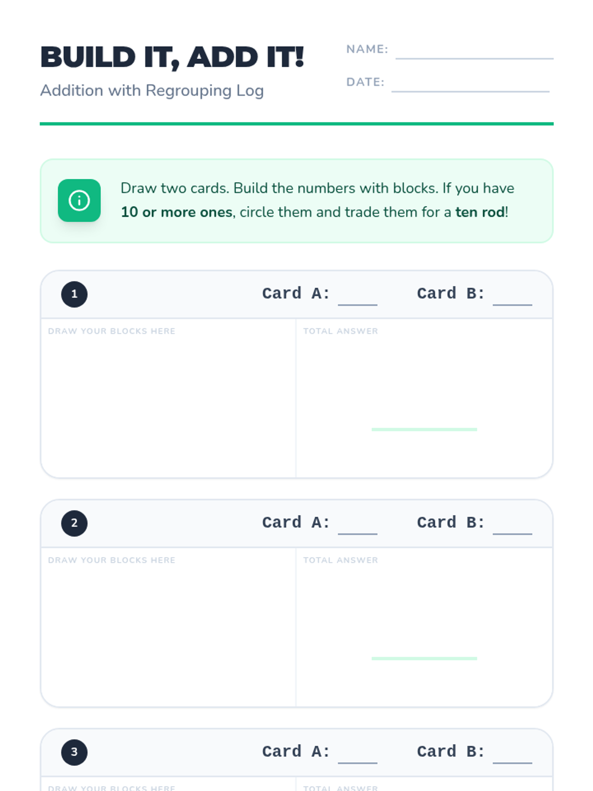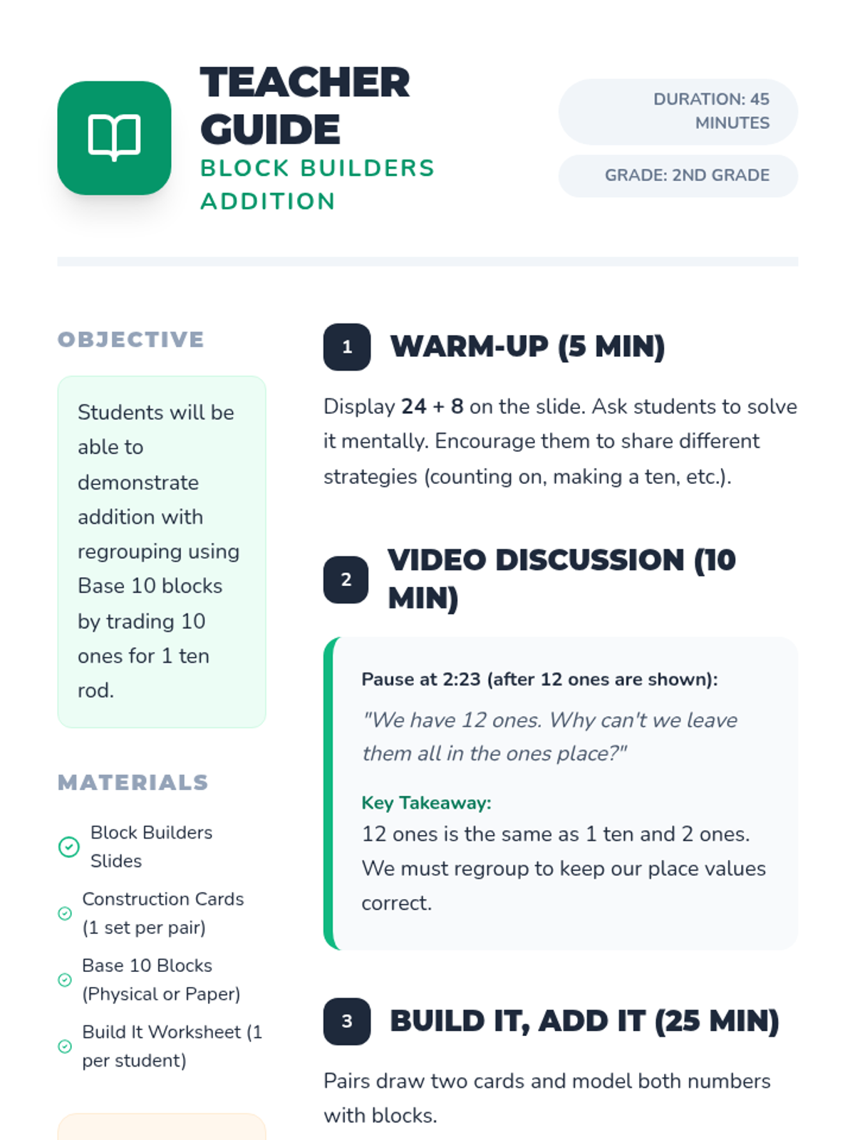 Students will learn and practice addition with regrouping for 2-digit numbers using visual Base 10 block models and physical manipulatives, culminating in a hands-on building activity.