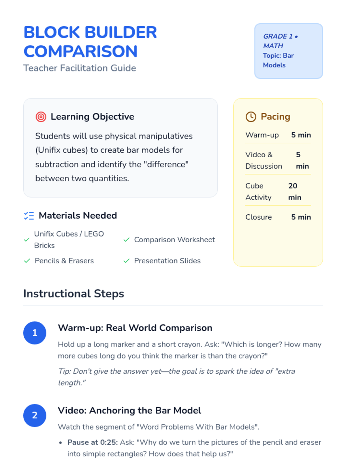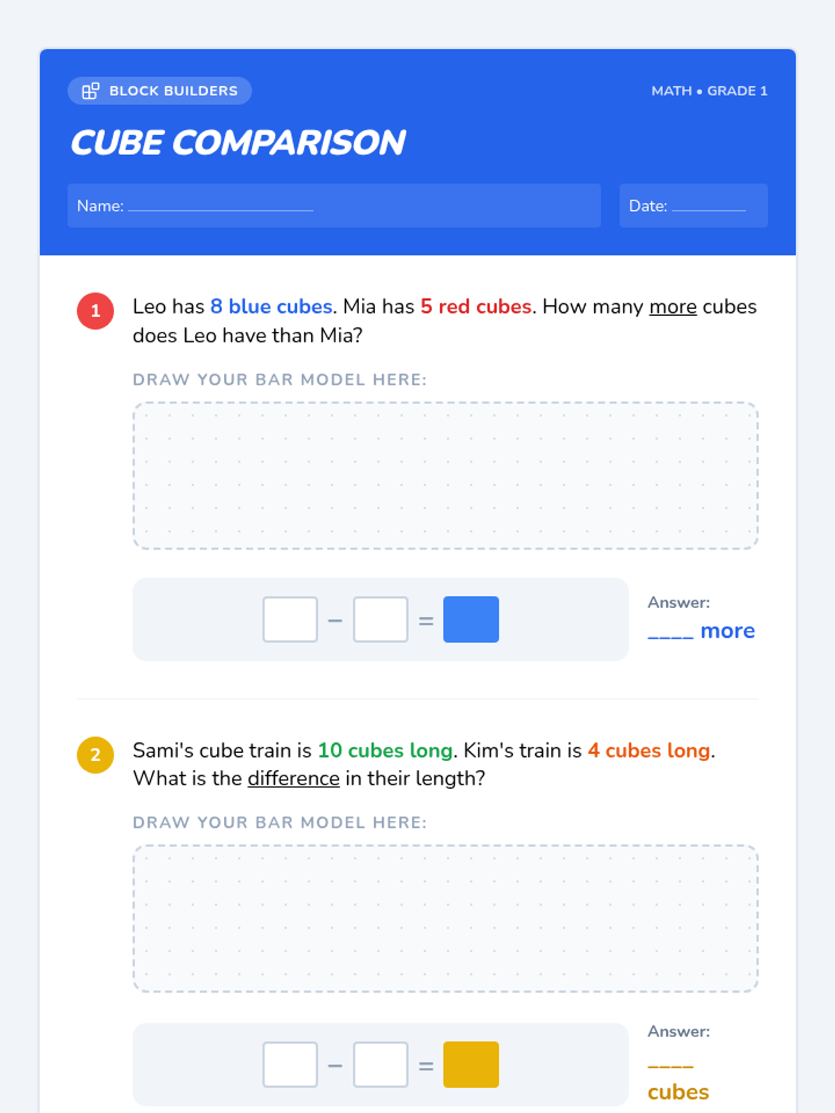 Students use Unifix cubes to build comparison models, transitioning from physical objects to abstract bar models for subtraction. This lesson uses a length-based video to anchor the concept of 'difference' as the missing space between two bars.