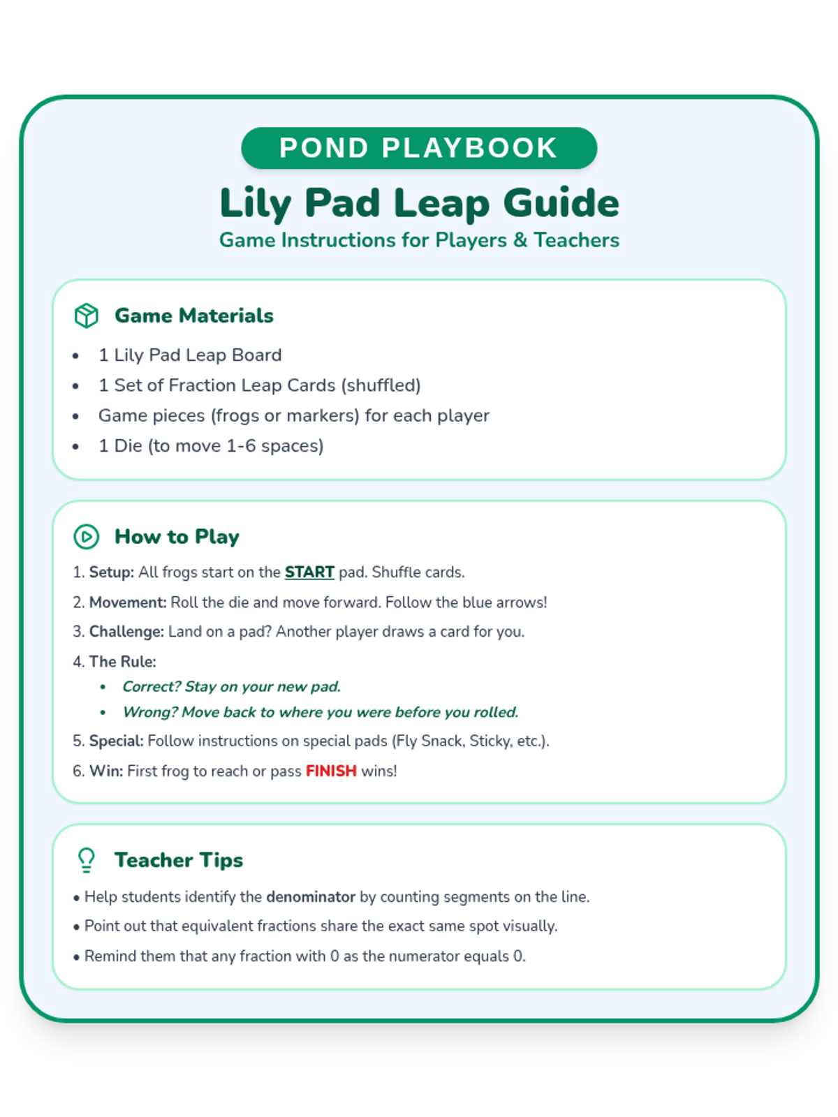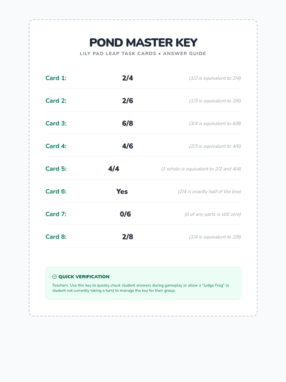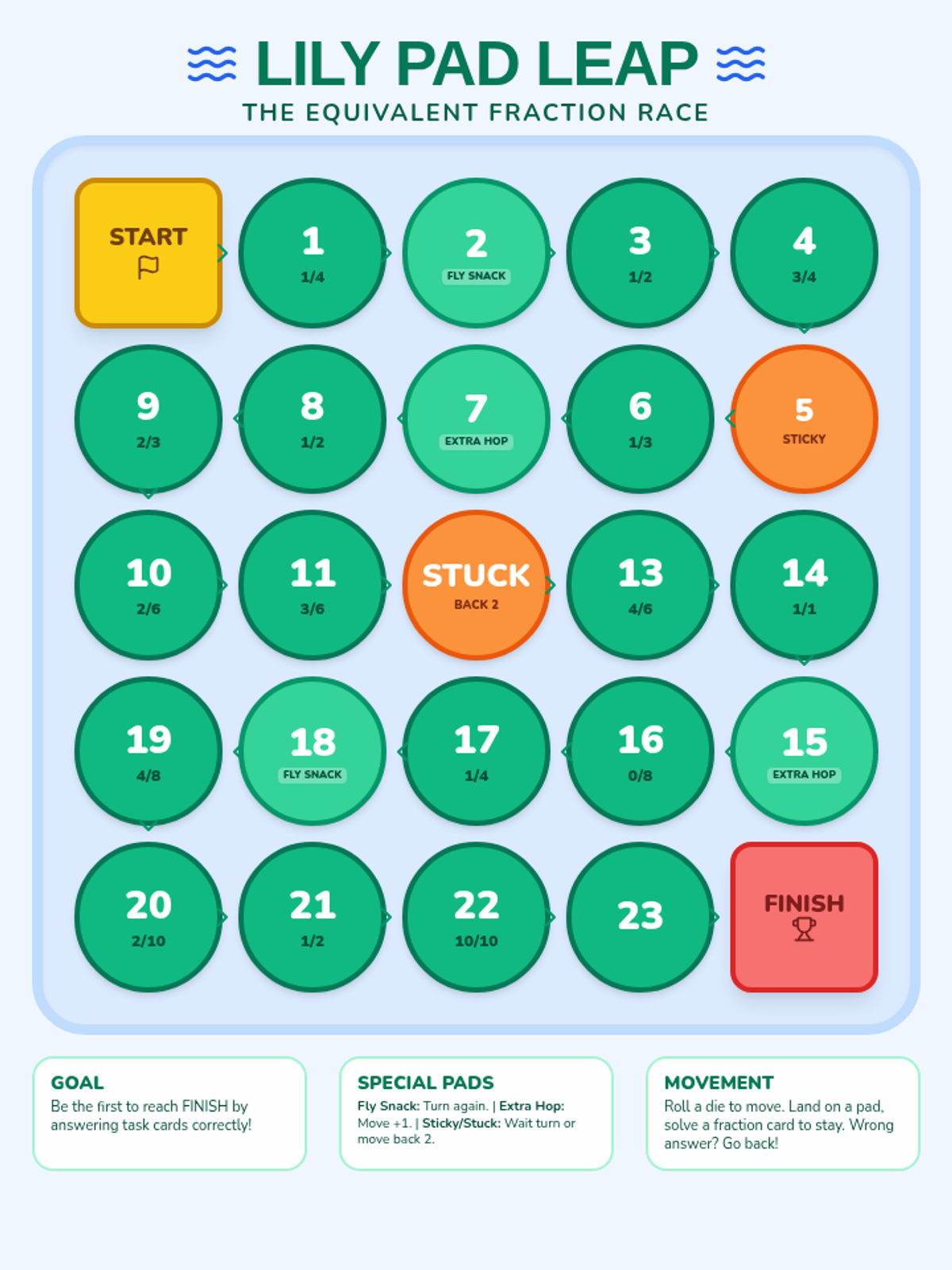 A fun, frog-themed board game and task card set designed to help third graders master equivalent fractions using number lines. Students navigate a pond-themed board by solving fraction challenges that require identifying and comparing points on number lines.
