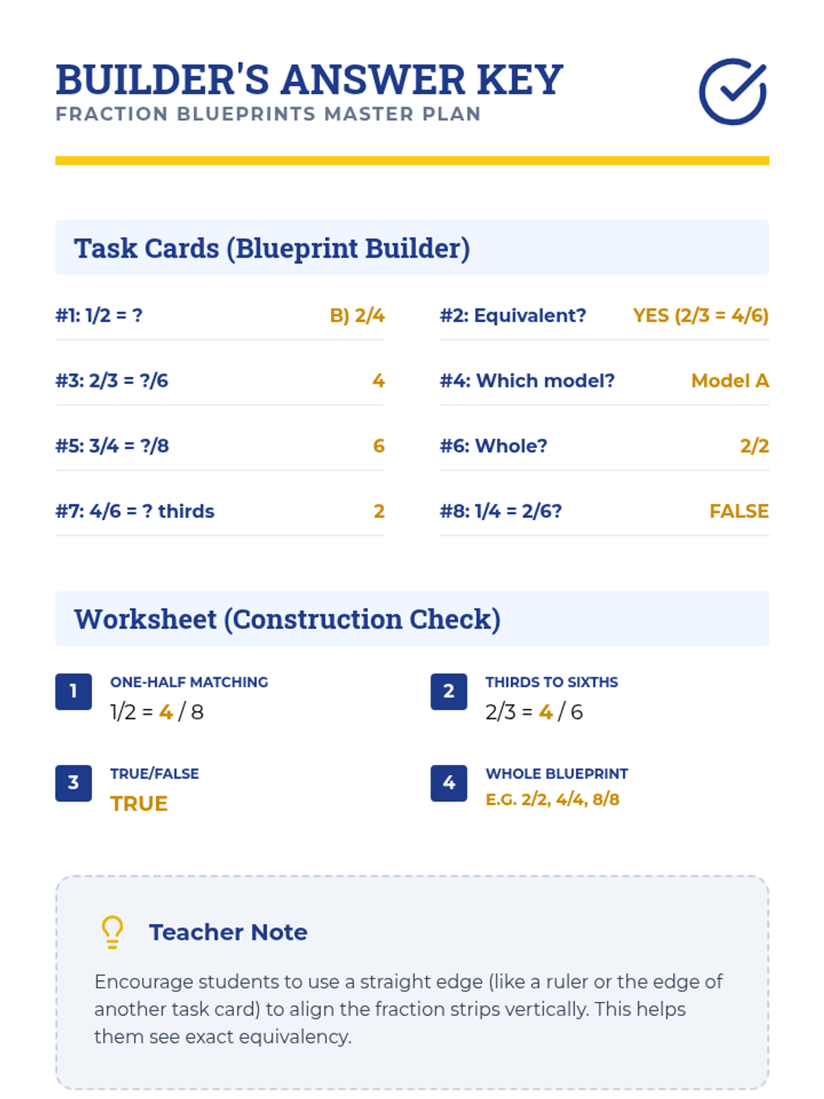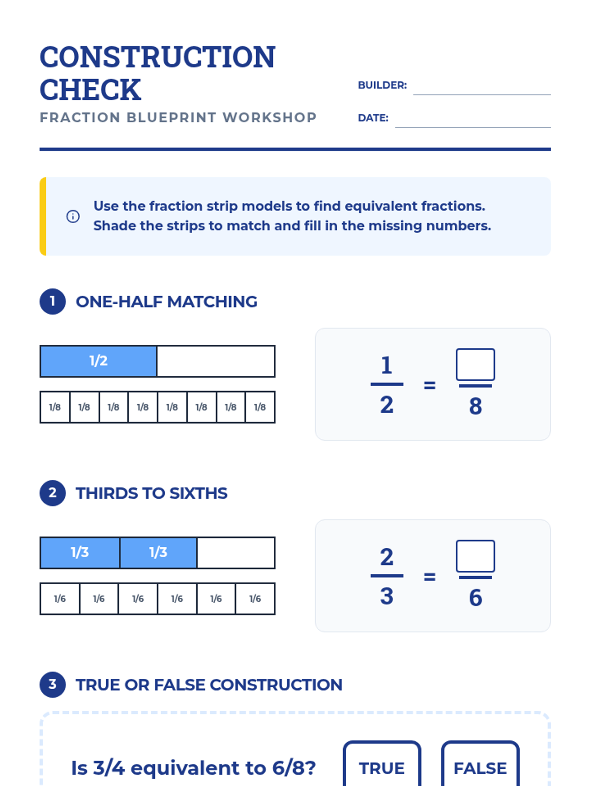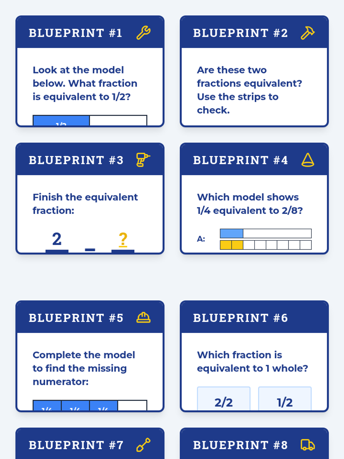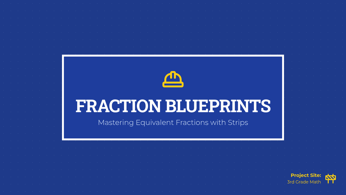 A lesson focusing on identifying and generating equivalent fractions using visual fraction strip models, styled with a fun blueprint and construction theme.