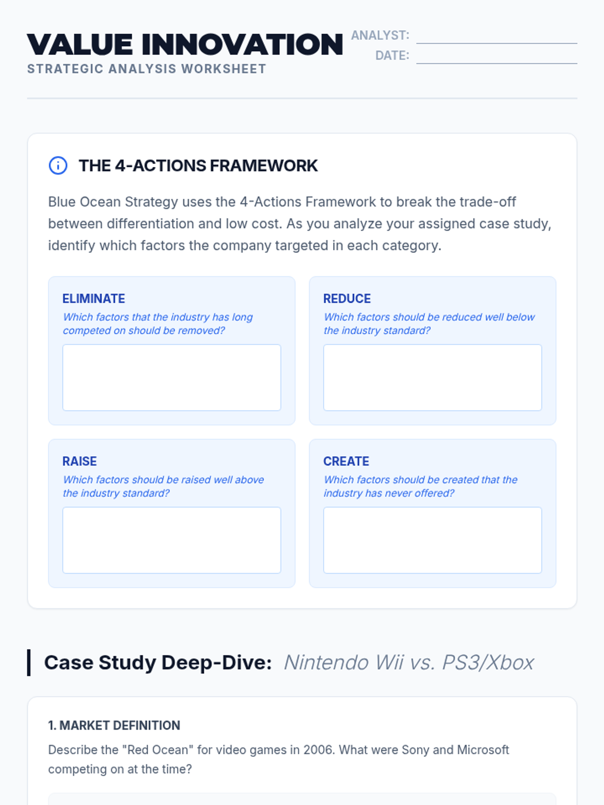 Students analyze case studies of companies that created entirely new market spaces, learning to identify 'value innovation' and strategic differentiation.